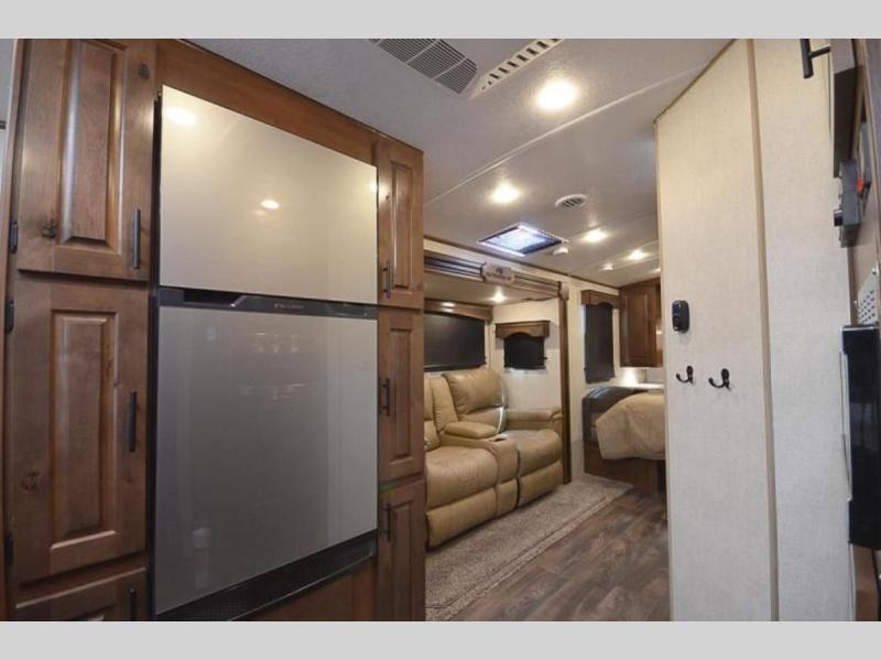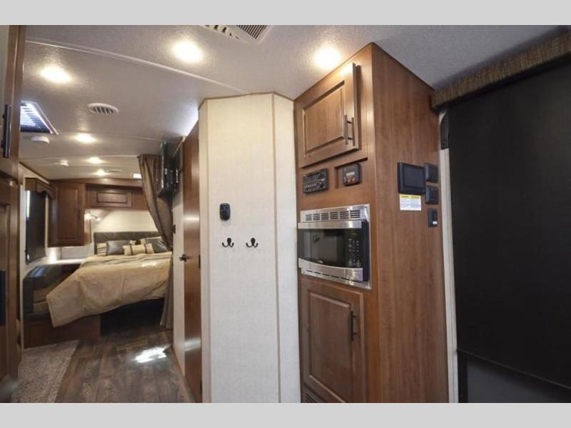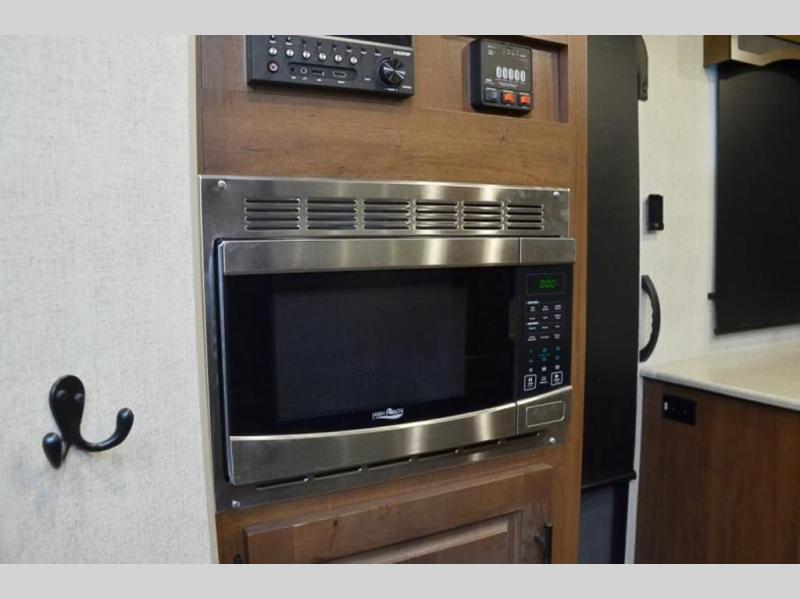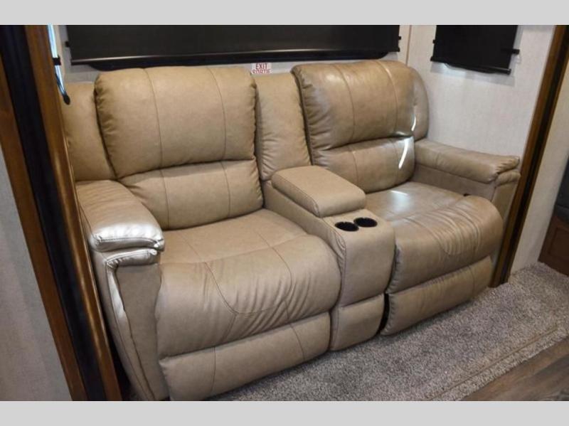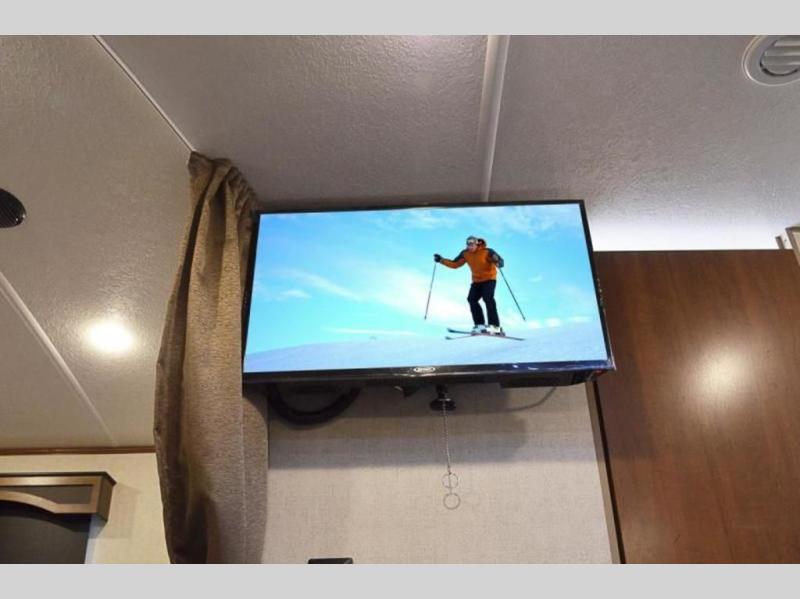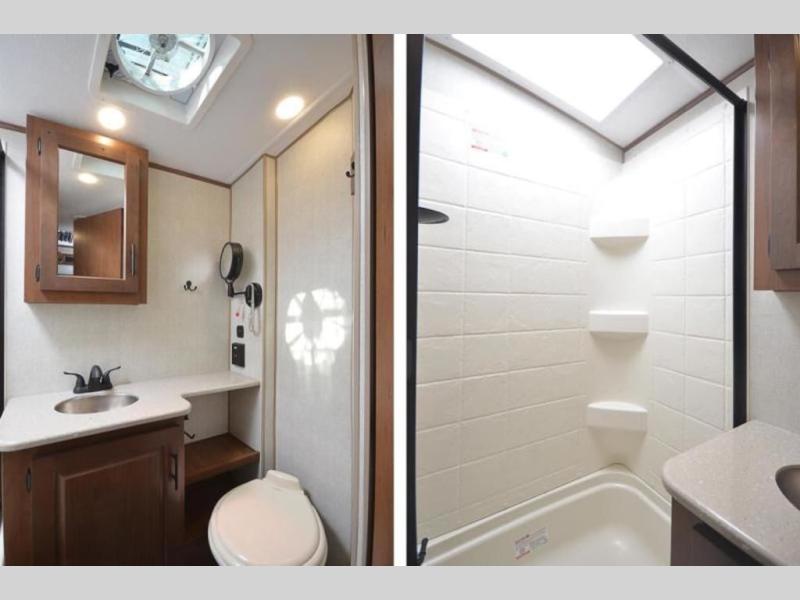 You're going to love this rear kitchen travel trailer with abundant counter space for cooking at-home meals. The 40" x 90" fold down table provides a place to dine or play games, and there is a swing-out 32" TV across from the residential sofa with built-in recliners slide for movie nights. A full bath on board lets you stay clean throughout your camping trips, and there is a bath skylight for natural lighting here as well. The front 60" x 80" queen wall bed can be pulled down when you're ready for a good night's rest after a fun day at the beach!