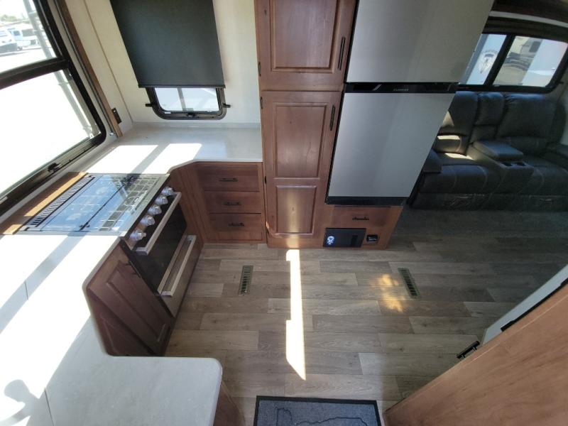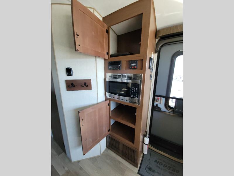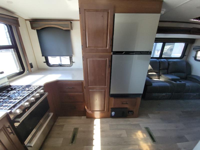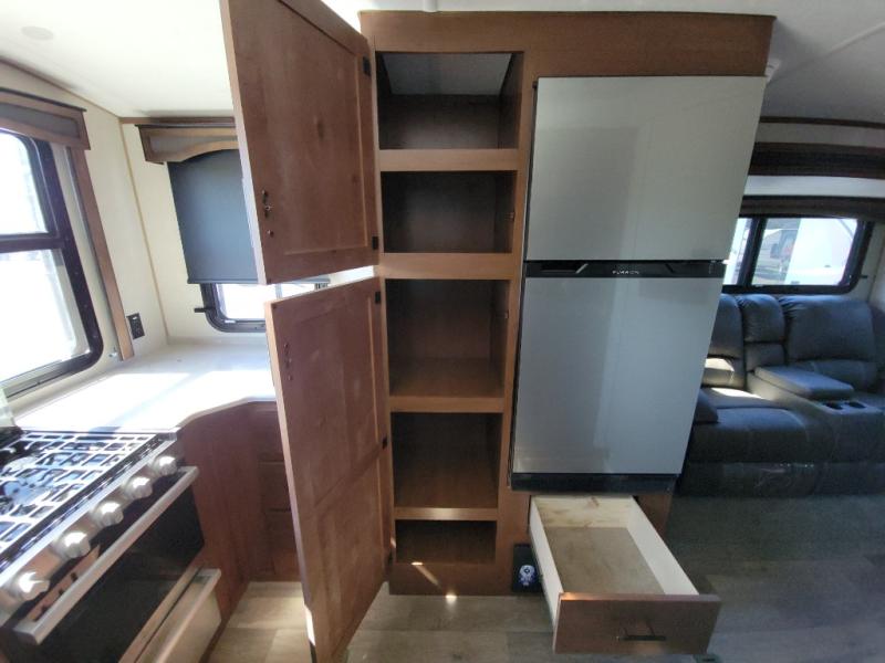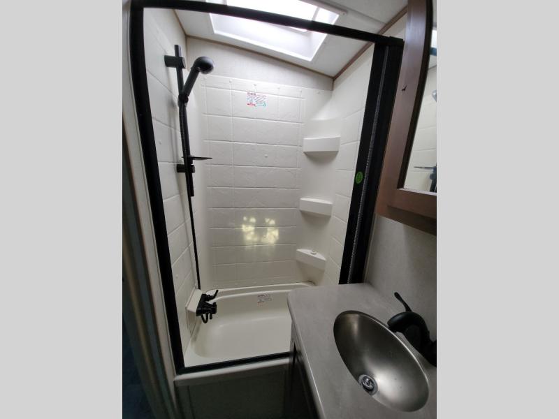 You're going to love this rear kitchen travel trailer with abundant counter space for cooking at-home meals. The 40" x 90" fold down table provides a place to dine or play games, and there is a swing-out 32" TV across from the residential sofa with built-in recliners slide for movie nights. A full bath on board lets you stay clean throughout your camping trips, and there is a bath skylight for natural lighting here as well. The front 60" x 80" queen wall bed can be pulled down when you're ready for a good night's rest after a fun day at the beach!