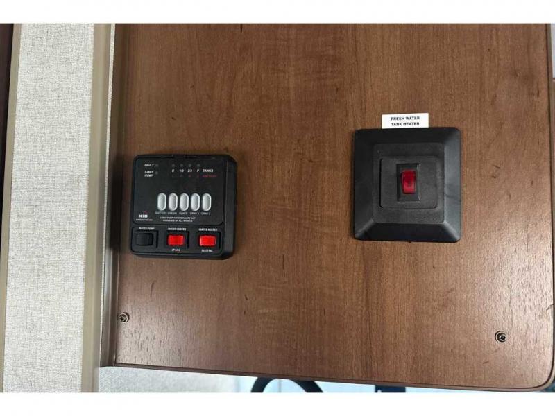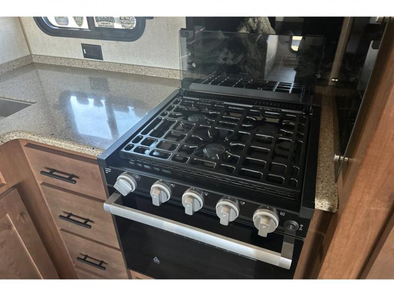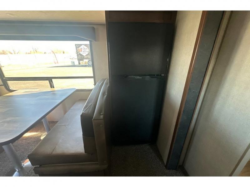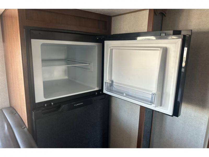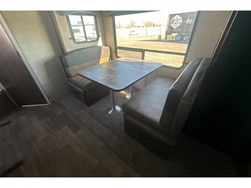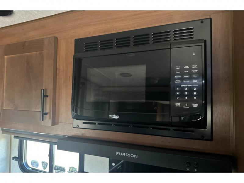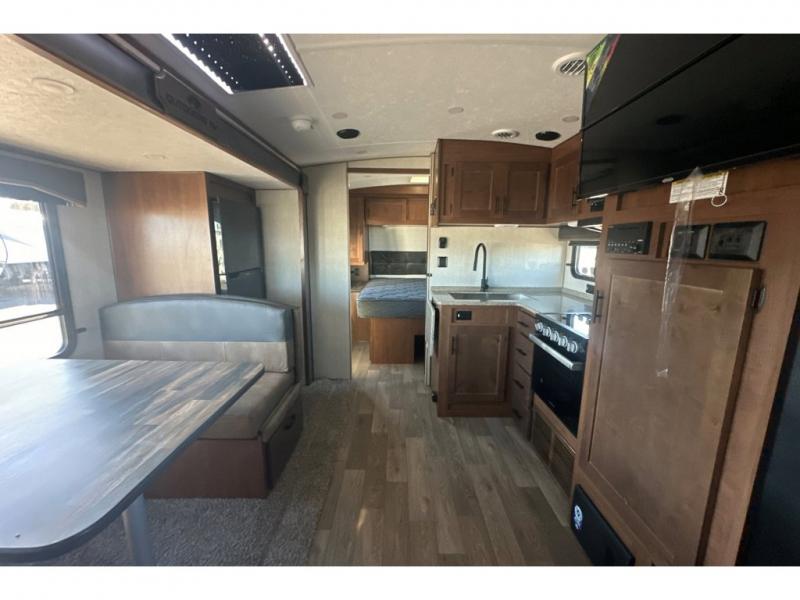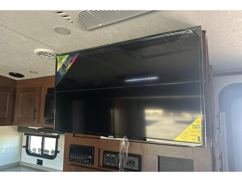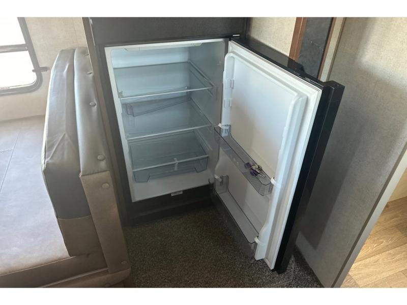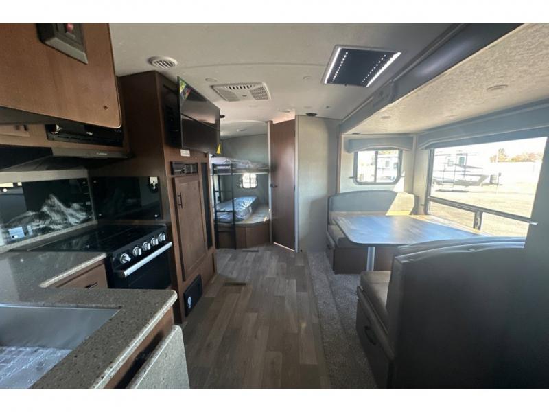 How does double-size bunks sound for your next camping trip? The kids or your guests are sure to love them, while you enjoy the queen bed in the front bedroom. There is a garage storage door that will be perfect for luggage, lawn chairs, and coolers, plus there is plenty of storage inside as well. The chef of your group will love cooking in the kitchen with its flip-up counter, three burner cooktop, and skylight for natural light. The mountain dinette slide in the main living area will provide space to let the dog rest on the floor, and there is a 40" TV for movie night!