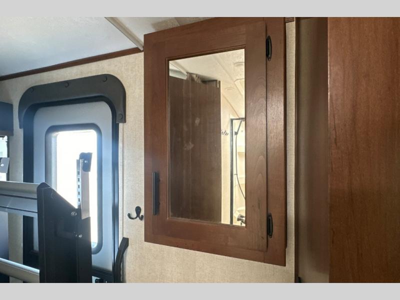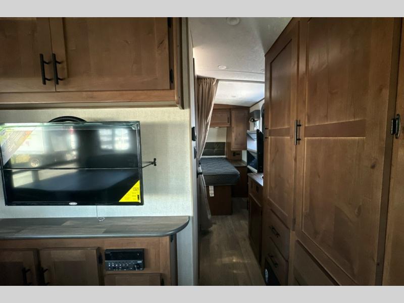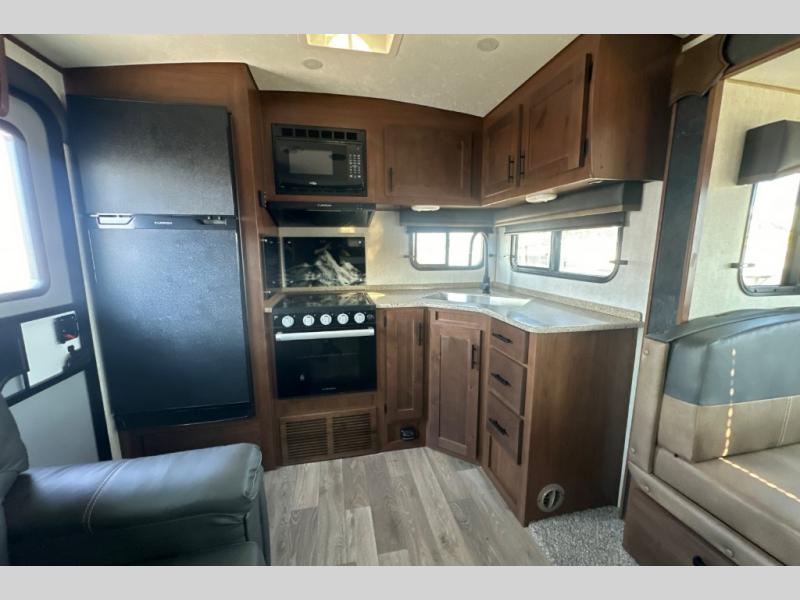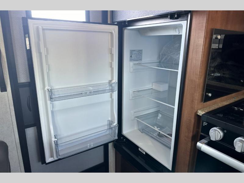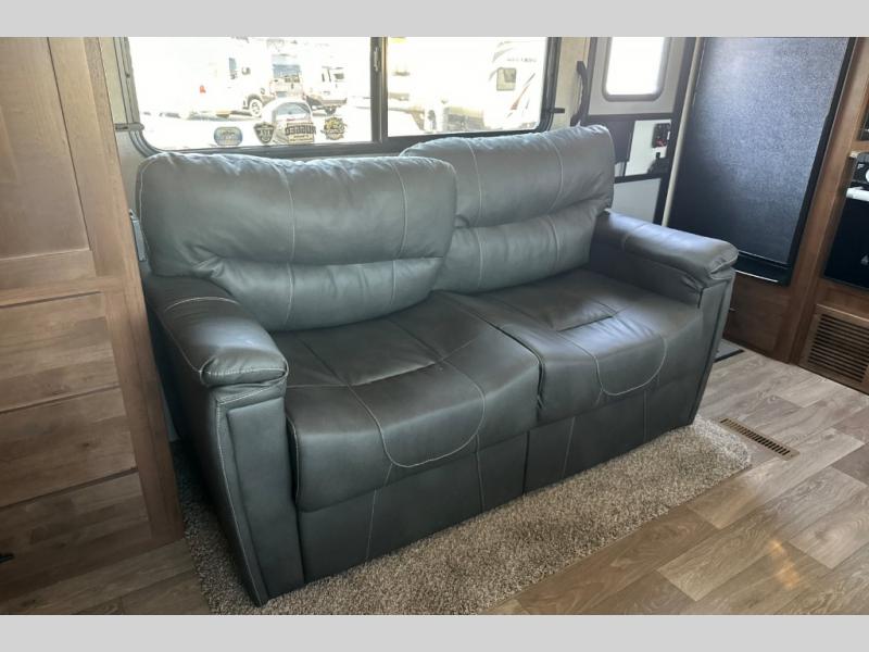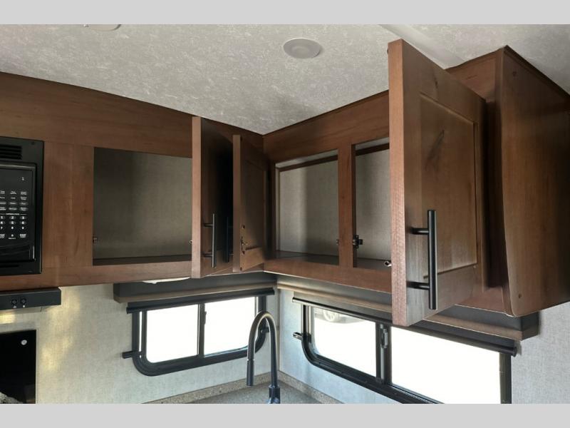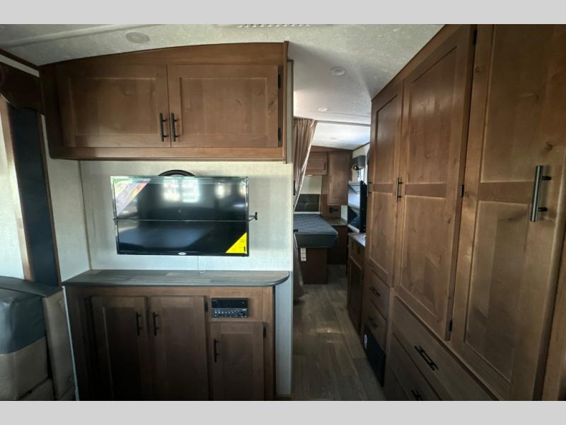 Dual entry doors in this travel trailer will allow you to enter in through the rear kitchen, or in the front bedroom for convenience. You will love having a queen bed to sleep on and dual bedroom wardrobes to keep your clothes wrinkle-free. Get cleaned up in the full bath that includes a shower skylight, then head to the rear kitchen to prepare breakfast on the three burner cooktop. Your crew can sit at the mountain dinette slide or relax on the sleeper sofa before heading out for the day. This model also includes a large wardrobe with drawers and a pantry for tons of storage space.