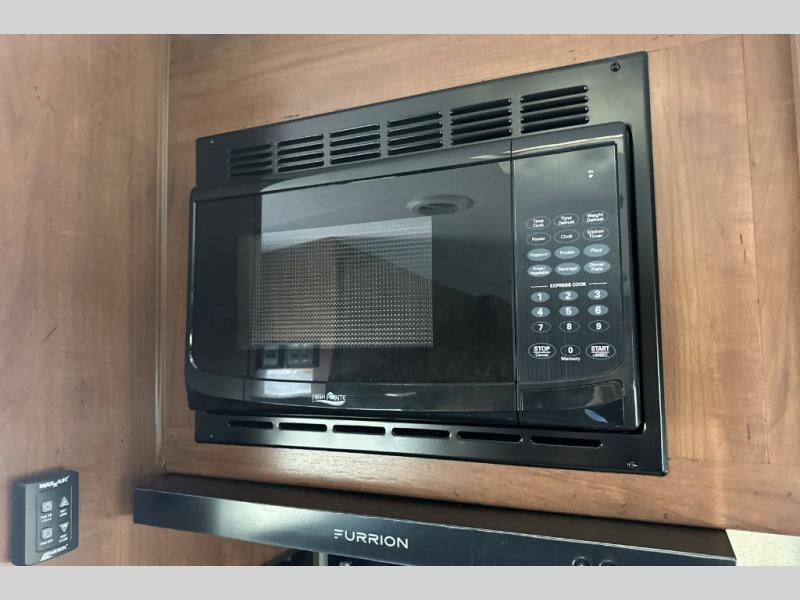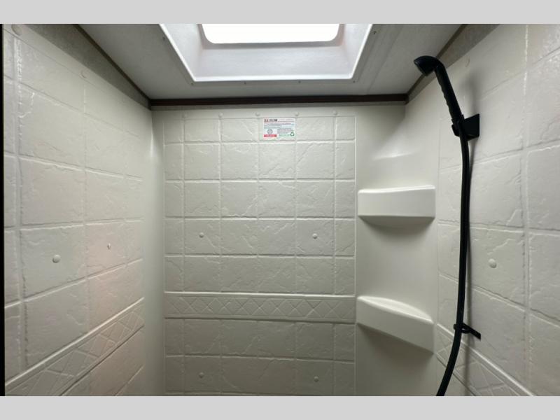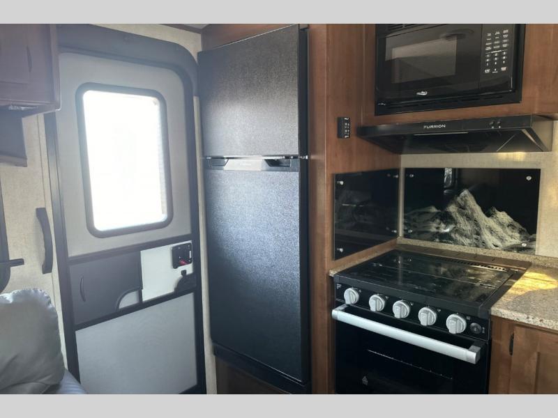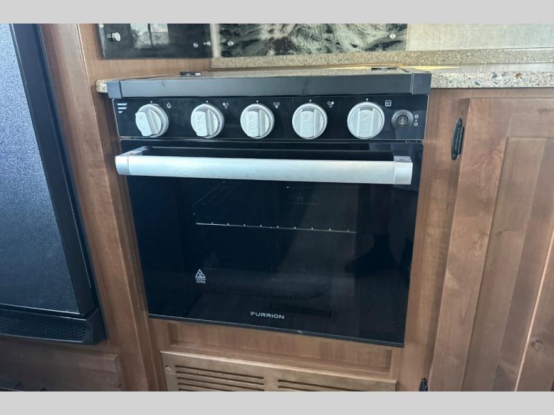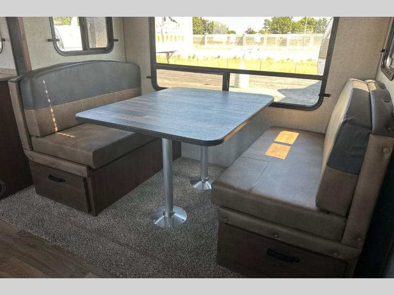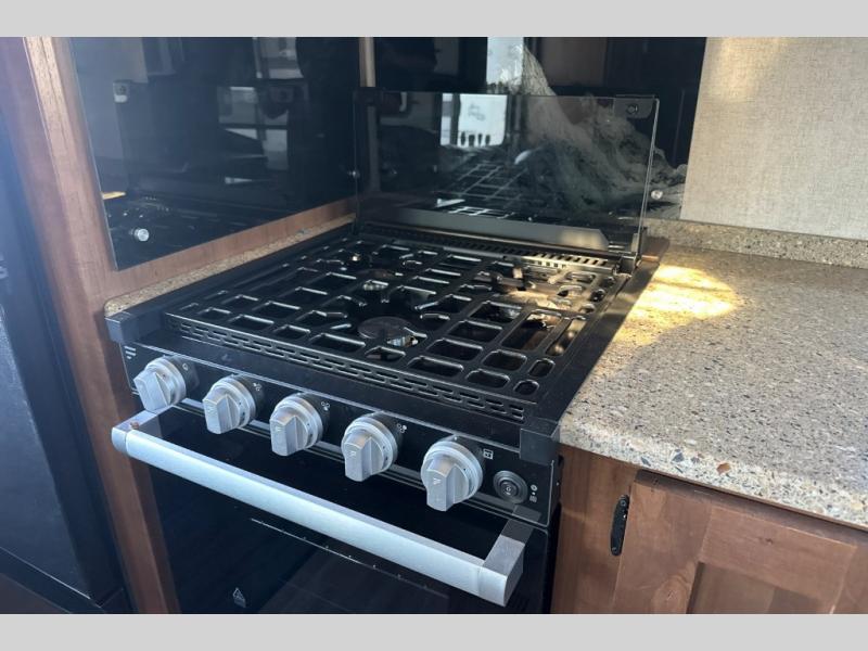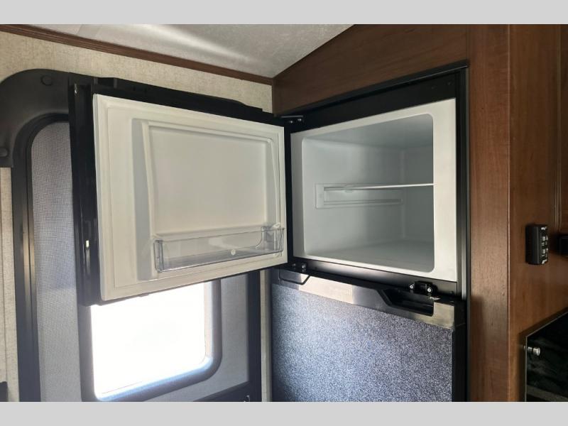 Dual entry doors in this travel trailer will allow you to enter in through the rear kitchen, or in the front bedroom for convenience. You will love having a queen bed to sleep on and dual bedroom wardrobes to keep your clothes wrinkle-free. Get cleaned up in the full bath that includes a shower skylight, then head to the rear kitchen to prepare breakfast on the three burner cooktop. Your crew can sit at the mountain dinette slide or relax on the sleeper sofa before heading out for the day. This model also includes a large wardrobe with drawers and a pantry for tons of storage space.
