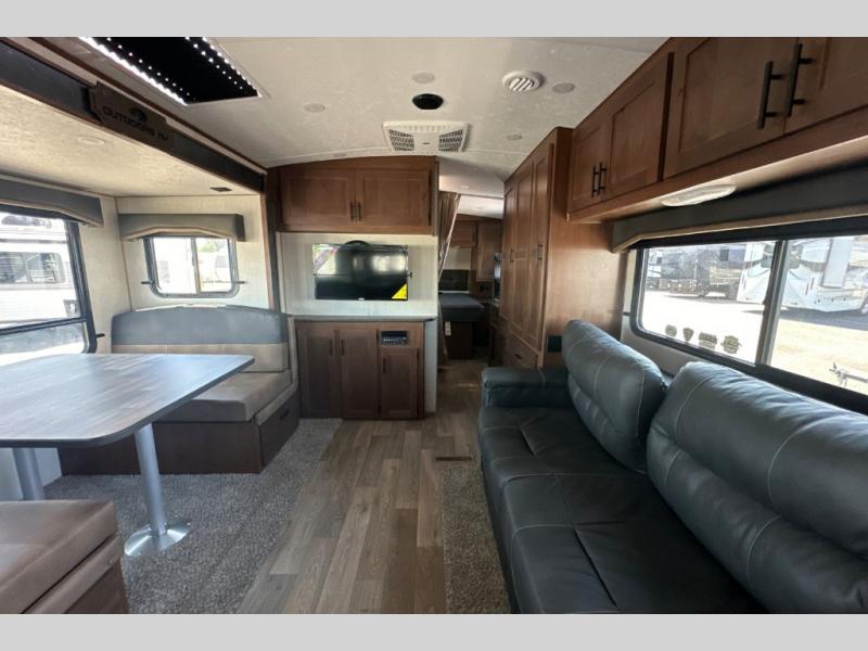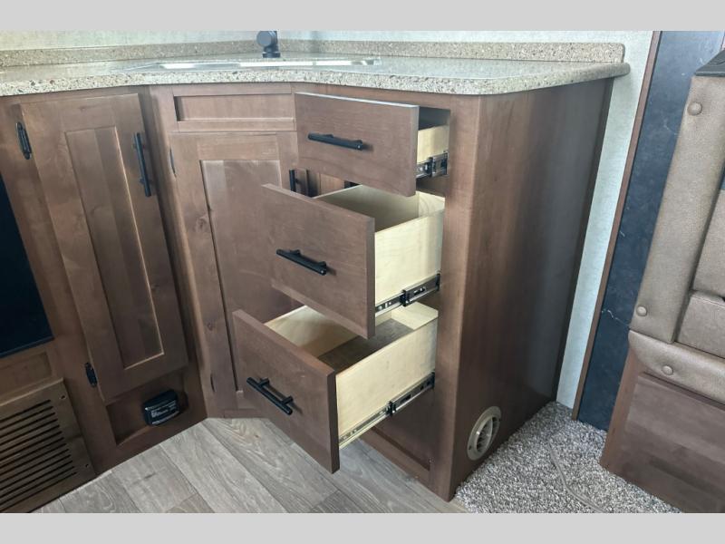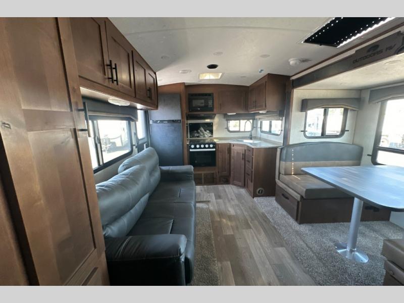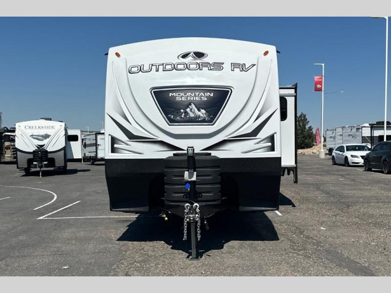 With any Timber Ridge Mountain Series travel trailer by Outdoors RV you will enjoy climate designed four seasons camping thanks to the thermal pane windows and the fully enclosed, heated, and insulated underbelly. The custom built chassis and rugged integrated A-frame are built for strength and durability, along with the rugged 2" bonded aluminum frame walls. Each model includes LG solid surface countertops, granite designed backsplash, vaulted radius ceilings, and a mountain comfort premium mattress for all-around comfort. You will also love the XL panoramic slide out windows and the dual pane living room skylight with a shade to let natural light in!