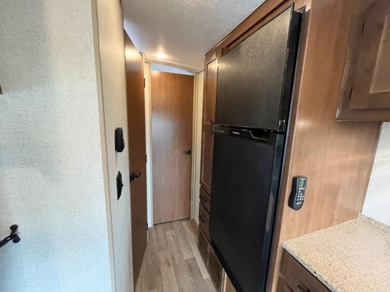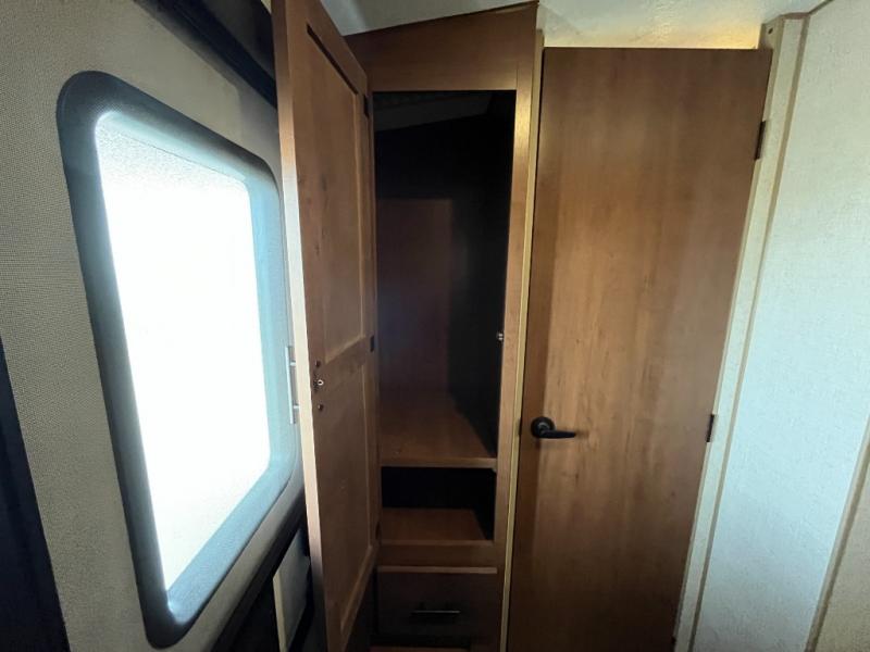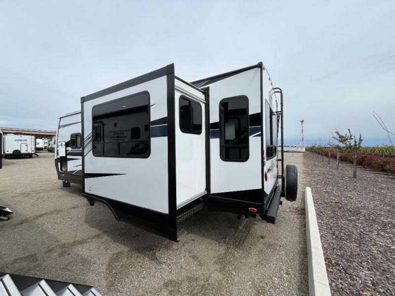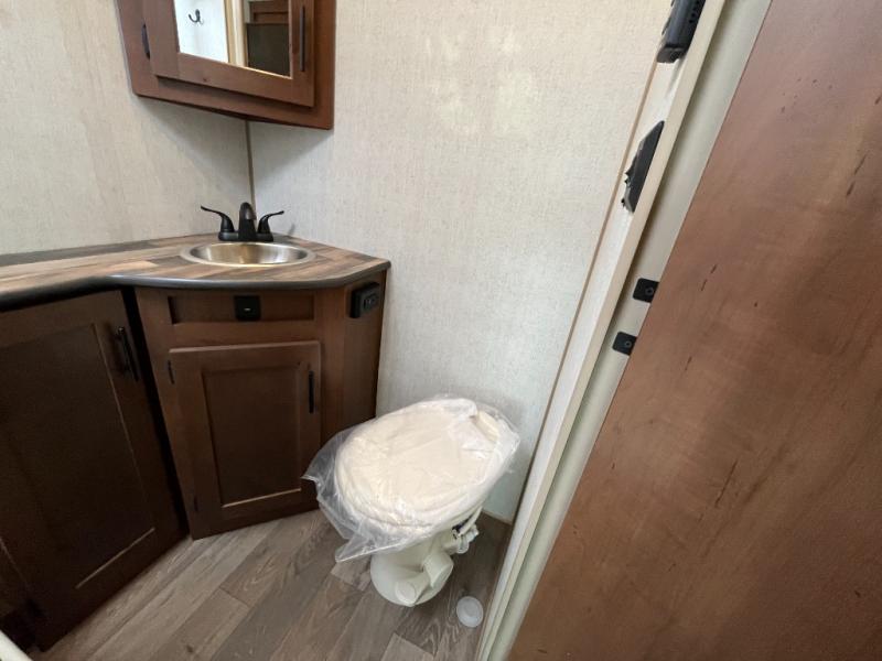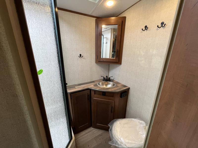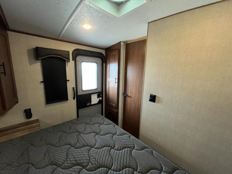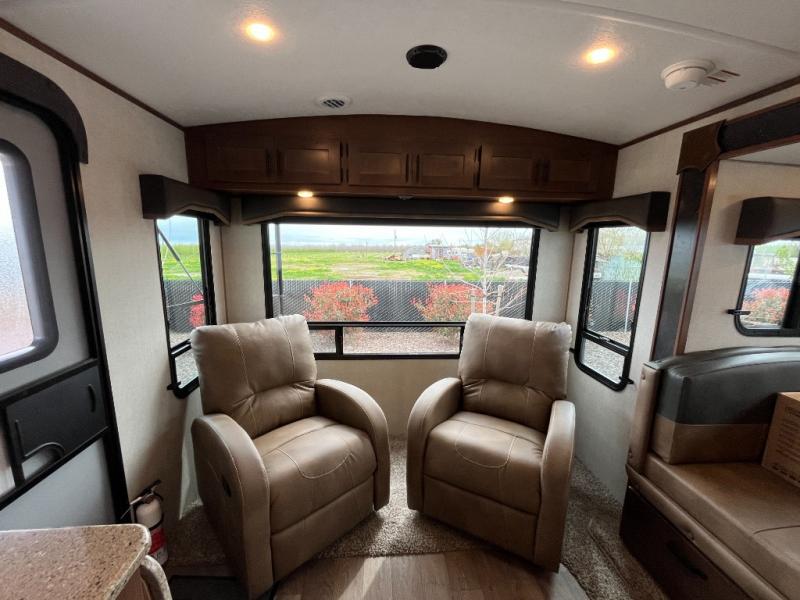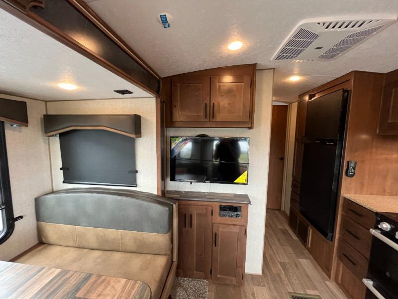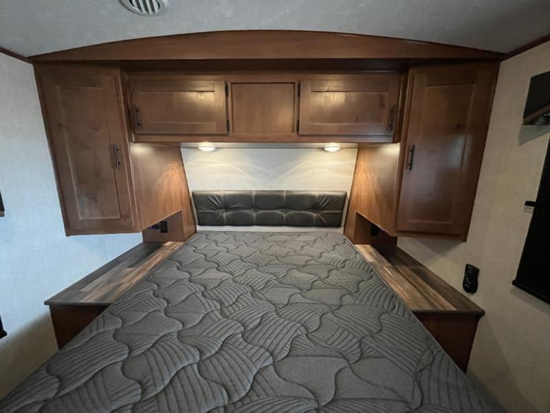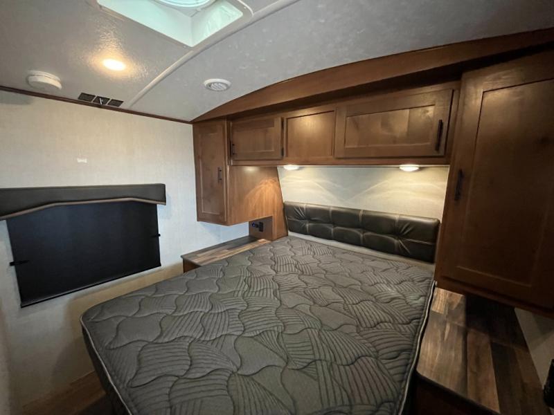 Head out to your favorite campsite in this roomy couple's trailer. There are dual entry doors, allowing you to enter in through the rear living area, or the front private bedroom. You can relax on the dual recliners after you've unpacked and maybe watch a show on the swing-out 32" TV. Once lunch is prepared on the three burner cooktop, you can dine at the mountain dinette with a skylight, or head outdoors to sit under the 21' awning. The queen bed is sure to bring comfort in the front bedroom, and if you have an overnight guest, they can sleep on the dinette!