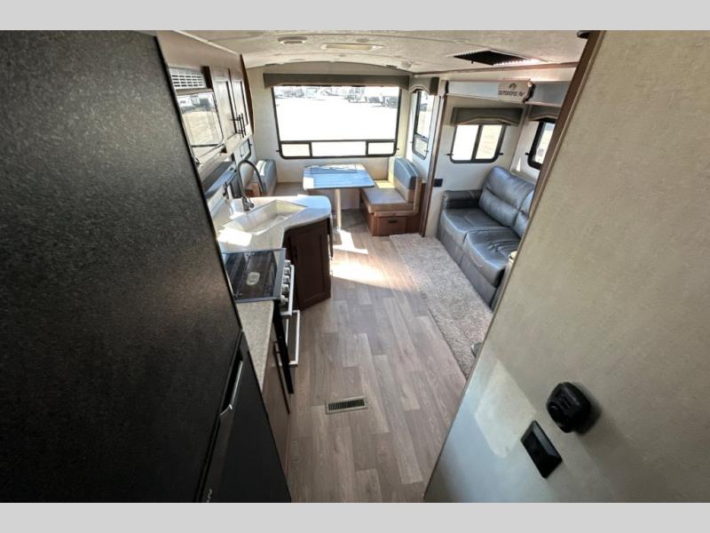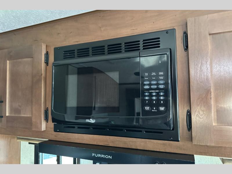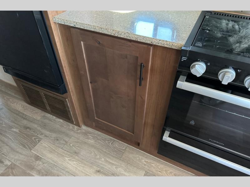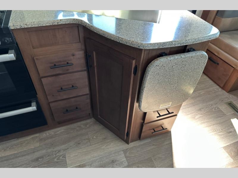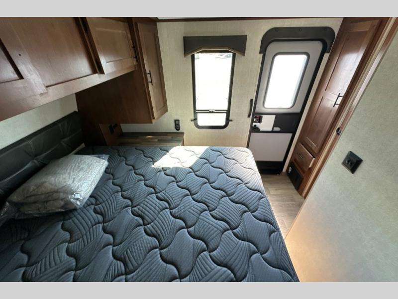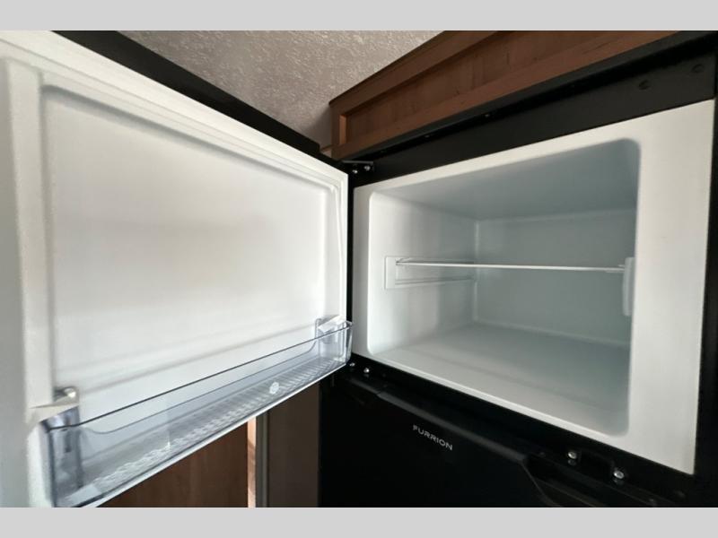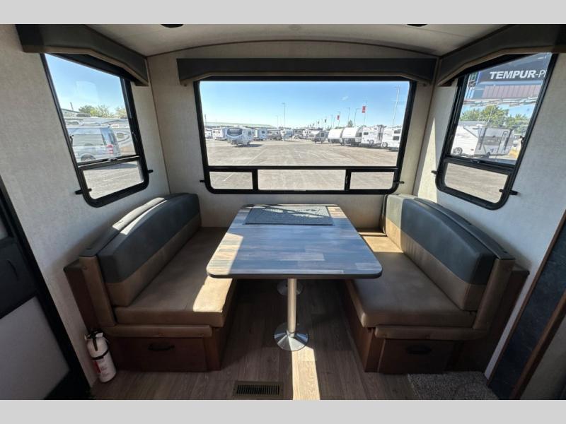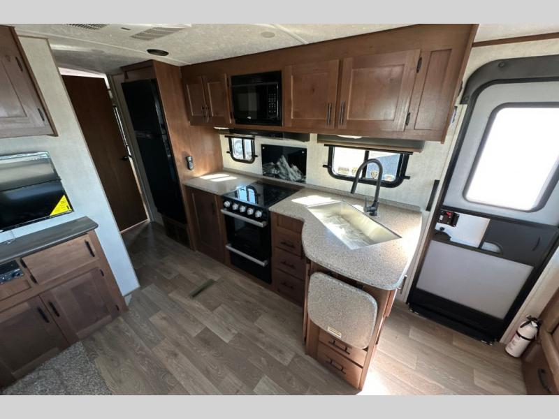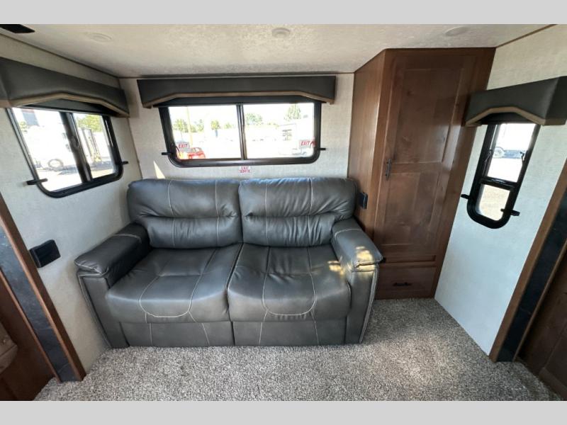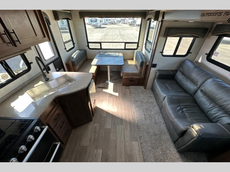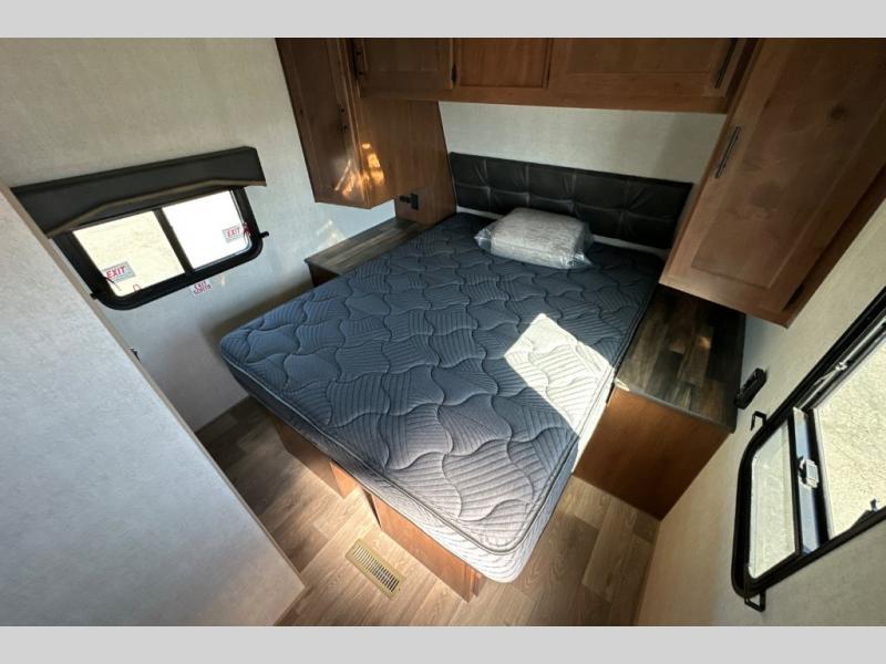 From the rear mountain dinette to the front private bedroom, you will love everything about this travel trailer. Use the flip-up counter in the kitchen for more prep space as you cook lunch, and the refrigerator will come in handy for your perishables. A sleeper sofa slide out will provide comfortable seating and sleeping space, or you may want to choose the optional residential sofa with built-in recliners. A full bath with a skylight ensures you won't have to use the camp's facilities, and a queen bed in the bedroom will provide a great night's rest!