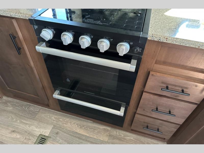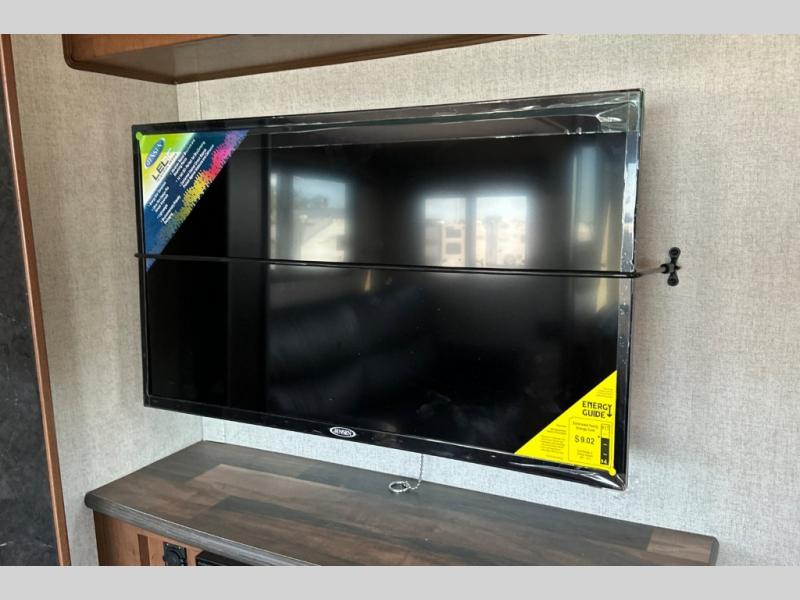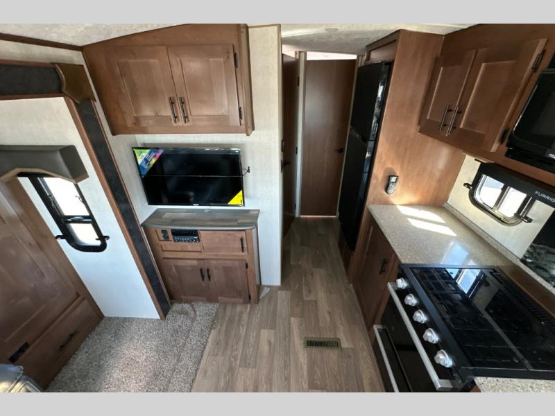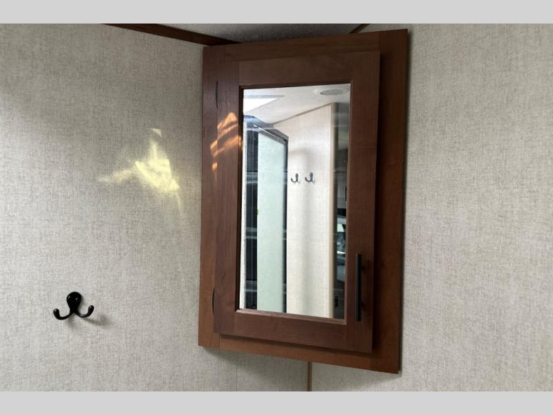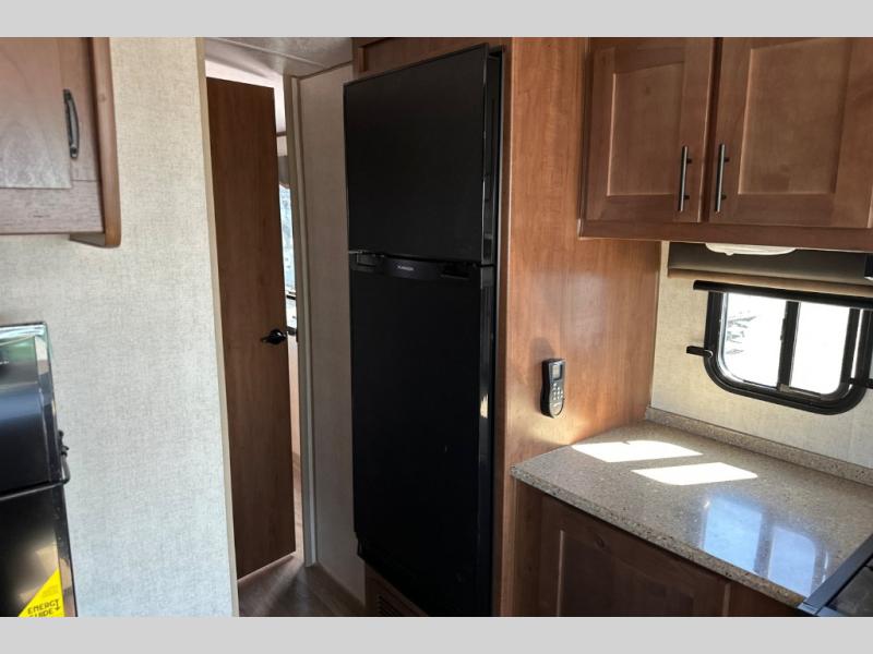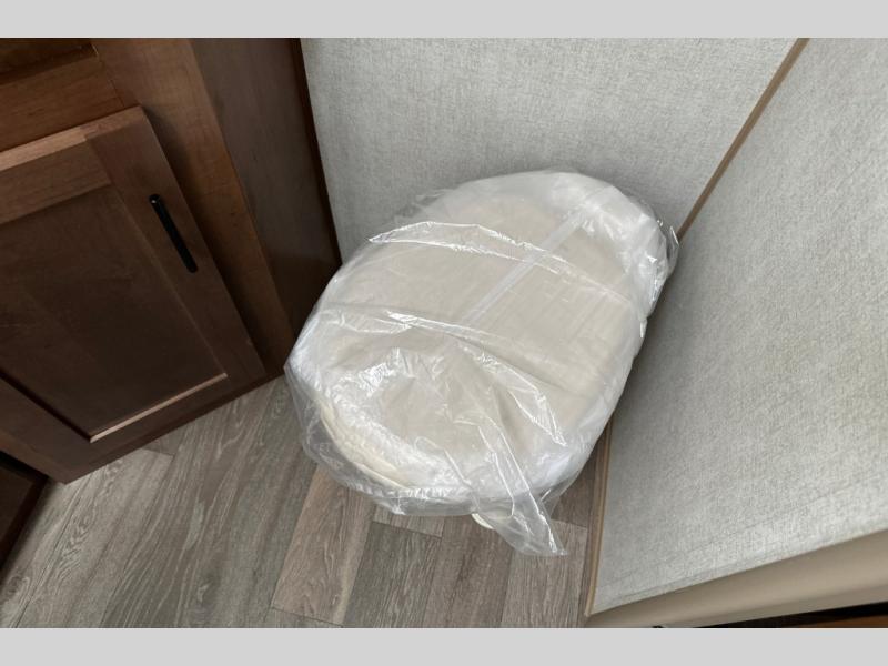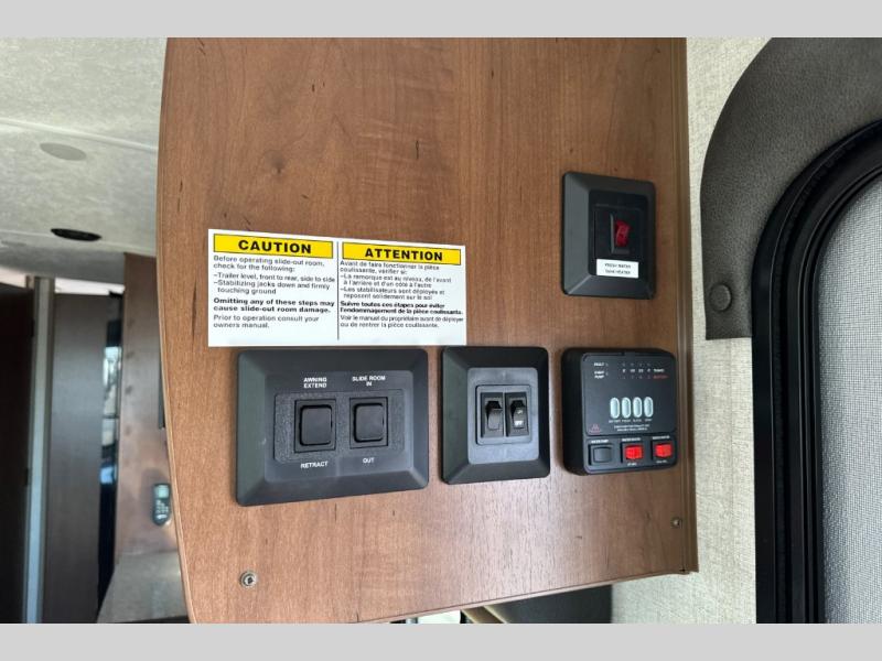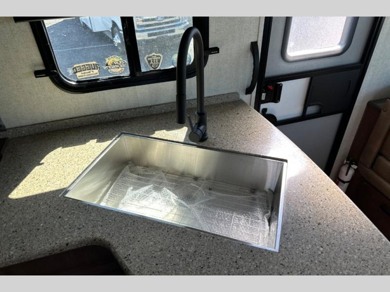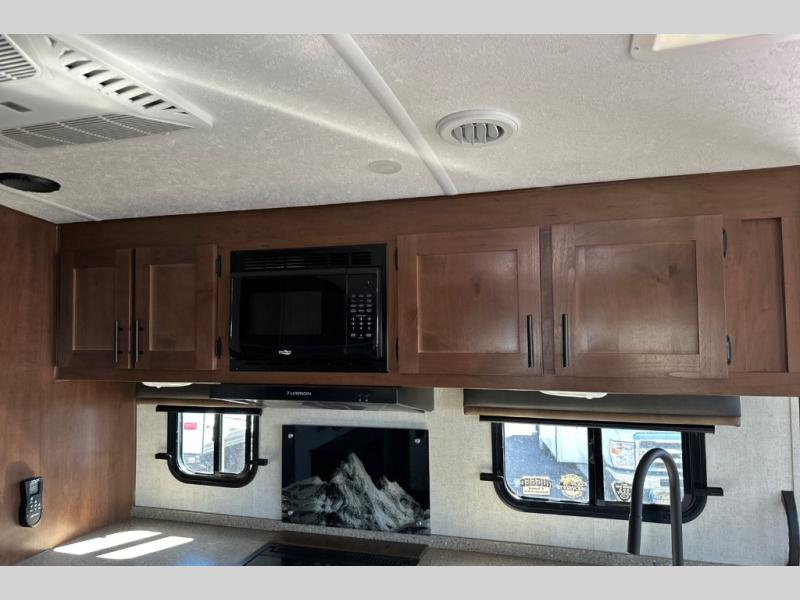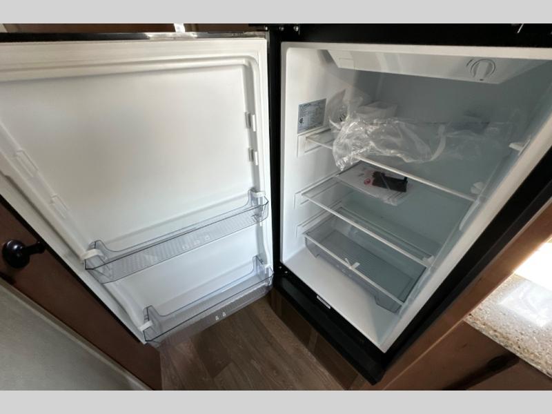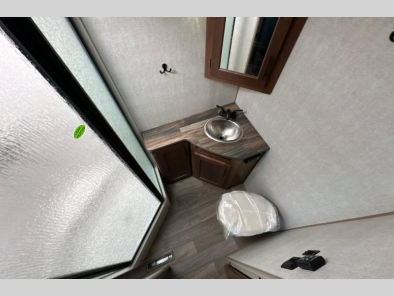 From the rear mountain dinette to the front private bedroom, you will love everything about this travel trailer. Use the flip-up counter in the kitchen for more prep space as you cook lunch, and the refrigerator will come in handy for your perishables. A sleeper sofa slide out will provide comfortable seating and sleeping space, or you may want to choose the optional residential sofa with built-in recliners. A full bath with a skylight ensures you won't have to use the camp's facilities, and a queen bed in the bedroom will provide a great night's rest!