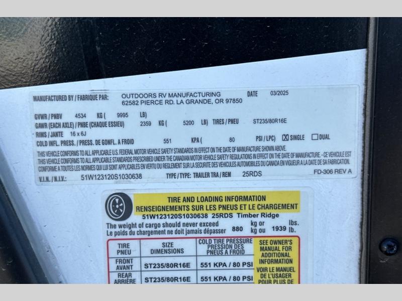 New 2025 Outdoors RV Timber Ridge Mountain Series 25RDS Travel Trailer