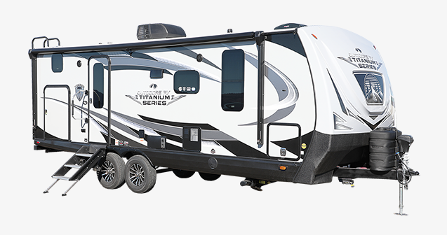 With any Timber Ridge Titanium Series travel trailer by Outdoors RV you will enjoy the sleek design frameless thermal pane windows, along with the silver fiberglass front cap and Titanium Series graphics package. The rugged 8' chassis with 5,100 lb. axles and XL ground clearance will make maneuvering tougher terrain easier than ever, and there is a ground control TT auto leveling system for hassle-free set-up. Each model includes LG solid surface countertops, mountain lodge interiors, hardwood slide out fascia(s), and many more comforts!