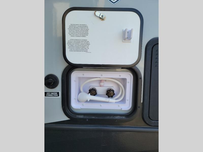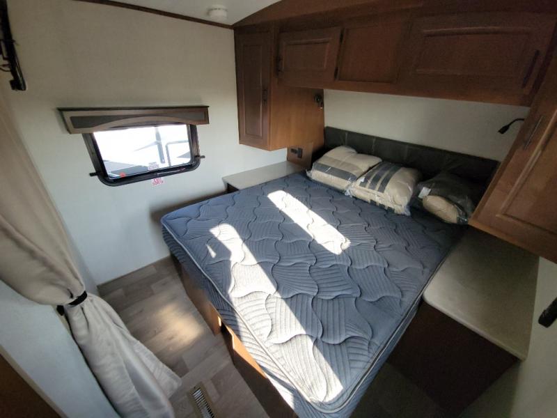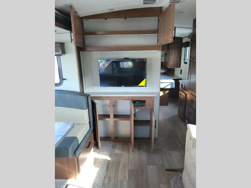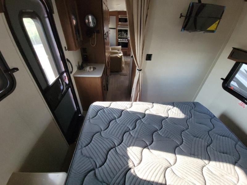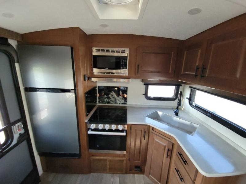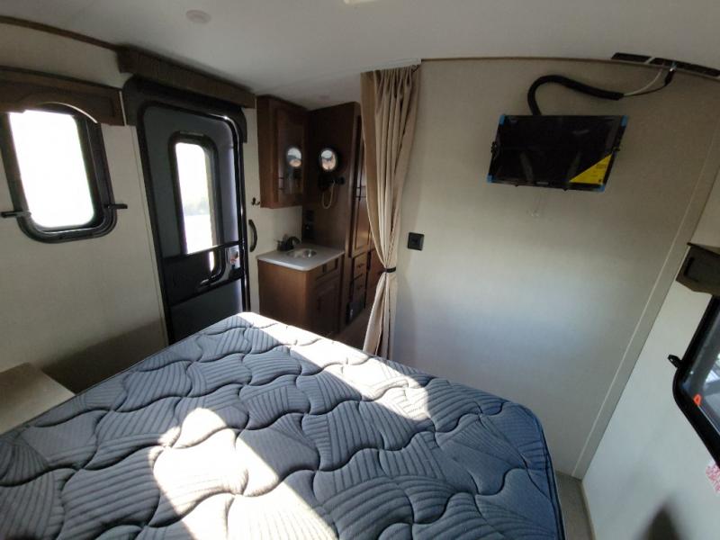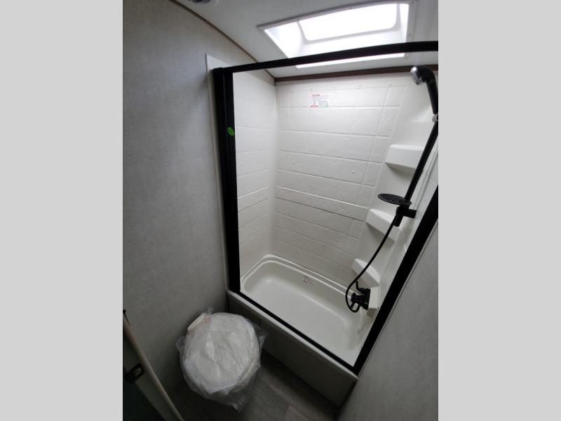 Dual entry doors in this travel trailer will allow you to enter in through the rear kitchen, or in the front bedroom for convenience. You will love having a queen bed to sleep on and dual bedroom wardrobes to keep your clothes wrinkle-free. Get cleaned up in the full bath that includes a shower skylight, then head to the rear kitchen to prepare breakfast on the three burner cooktop. Your crew can sit at the mountain dinette slide or relax on the sleeper sofa before heading out for the day. This model also includes a large wardrobe with drawers and a pantry for tons of storage space.