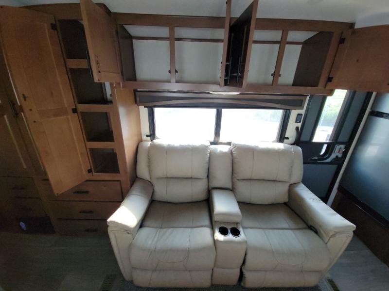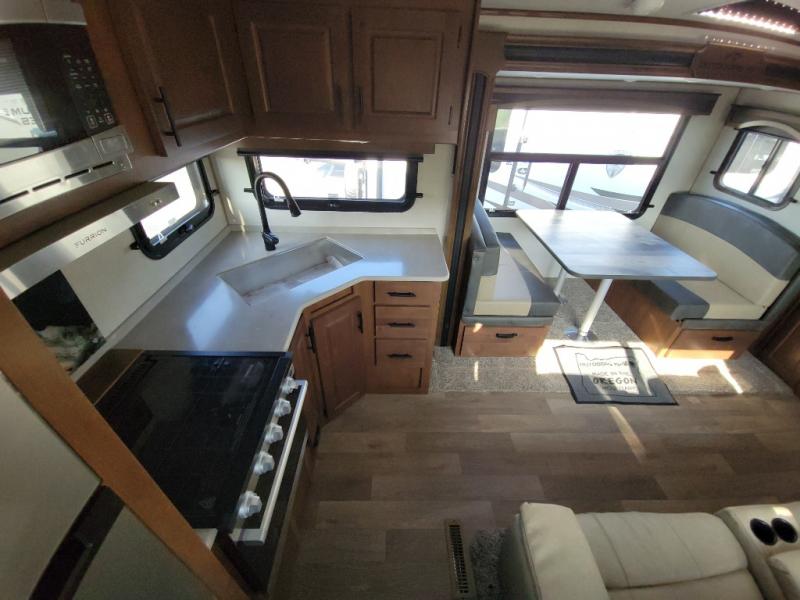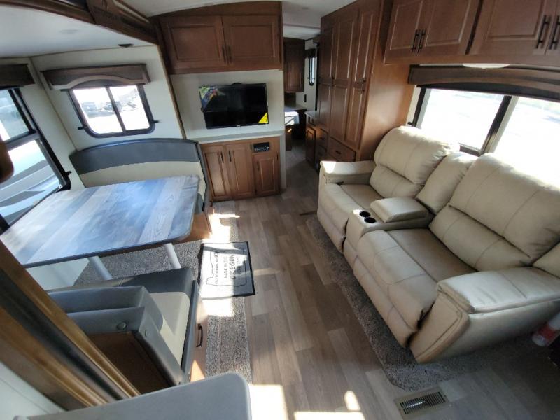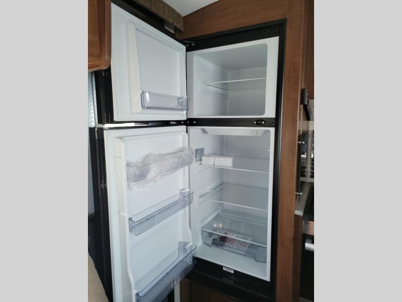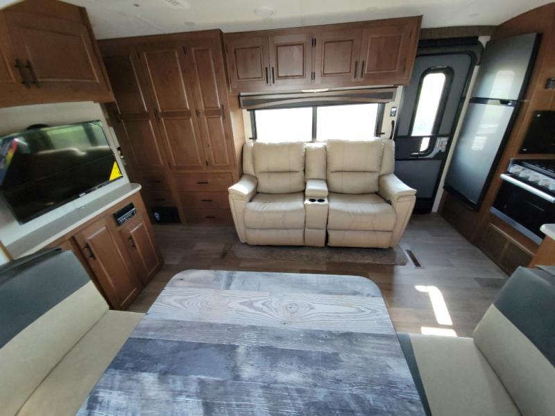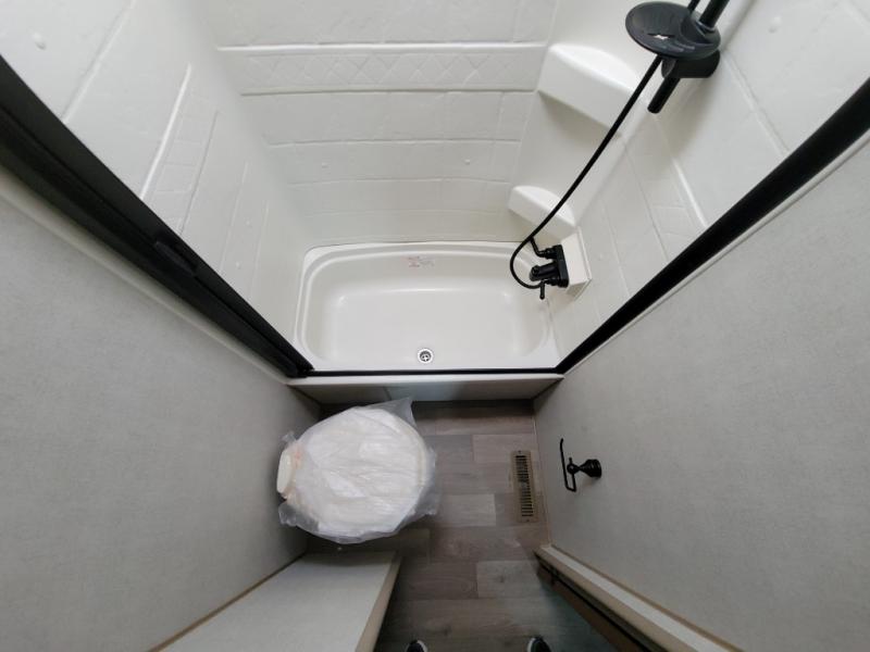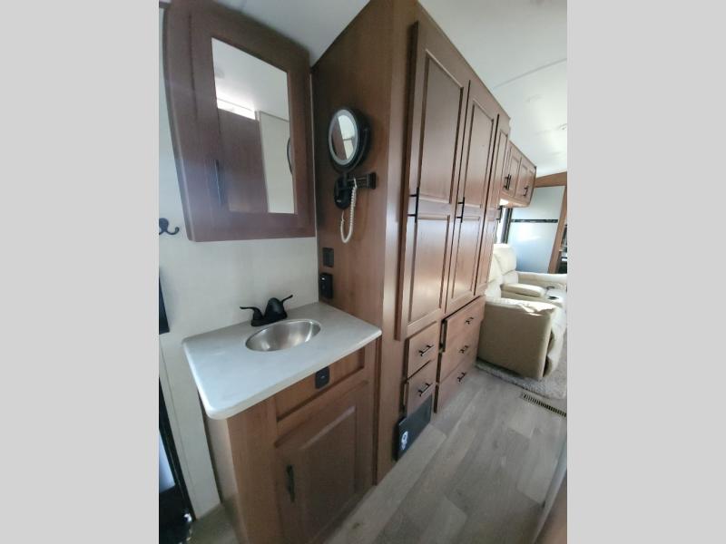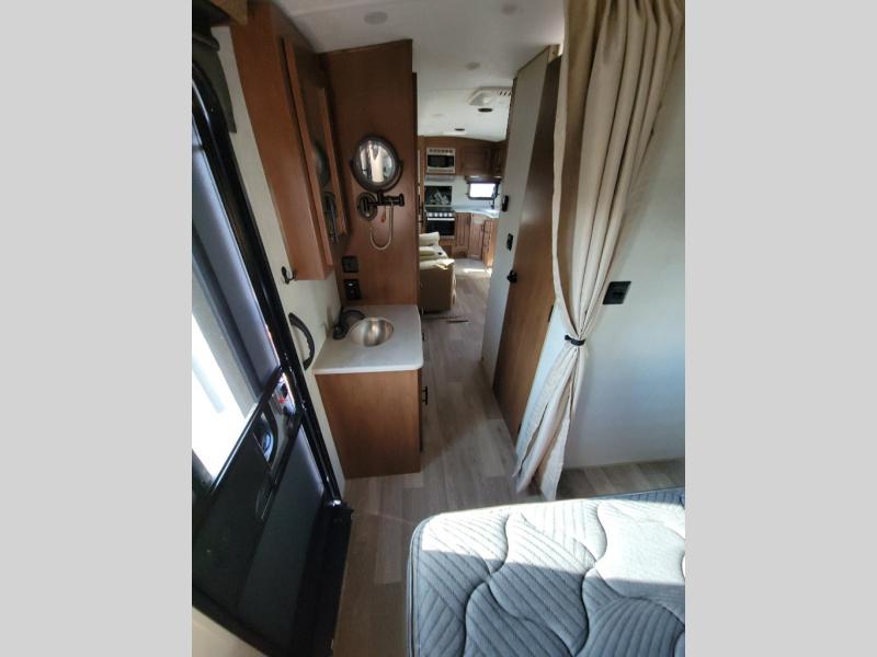 Dual entry doors in this travel trailer will allow you to enter in through the rear kitchen, or in the front bedroom for convenience. You will love having a queen bed to sleep on and dual bedroom wardrobes to keep your clothes wrinkle-free. Get cleaned up in the full bath that includes a shower skylight, then head to the rear kitchen to prepare breakfast on the three burner cooktop. Your crew can sit at the mountain dinette slide or relax on the sleeper sofa before heading out for the day. This model also includes a large wardrobe with drawers and a pantry for tons of storage space.