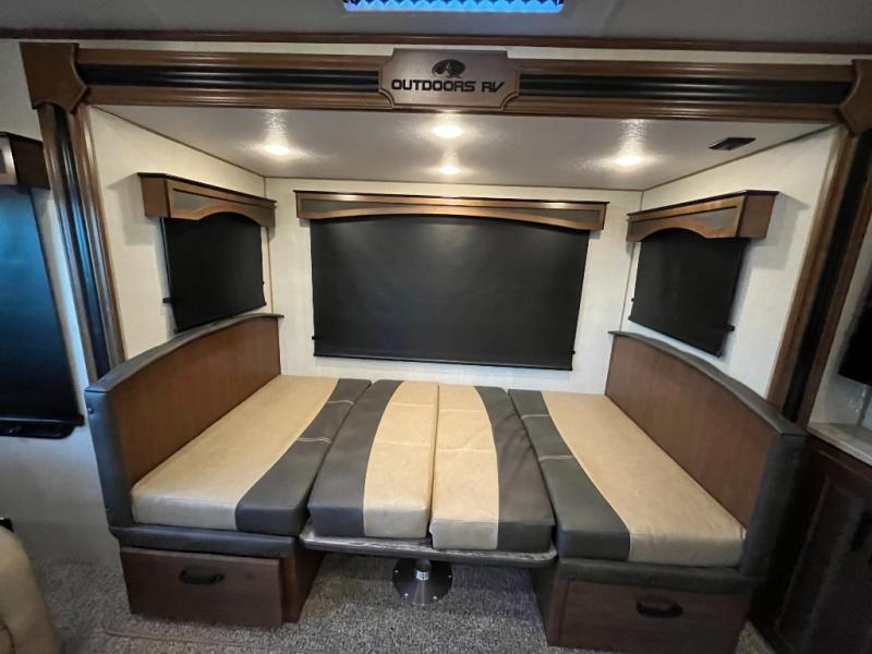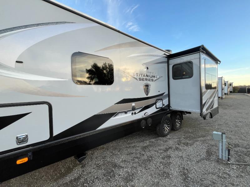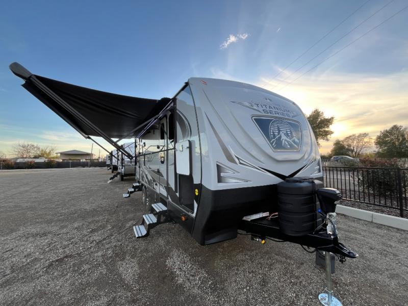 With any Timber Ridge Titanium Series travel trailer by Outdoors RV you will enjoy the sleek design frameless thermal pane windows, along with the silver fiberglass front cap and Titanium Series graphics package. The rugged 8' chassis with 5,100 lb. axles and XL ground clearance will make maneuvering tougher terrain easier than ever, and there is a ground control TT auto leveling system for hassle-free set-up. Each model includes LG solid surface countertops, mountain lodge interiors, hardwood slide out fascia(s), and many more comforts!
