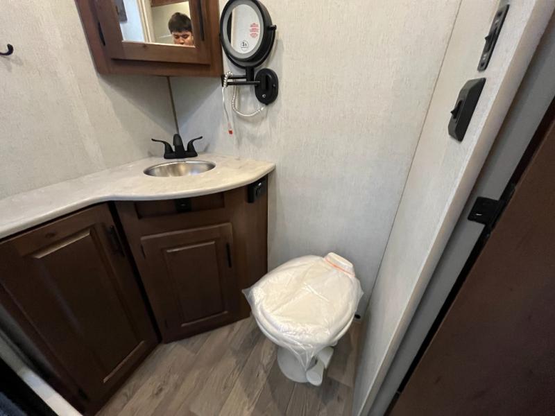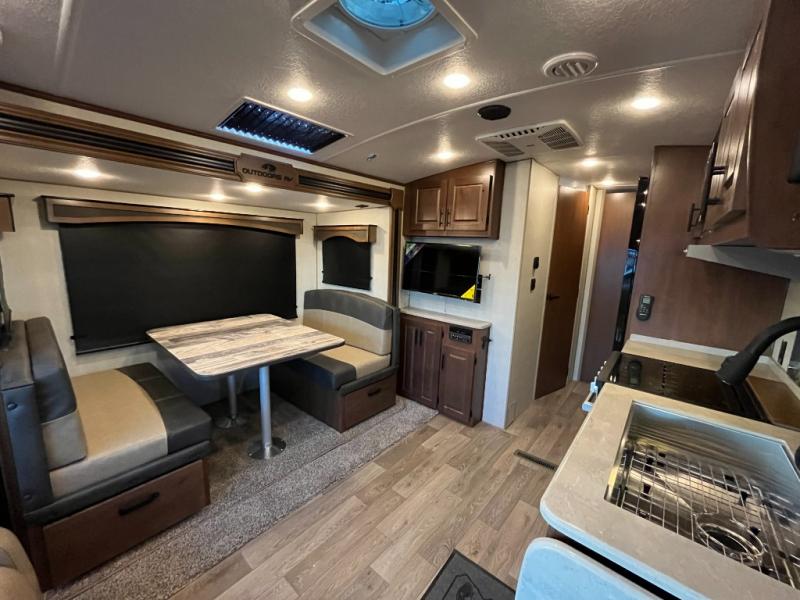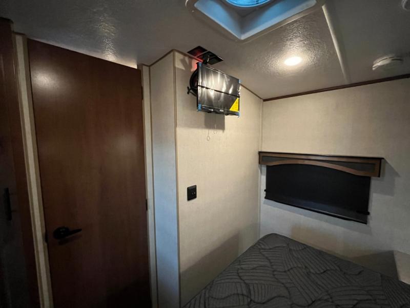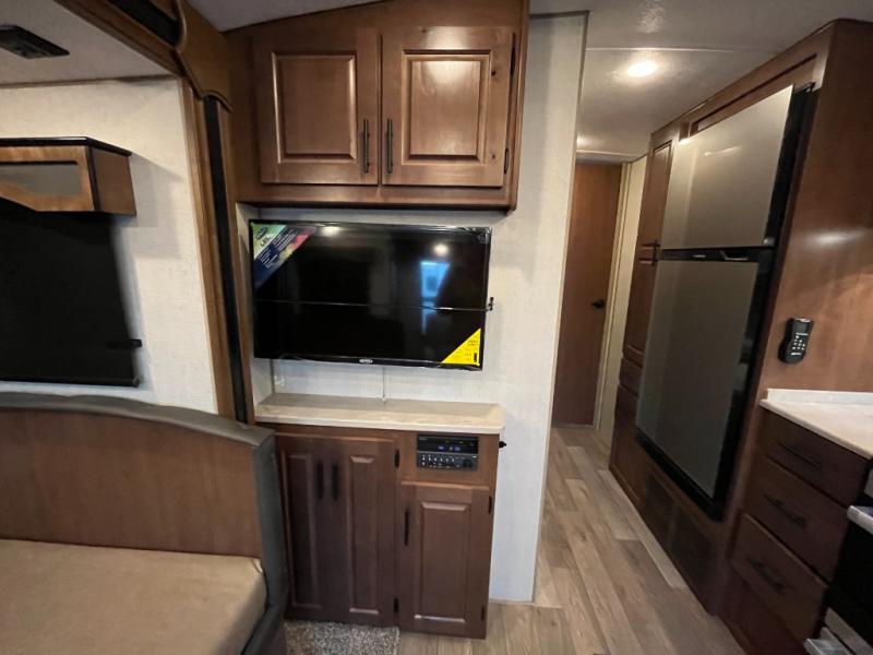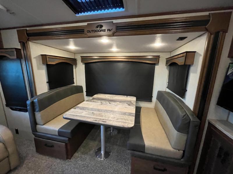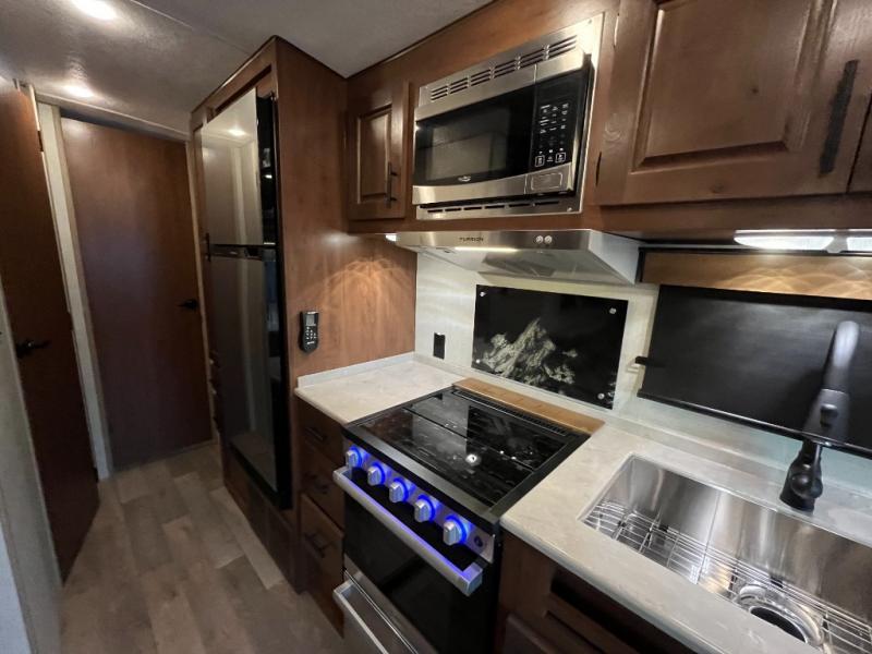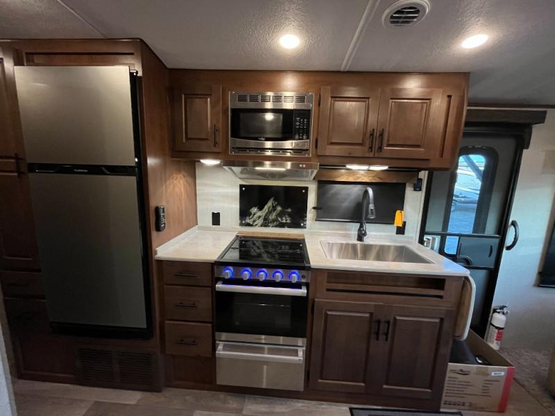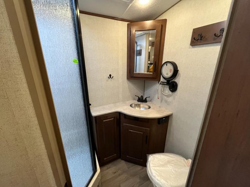 Head out to your favorite campsite in this roomy couple's trailer. There are dual entry doors, allowing you to enter in through the rear living area, or the front private bedroom. You can relax on the dual recliners after you've unpacked and maybe watch a show on the swing-out 32" TV. Once lunch is prepared on the three burner cooktop, you can dine at the mountain dinette or head outdoors to sit under the 21' awning. The queen bed is sure to bring comfort in the front bedroom, and if you have an overnight guest, they can sleep on the dinette!
