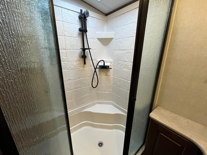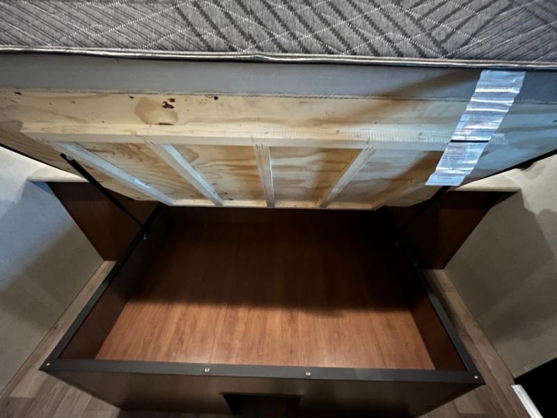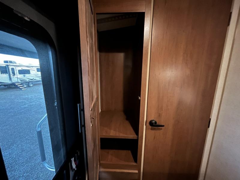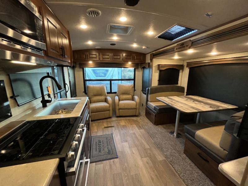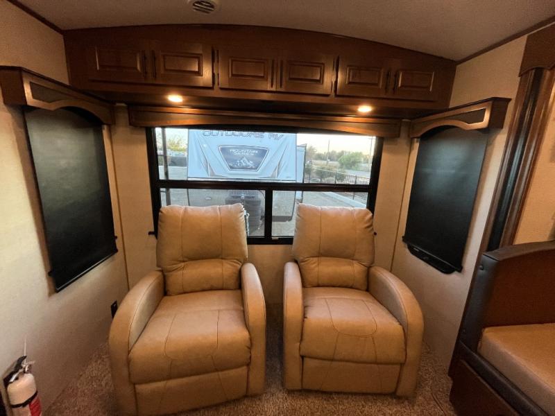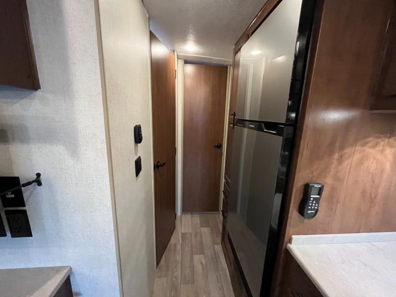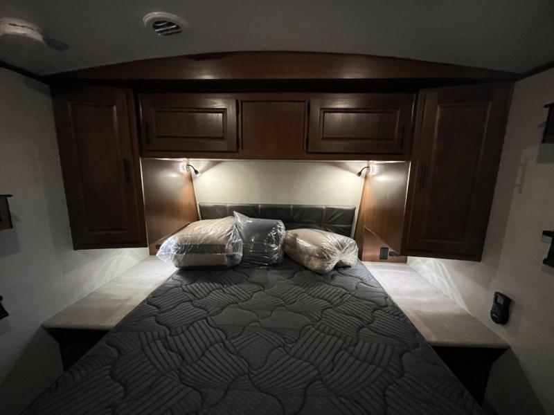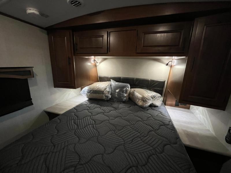 Head out to your favorite campsite in this roomy couple's trailer. There are dual entry doors, allowing you to enter in through the rear living area, or the front private bedroom. You can relax on the dual recliners after you've unpacked and maybe watch a show on the swing-out 32" TV. Once lunch is prepared on the three burner cooktop, you can dine at the mountain dinette or head outdoors to sit under the 21' awning. The queen bed is sure to bring comfort in the front bedroom, and if you have an overnight guest, they can sleep on the dinette!