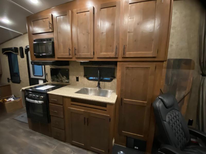 Pack your bags and load up your favorite off-road toy with the 3,000 lb. ramp door into this toy hauler! The 9' 9" garage area has a loft queen bed above a sofa, two recliners which can be switched out for an optional sofa, and a 32" swing out TV for a relaxing evening indoors. There is even an in-floor tool box for your convenience. After a fun day on the trails, freshen up in the full bathroom with a neo-angled shower that has a skylight above to bring the outdoors inside. Enjoy a good night's rest each night on the front 60" x 74" queen bed which has wardrobes on either side to keep your clothes looking their best!