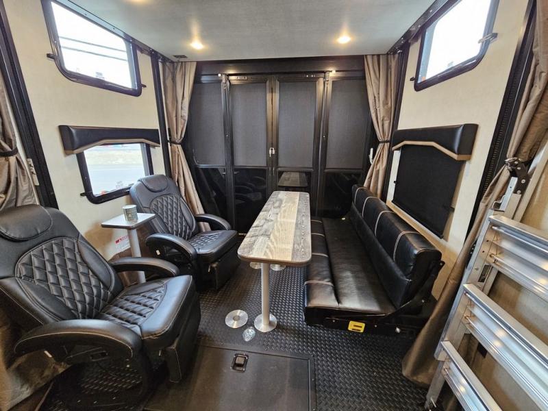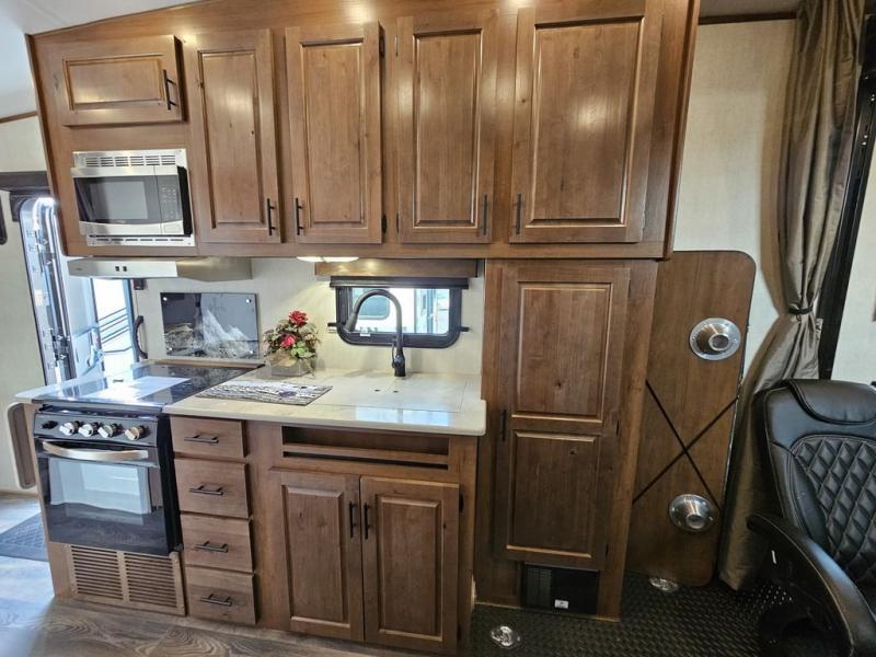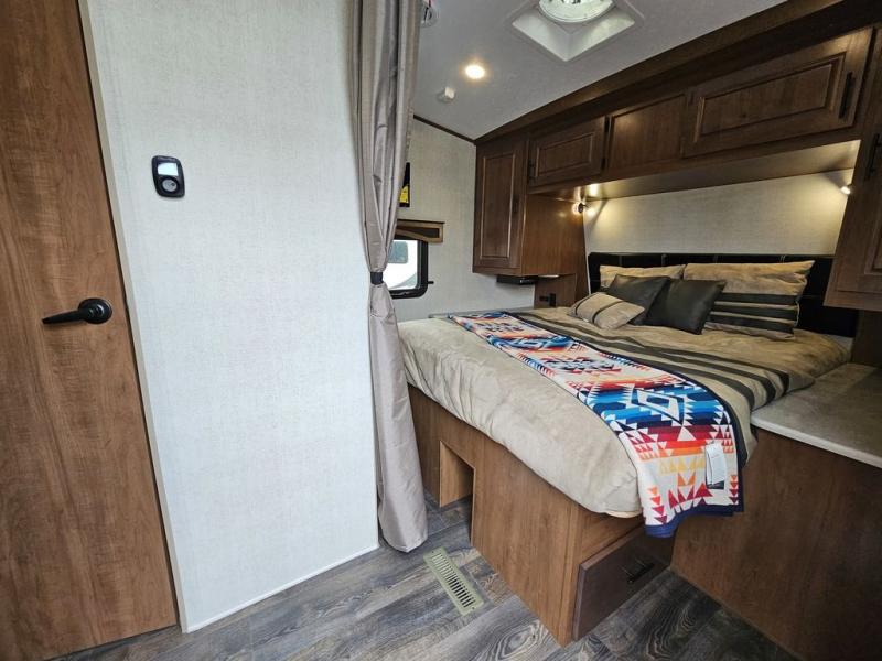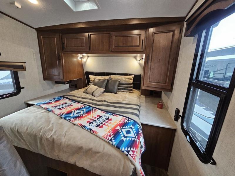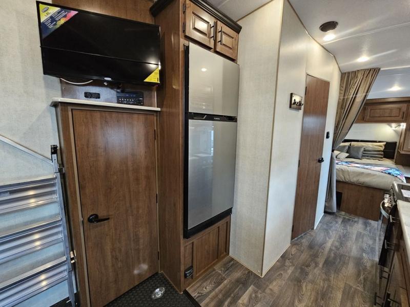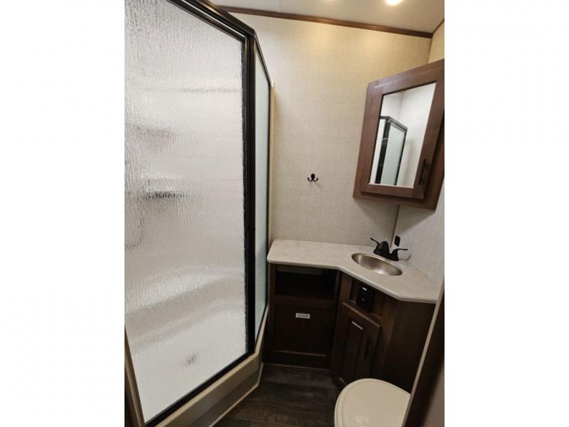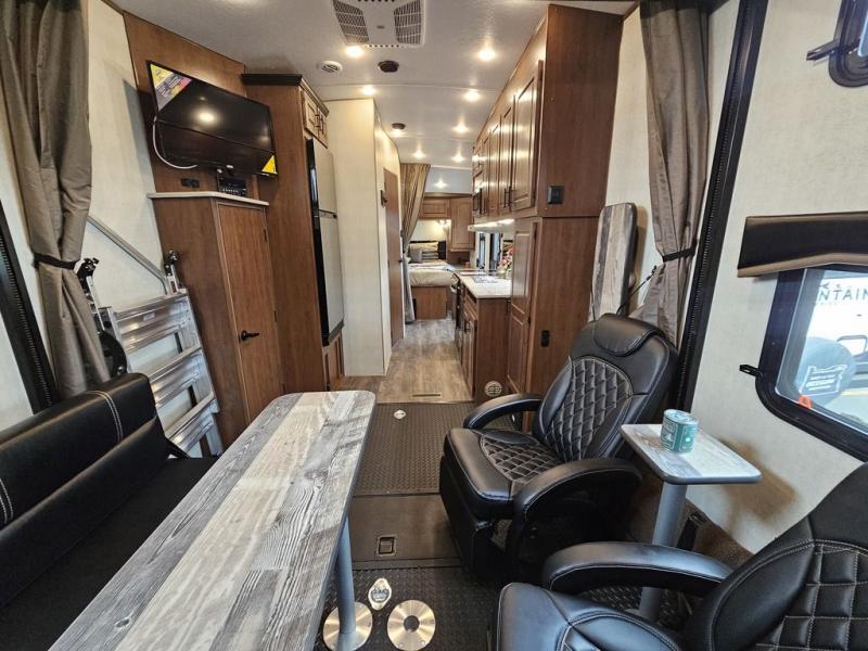 Pack your bags and load up your favorite off-road toy with the 3,000 lb. ramp door into this toy hauler! The 9' 9" garage area has a loft queen bed above a sofa, two recliners which can be switched out for an optional sofa, and a 32" swing out TV for a relaxing evening indoors. There is even an in-floor tool box for your convenience. After a fun day on the trails, freshen up in the full bathroom with a neo-angled shower that has a skylight above to bring the outdoors inside. Enjoy a good night's rest each night on the front 60" x 74" queen bed which has wardrobes on either side to keep your clothes looking their best!