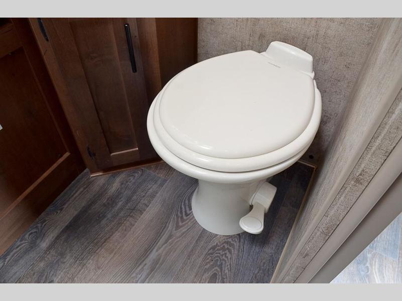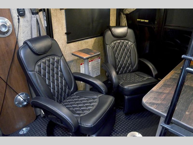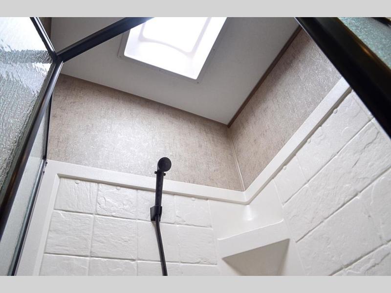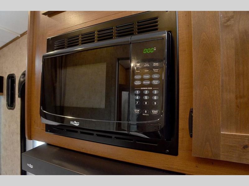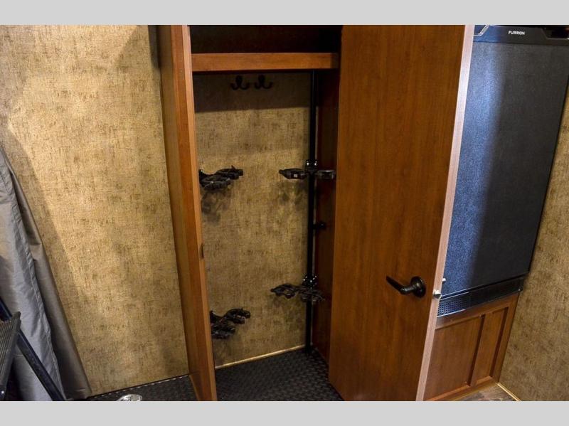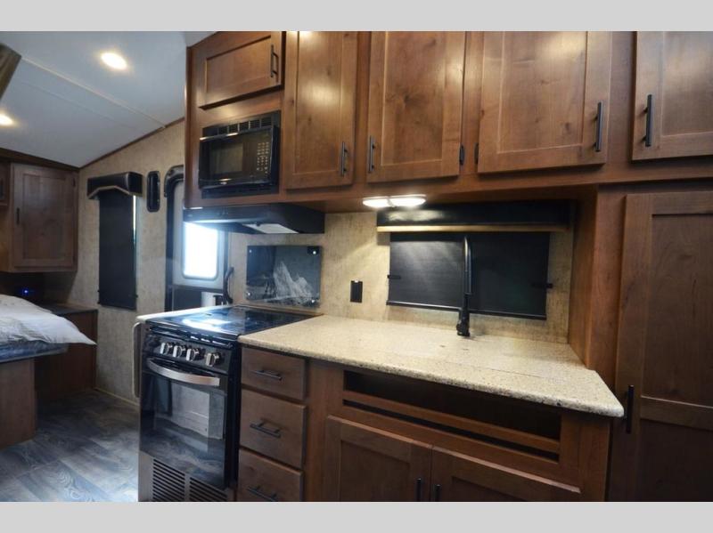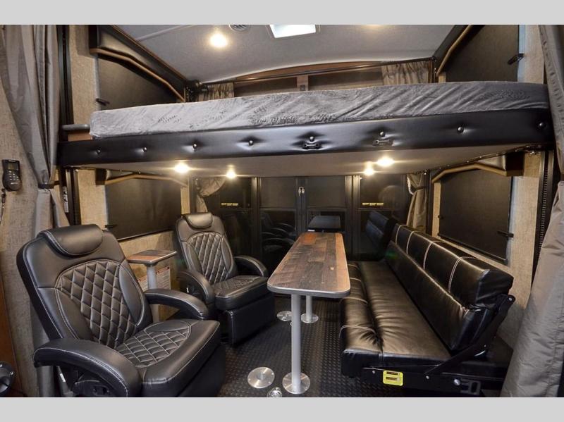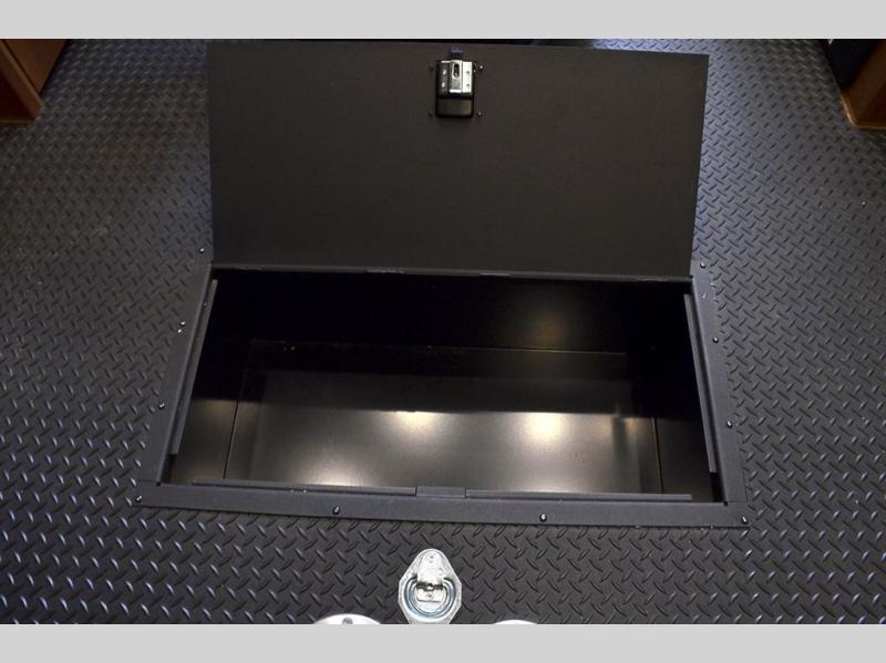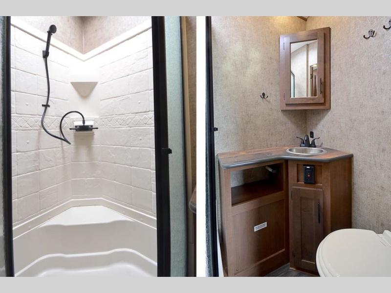 Pack your bags and load up your favorite off-road toy with the 3,000 lb. ramp door into this toy hauler! The 9' 9" garage area has a loft queen bed above a sofa, two recliners which can be switched out for an optional sofa, and a 32" swing out TV for a relaxing evening indoors. There is even an in-floor tool box for your convenience. After a fun day on the trails, freshen up in the full bathroom with a neo-angled shower that has a skylight above to bring the outdoors inside. Enjoy a good night's rest each night on the front 60" x 74" queen bed which has wardrobes on either side to keep your clothes looking their best!