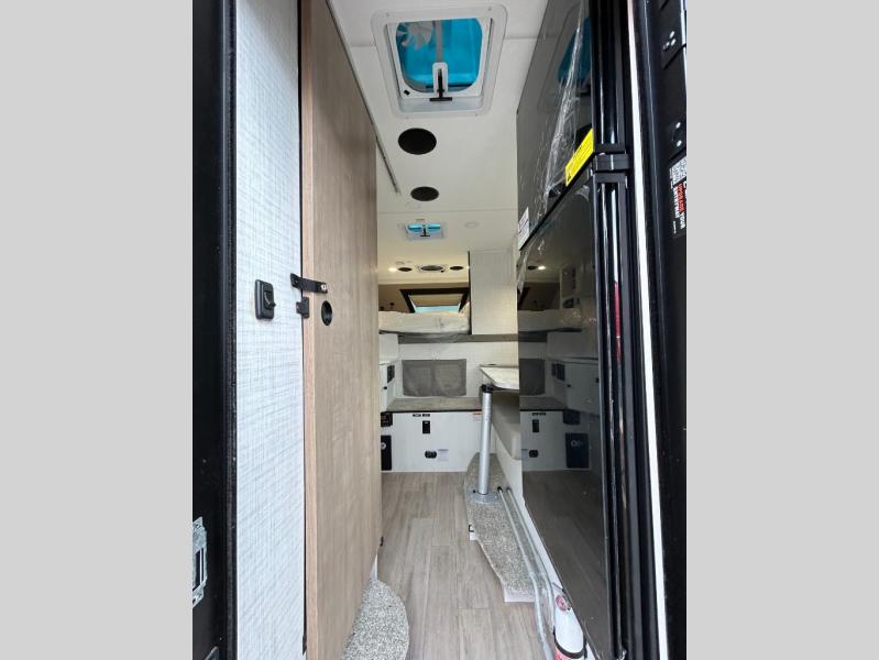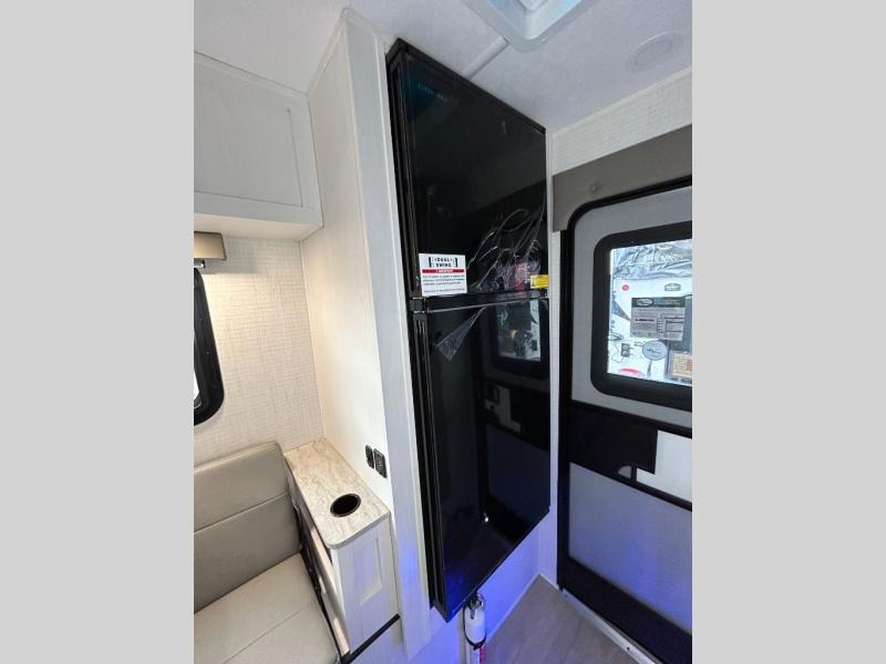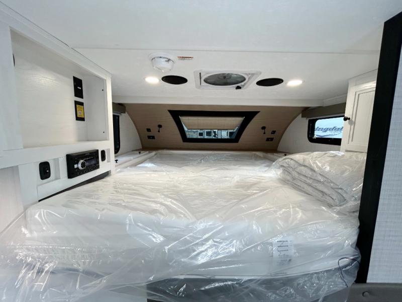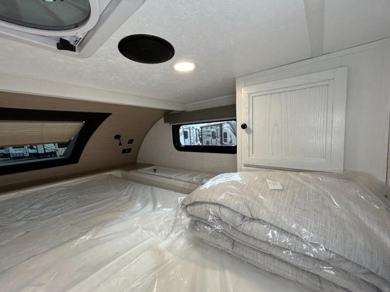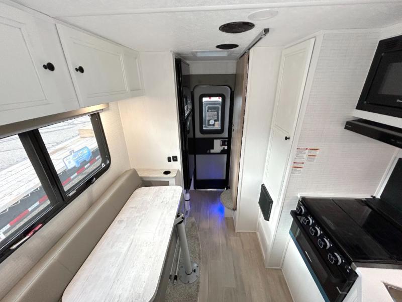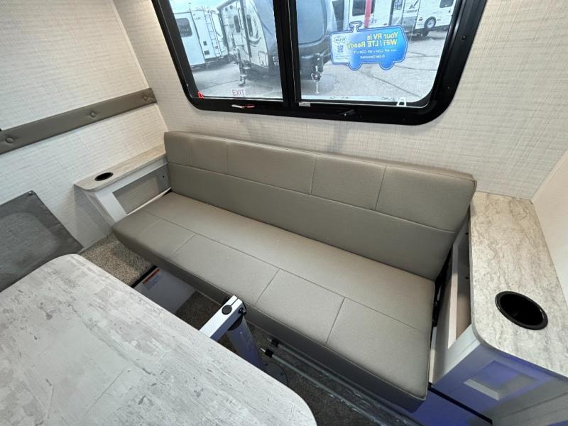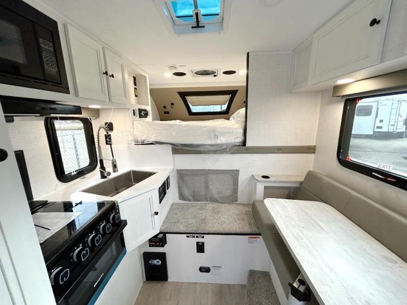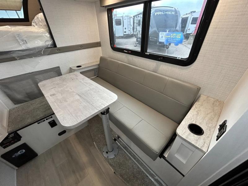 Pick your favorite fishing spot and load up this hard side truck camper! You can fry your catch of the day on the cooktop and enjoy a cold beverage from the refrigerator while you cook it. The 60" jackknife sofa offers a comfortable place for an afternoon nap or for an extra guest to sleep at night while you sleep on the front queen bed which has a wrap around nightstand, storage chests on either side, and a closet to keep your clothes wrinkle-free. If you're needing more sleeping space, you might consider adding the optional drop-down bunk above the sofa!