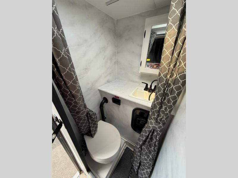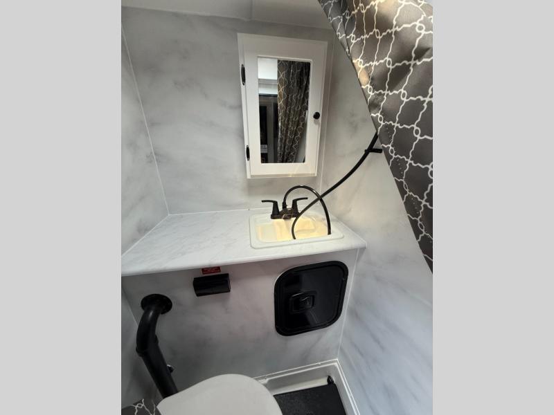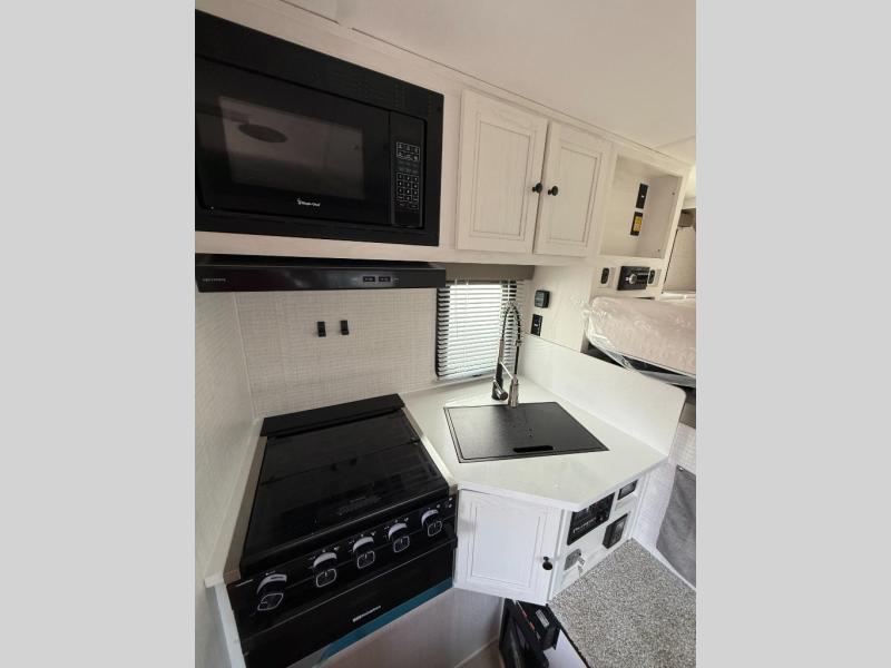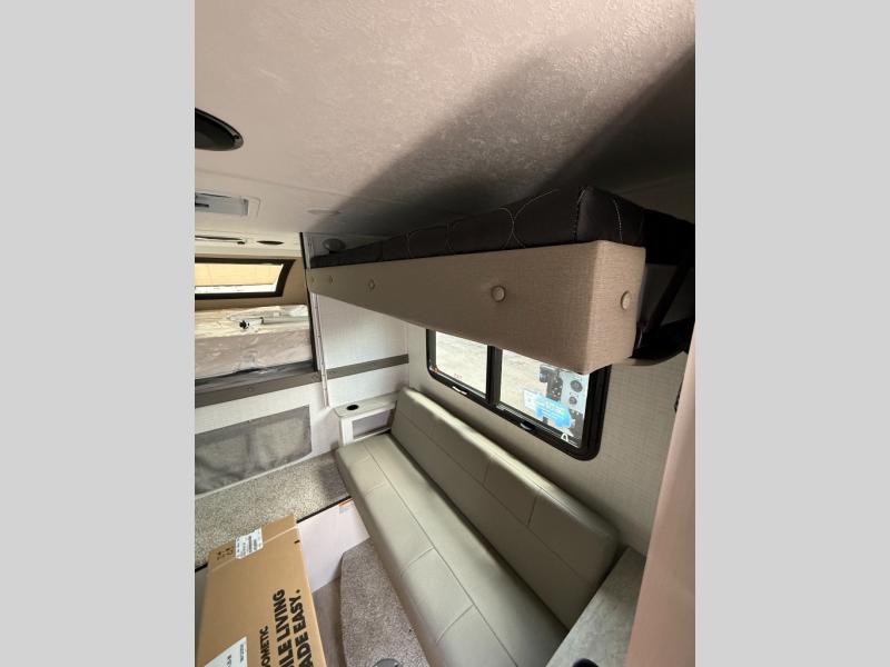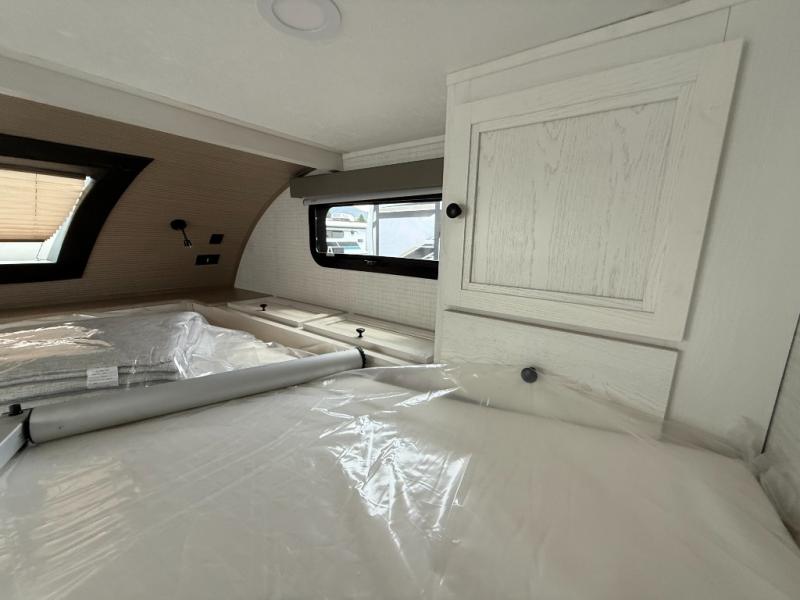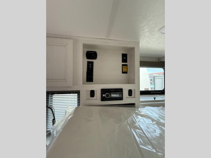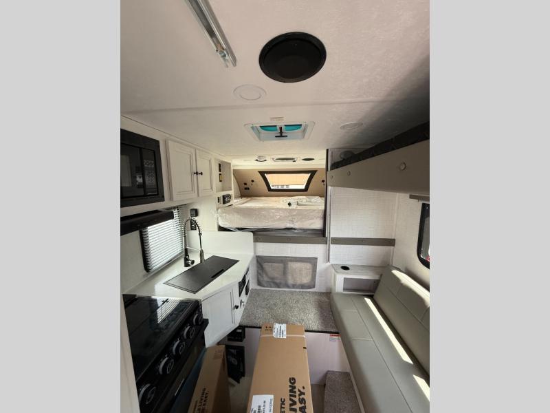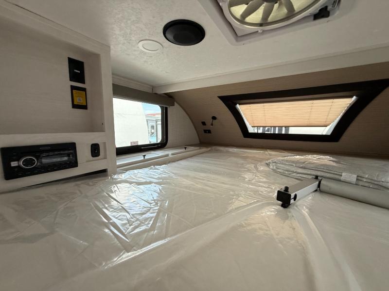 Pick your favorite fishing spot and load up this hard side truck camper! You can fry your catch of the day on the cooktop and enjoy a cold beverage from the refrigerator while you cook it. The 60" jackknife sofa offers a comfortable place for an afternoon nap or for an extra guest to sleep at night while you sleep on the front queen bed which has a wrap around nightstand, storage chests on either side, and a closet to keep your clothes wrinkle-free. If you're needing more sleeping space, you might consider adding the optional drop-down bunk above the sofa!