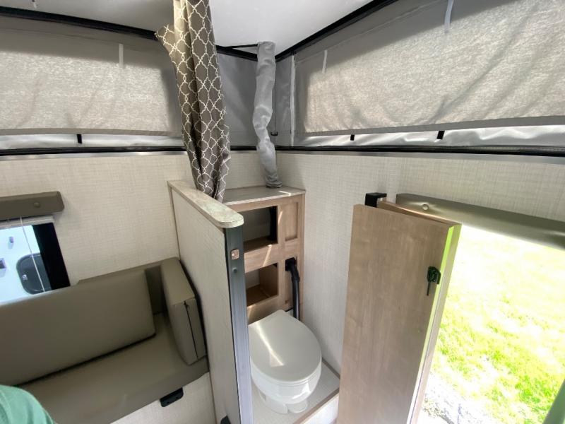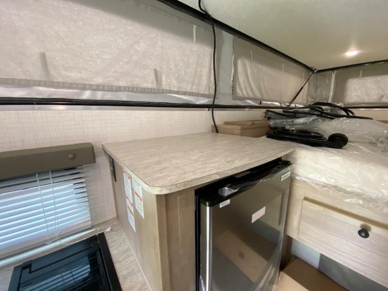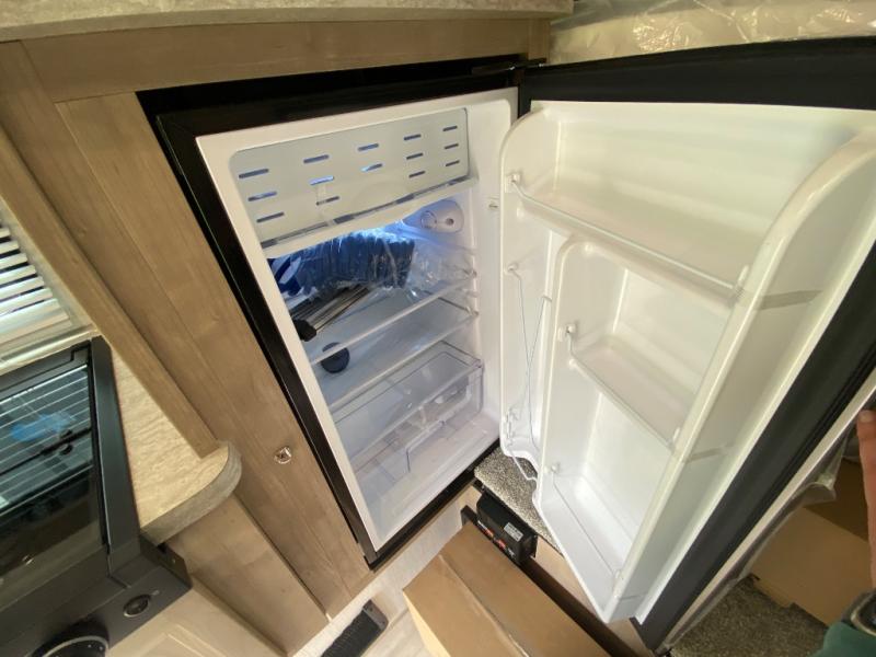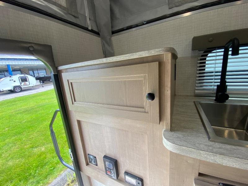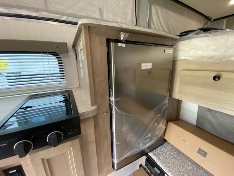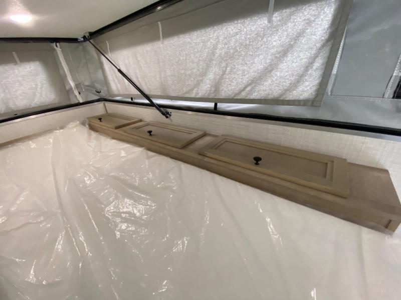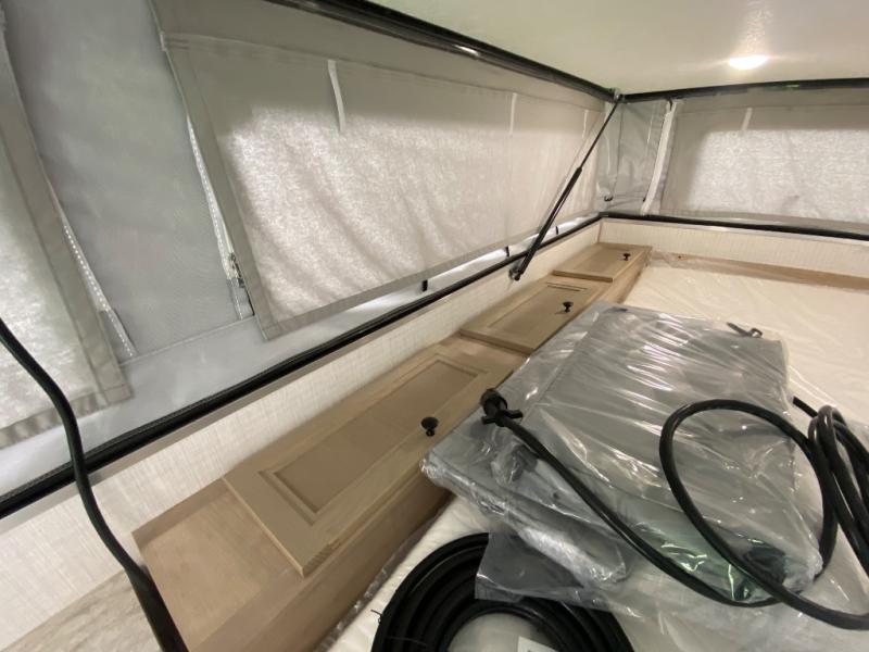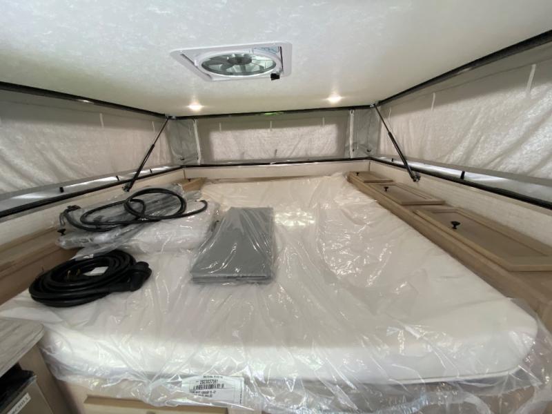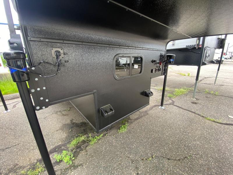 An electric roof lift with a remote will make setting up this soft side truck camper easy! Lay your head at night on the front queen bed with foot lockers and bedroom storage on either side of it to keep your items out of the way. Prepare your best meals with the two burner cooktop, store your canned goods in the pantry, and keep your beverages cold in the three way-refrigerator. The seating area comes with a table so you can enjoy your meals comfortably. There is also a wardrobe behind the private toilet for you to store your toiletries.