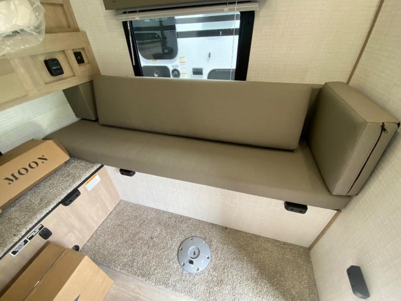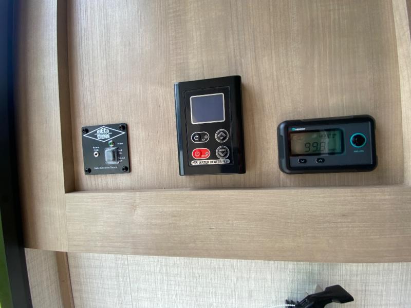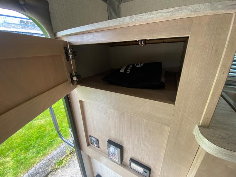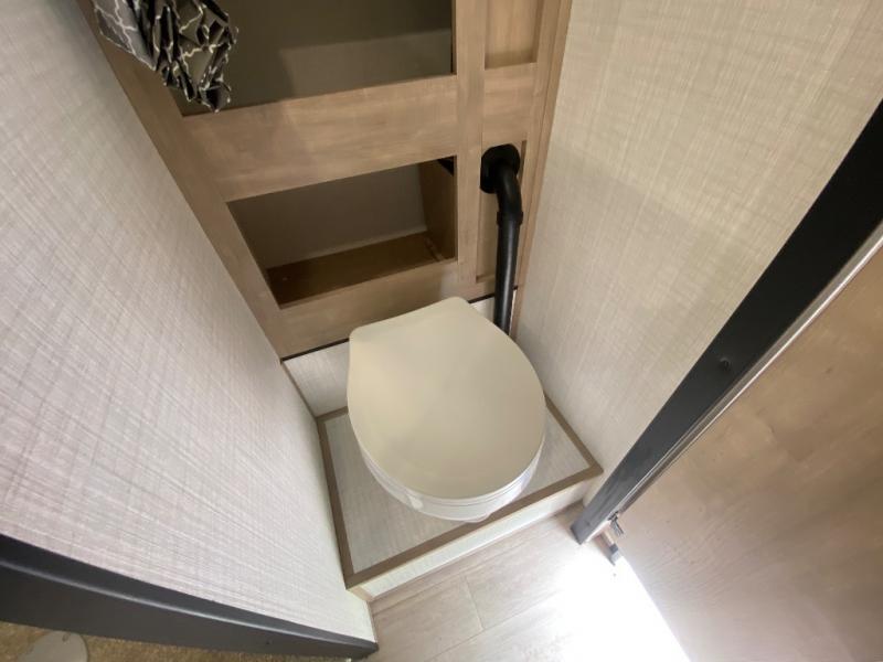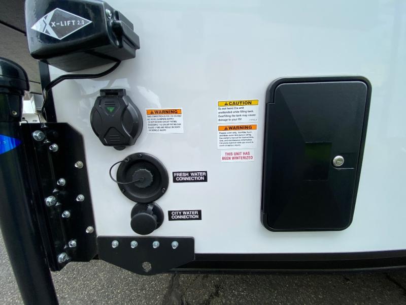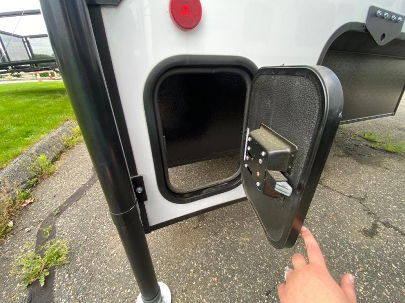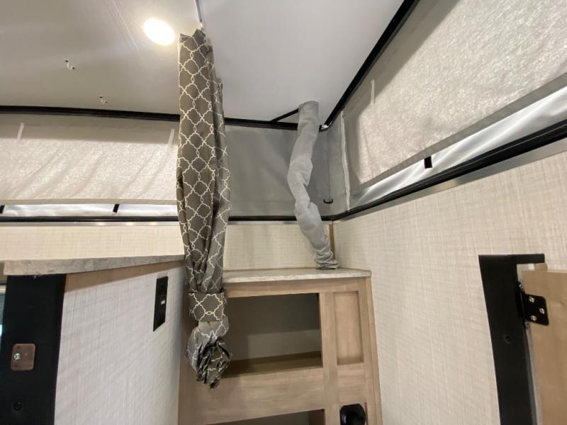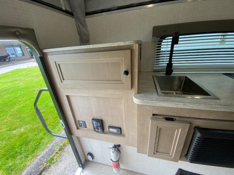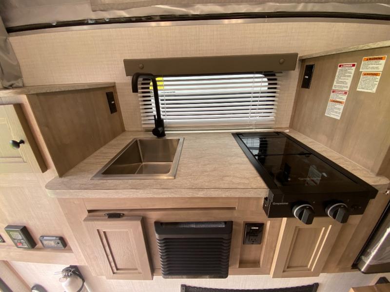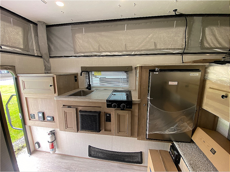 An electric roof lift with a remote will make setting up this soft side truck camper easy! Lay your head at night on the front queen bed with foot lockers and bedroom storage on either side of it to keep your items out of the way. Prepare your best meals with the two burner cooktop, store your canned goods in the pantry, and keep your beverages cold in the three way-refrigerator. The seating area comes with a table so you can enjoy your meals comfortably. There is also a wardrobe behind the private toilet for you to store your toiletries.