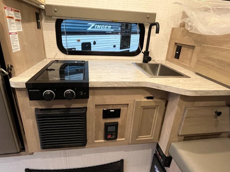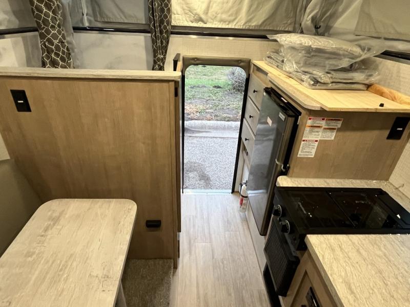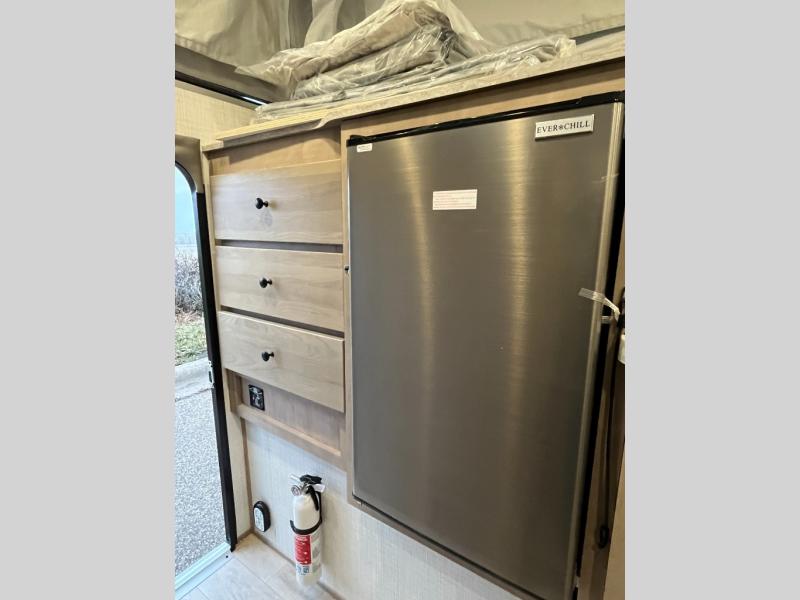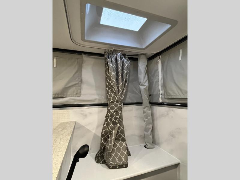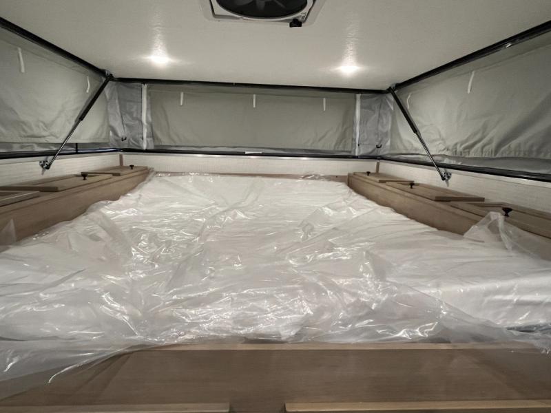 Make the most of all your adventures with this soft side truck camper! Start each morning feeling recharged after sleeping on the front queen bed with foot lockers and bedroom storage on either side of it, and freshen up in the wet bath with storage to keep your towel nearby. There is storage across from the bathroom for your canned goods, a refrigerator to keep your perishables fresh, and a two burner cooktop to prepare your best meals. Enjoy your meals at the seating area with a table then grab a board game from the storage area under the seating!