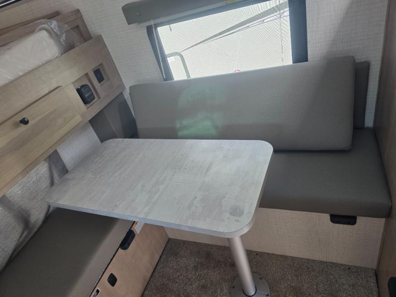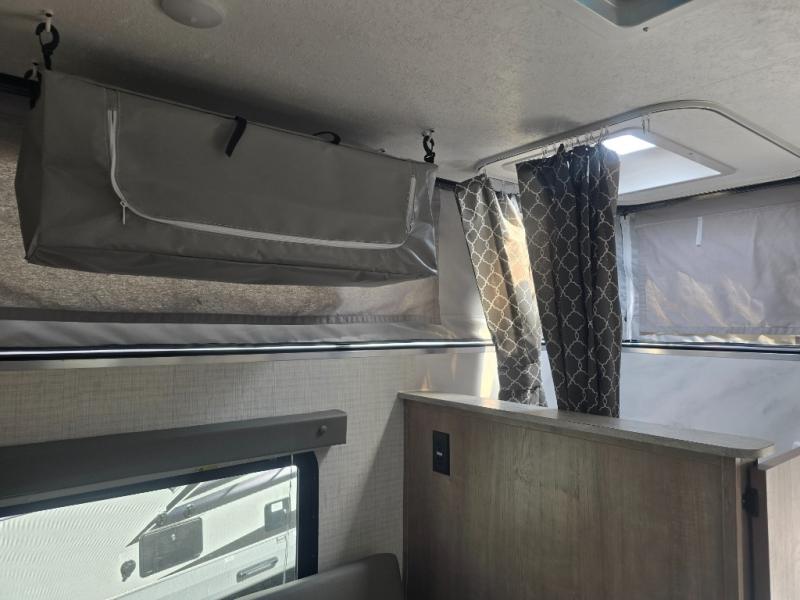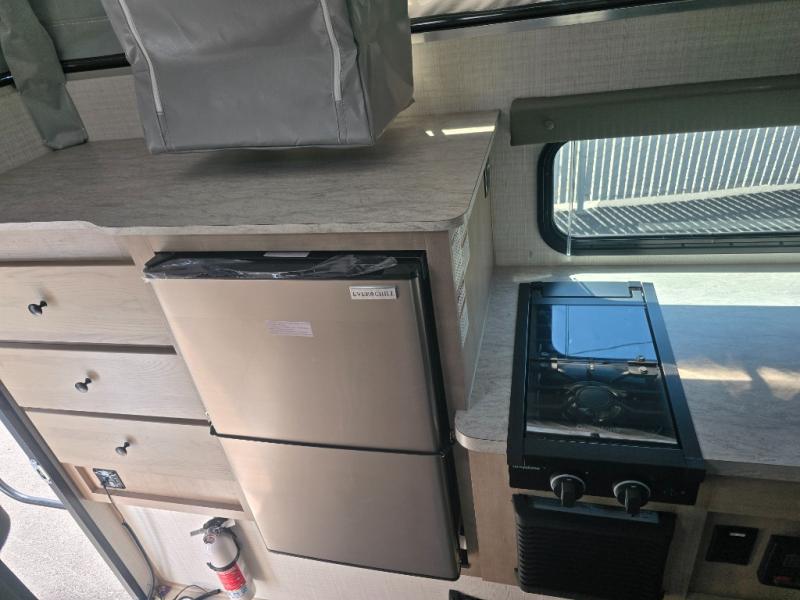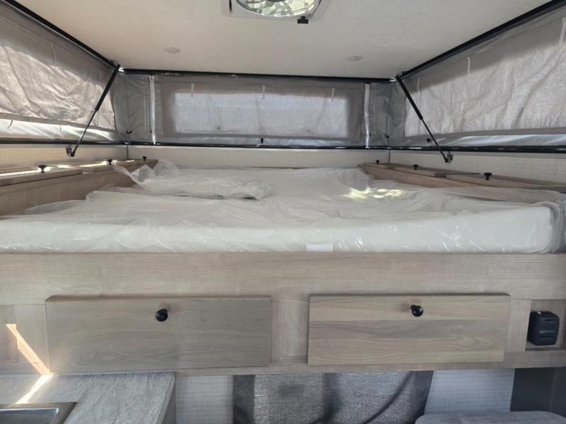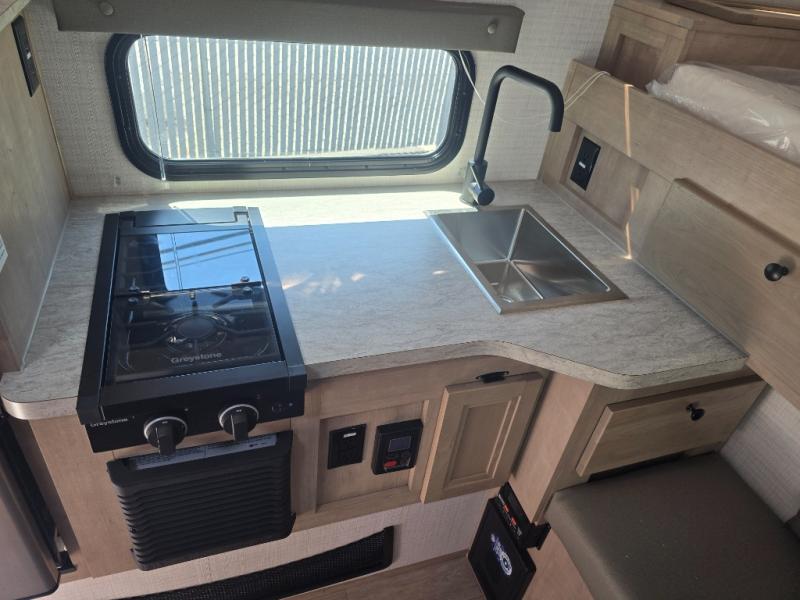 Make the most of all your adventures with this soft side truck camper! Start each morning feeling recharged after sleeping on the front queen bed with foot lockers and bedroom storage on either side of it, and freshen up in the wet bath with storage to keep your towel nearby. There is storage across from the bathroom for your canned goods, a refrigerator to keep your perishables fresh, and a two burner cooktop to prepare your best meals. Enjoy your meals at the seating area with a table then grab a board game from the storage area under the seating!
