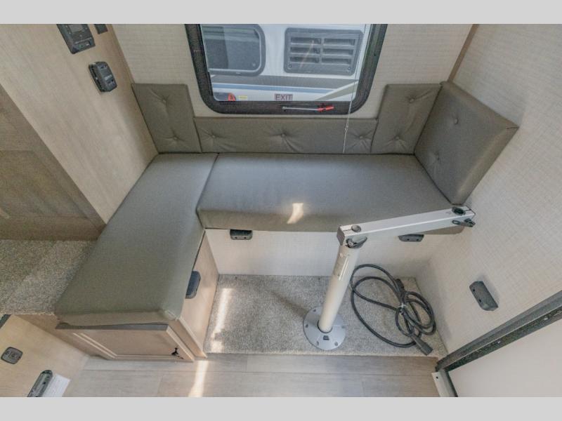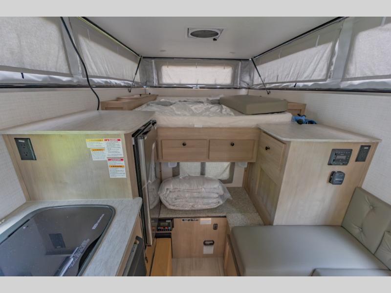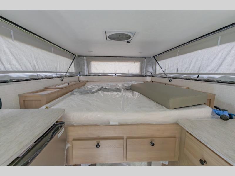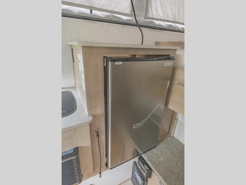 This soft side truck camper was built for 1/2 ton trucks with a 5' 6" to an 8' bed. Wake up feeling recharged after sleeping on the front queen bed with foot lockers and bedroom storage on either side of it. There is even a wardrobe for added storage. You can prepare your best meals with the two burner cooktop, and the refrigerator can hold perishables. Your meals can be enjoyed at the U-shaped seating area with a table and you can transform it into an extra sleeping space for a friend to join the fun!
