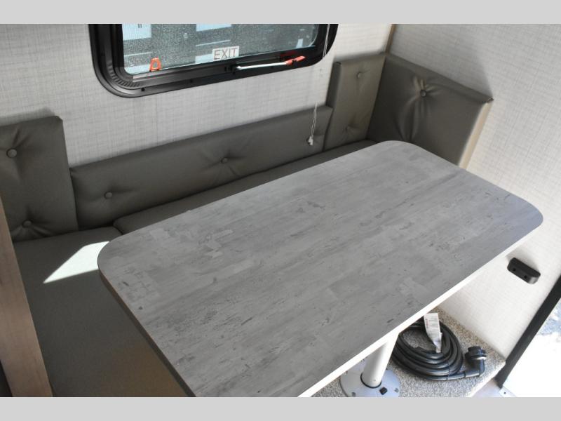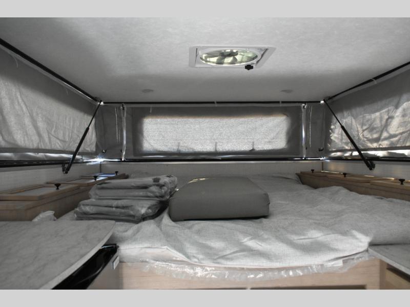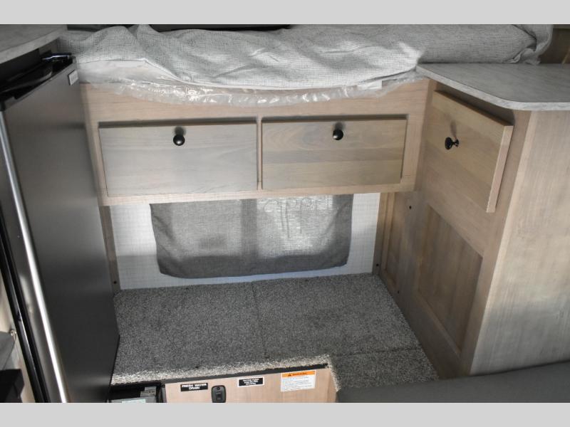 This soft side truck camper was built for 1/2 ton trucks with a 5' 6" to an 8' bed. Wake up feeling recharged after sleeping on the front queen bed with foot lockers and bedroom storage on either side of it. There is even a wardrobe for added storage. You can prepare your best meals with the two burner cooktop, and the refrigerator can hold perishables. Your meals can be enjoyed at the U-shaped seating area with a table and you can transform it into an extra sleeping space for a friend to join the fun!