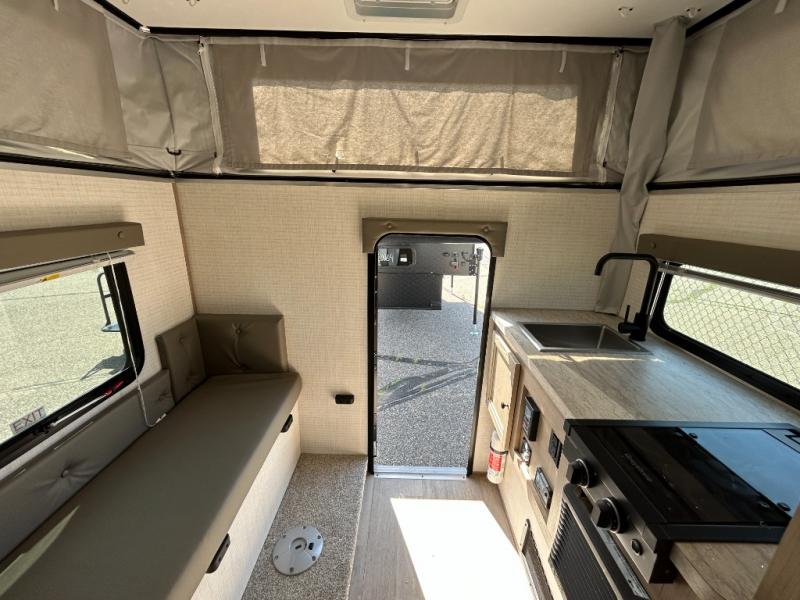 This soft side truck camper was built for 1/2 ton trucks with a 5' 6" to an 8' bed. Wake up feeling recharged after sleeping on the front queen bed with foot lockers and bedroom storage on either side of it. There is even a wardrobe for added storage. You can prepare your best meals with the two burner cooktop, and the refrigerator can hold perishables. Your meals can be enjoyed at the U-shaped seating area with a table and you can transform it into an extra sleeping space for a friend to join the fun!
