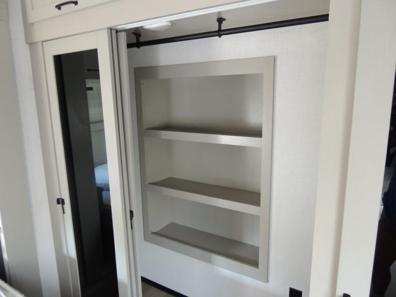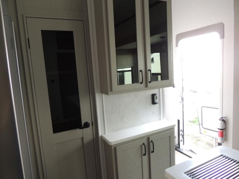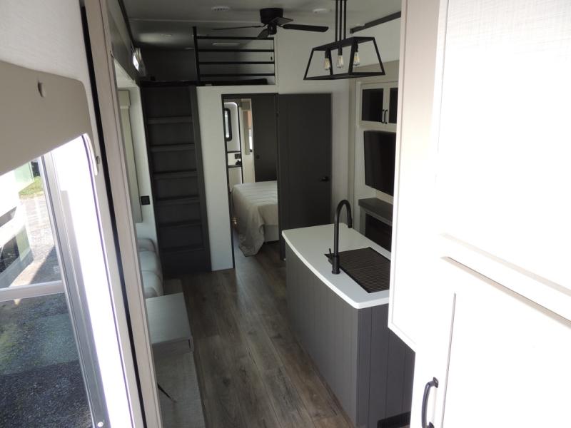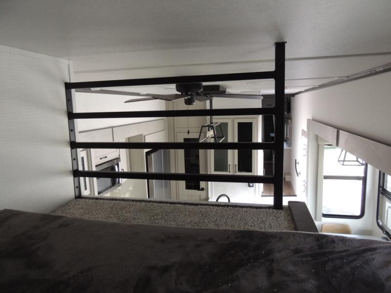 Camping with friends and family just got a whole lot easier in this spacious fifth wheel! Up front, you'll find a private bedroom with a king bed slide out, a dresser, a wardrobe with a shelf, plus washer and dryer prep if you plan to go full-time. The master bedroom towards the back includes a queen bed slide out, a wardrobe and a dresser, plus a full rear bath with a unique rear entry door. There is also a loft bed with a ladder above this rear room for added sleeping or storage space! Everyone can meet in the middle kitchen and living room that includes a table and chairs, theater seat, kitchen island, and an entertainment center with a fireplace. There is even a pantry, hutch, and 3-door refrigerator for ample storage. You don't want to miss out on this fifth wheel!