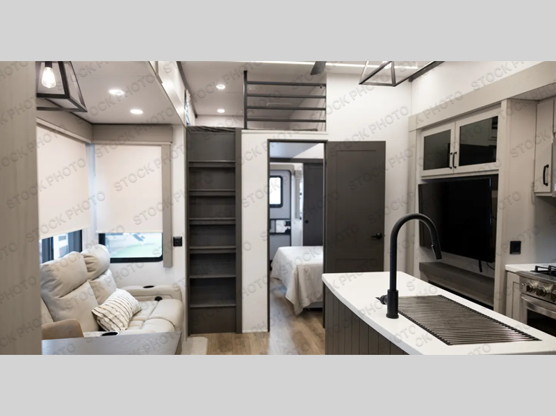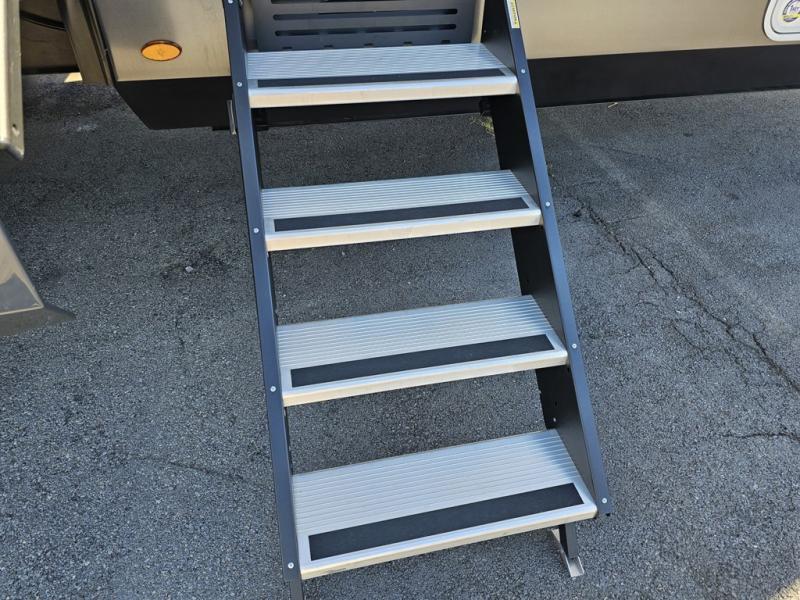Camping with friends and family just got a whole lot easier in this spacious fifth wheel! Up front, you'll find a private bedroom with a king bed slide out, a dresser, a wardrobe with a shelf, plus washer and dryer prep if you plan to go full-time. The master bedroom towards the back includes a queen bed slide out, a wardrobe and a dresser, plus a full rear bath with a unique rear entry door. There is also a loft bed with a ladder above this rear room for added sleeping or storage space! Everyone can meet in the middle kitchen and living room that includes a table and chairs, theater seat, kitchen island, and an entertainment center with a fireplace. There is even a pantry, hutch, and 3-door refrigerator for ample storage. You don't want to miss out on this fifth wheel!