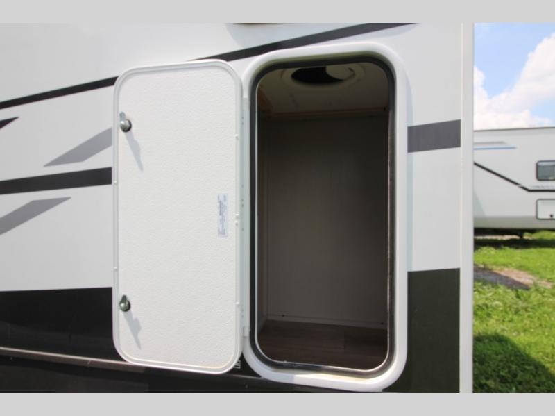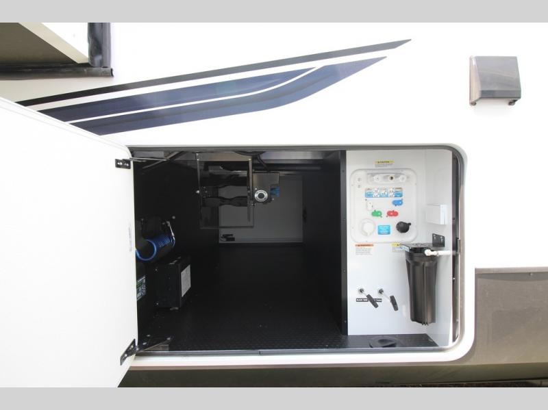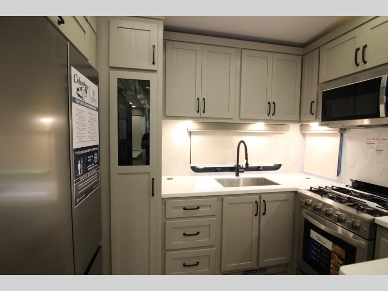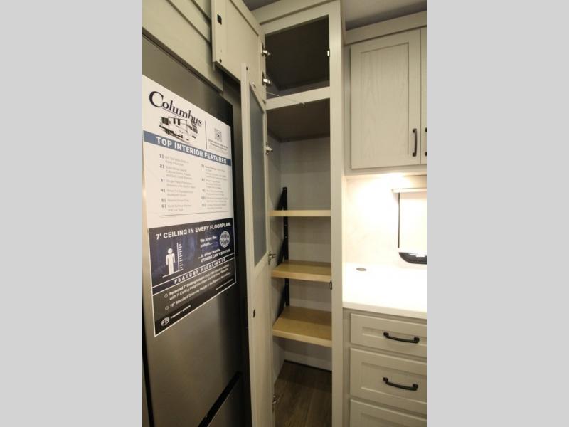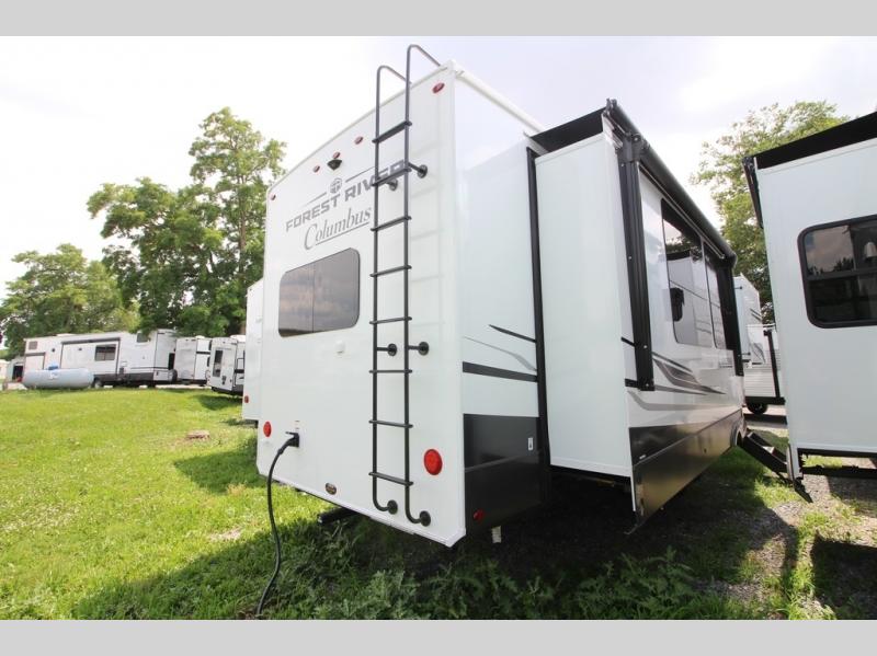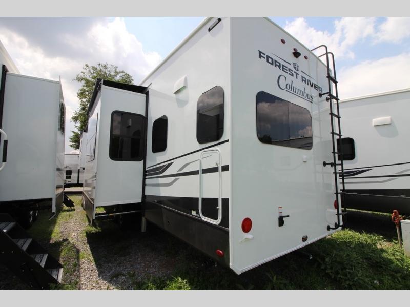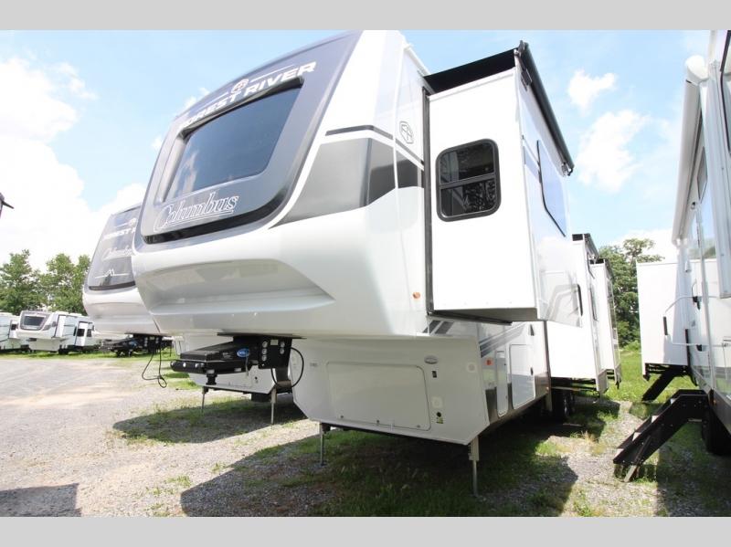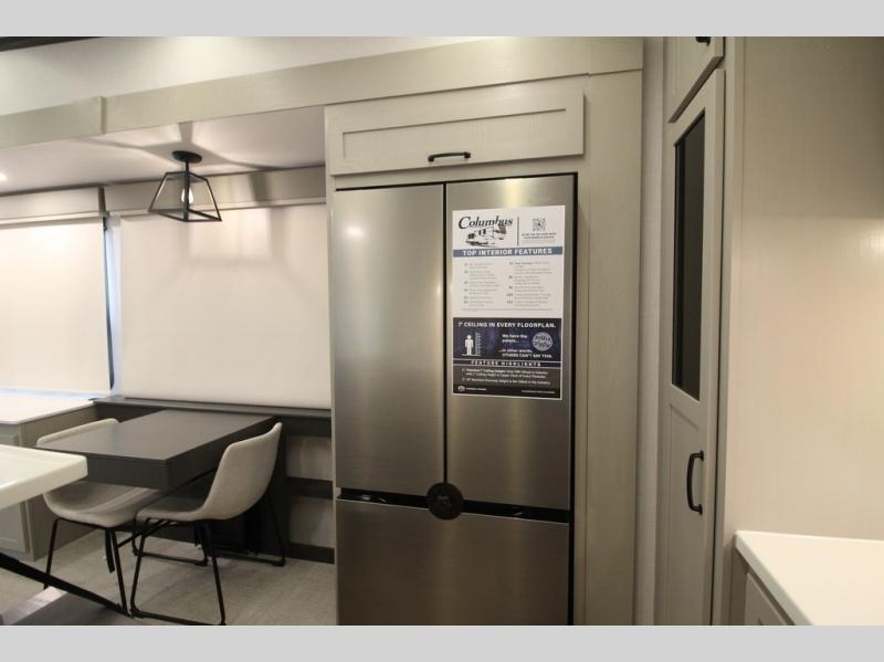 Experience a different camping life with residential furnishings and high end features in each one of these Palomino Columbus fifth wheels! The 101" wide body lets you walk around more throughout and the all-welded aluminum-frame superstructure has a snap-in ceiling molding to hold up through every adventure. Don't leave any of your gear behind either when you can easily store it in the climate controlled drop frame storage area. On the exterior, you'll find a heated utility convenience center, an outside sprayer to keep the dirt outside where it belongs, and magnetic compartment door holds to keep them from falling on you as you grab your items. Plus, there are some modern features that will really seal the deal like the Wi-Fi Booster with 4G LTE capability prep, upgraded true solid-surface countertops, power theater seating with USB charging, and a 260W solar panel for off-grid camping!