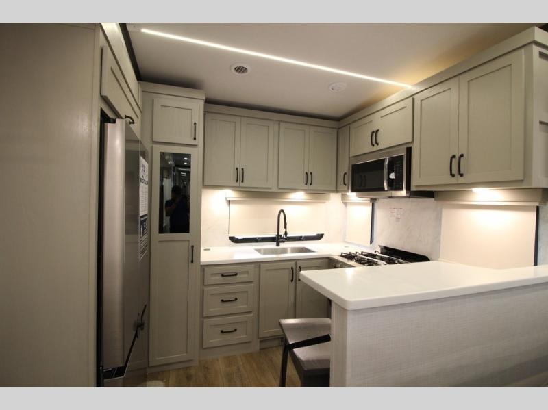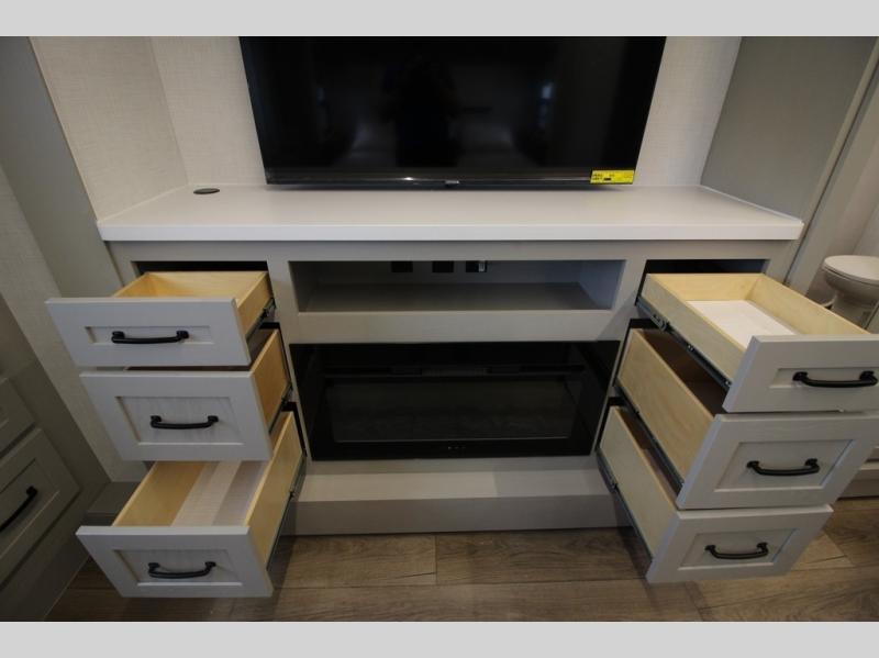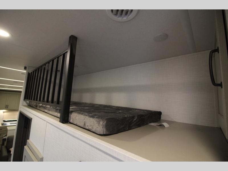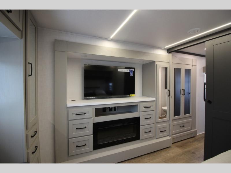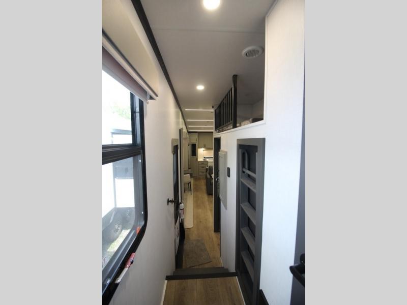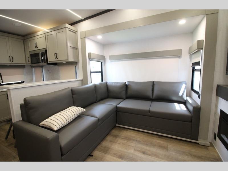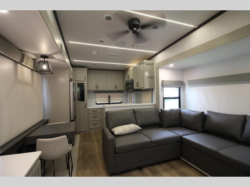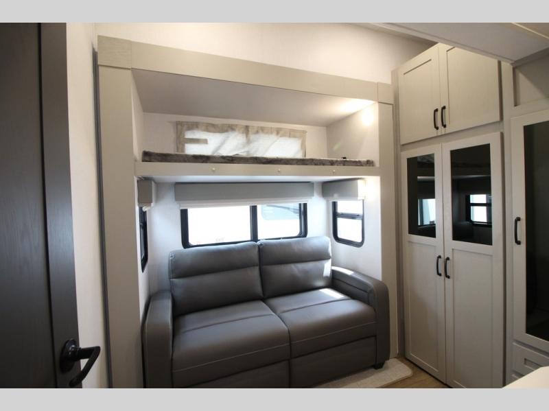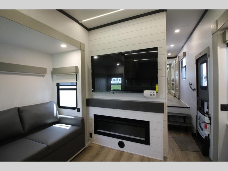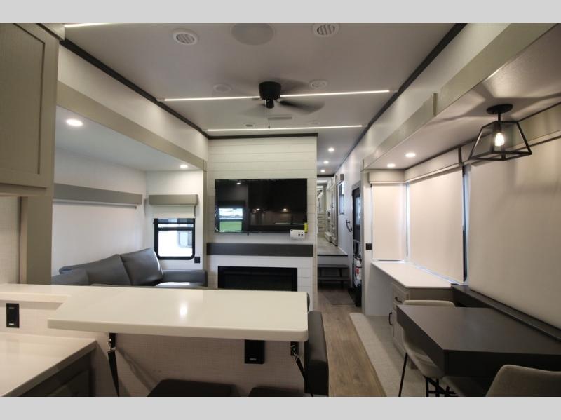 If you enjoy camping with a large group of family or friends, this fifth wheel will be perfect for you! There are five slides, giving your crew plenty of space to relax, plus there is a mid-bunk room with a tri-fold sofa, a 30" x 68" bunk, and a desk. And above this room is a 30" x 68" loft for even more sleeping or storage space. You can claim the front private bedroom all to yourselves which includes a king bed, front bench with dual wardrobes, plus a bedroom fireplace and Smart TV. Everyone can enjoy visiting together in the middle living room on the L-lounge by the entertainment center with a second fireplace. There is a table and chairs for dining space, plus a desk with a chair if you need to get some work done. And don't overlook the rear kitchen with a large refrigerator and pantry, all the appliances to make meals, plus ample counter space, including a bar top that overlooks the main living area!