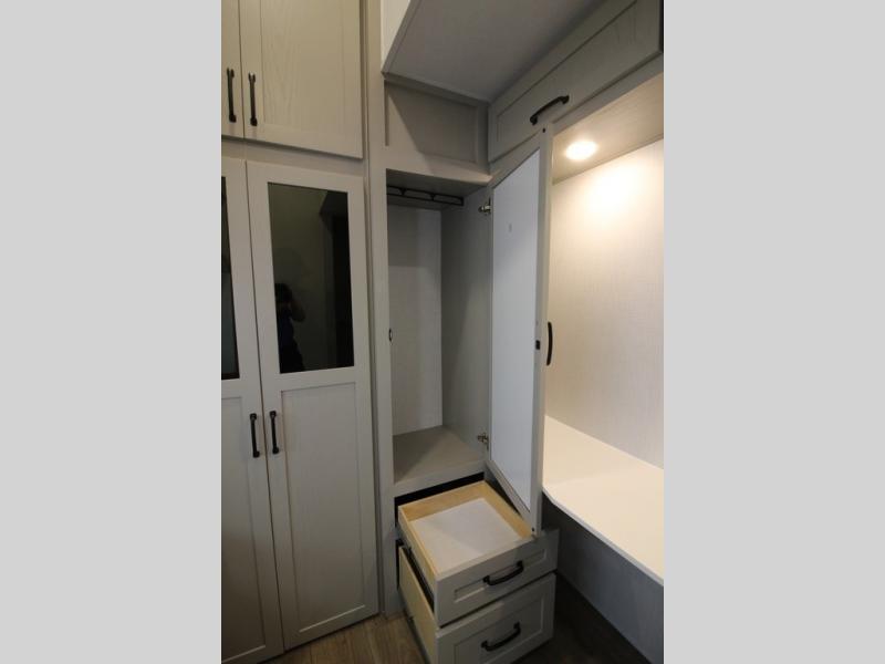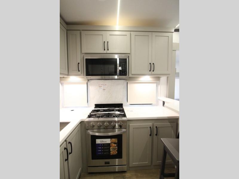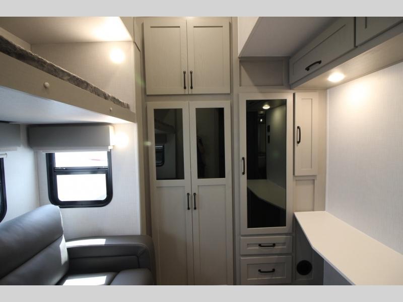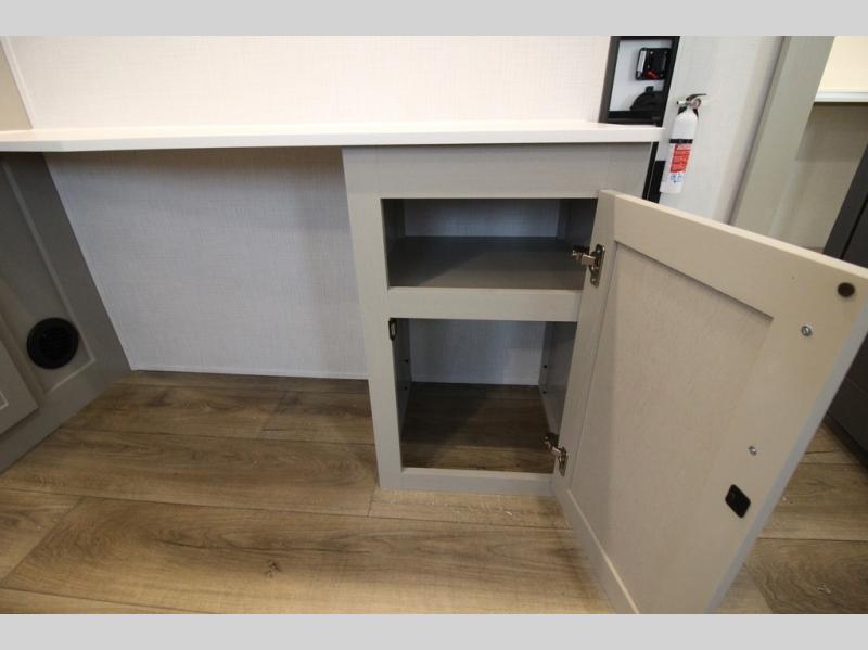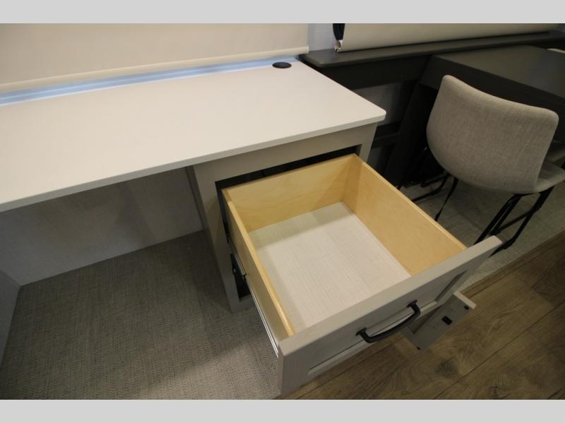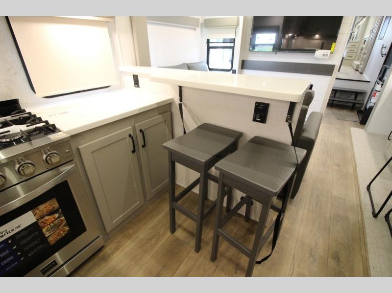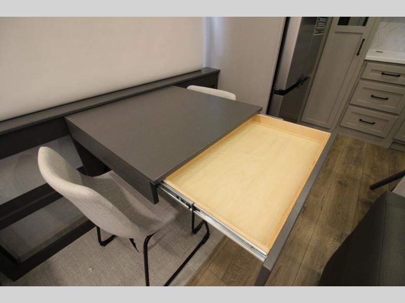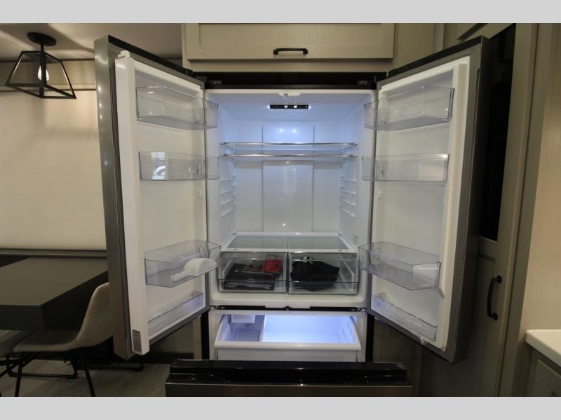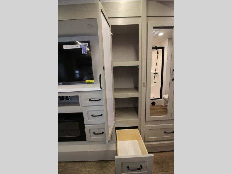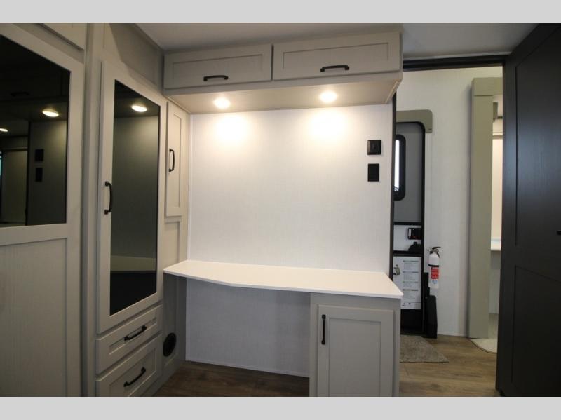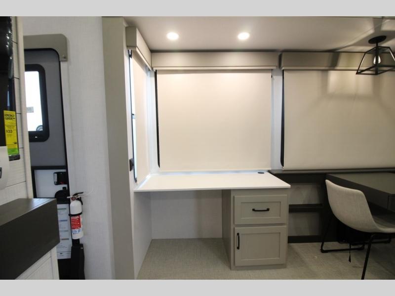 If you enjoy camping with a large group of family or friends, this fifth wheel will be perfect for you! There are five slides, giving your crew plenty of space to relax, plus there is a mid-bunk room with a tri-fold sofa, a 30" x 68" bunk, and a desk. And above this room is a 30" x 68" loft for even more sleeping or storage space. You can claim the front private bedroom all to yourselves which includes a king bed, front bench with dual wardrobes, plus a bedroom fireplace and Smart TV. Everyone can enjoy visiting together in the middle living room on the L-lounge by the entertainment center with a second fireplace. There is a table and chairs for dining space, plus a desk with a chair if you need to get some work done. And don't overlook the rear kitchen with a large refrigerator and pantry, all the appliances to make meals, plus ample counter space, including a bar top that overlooks the main living area!