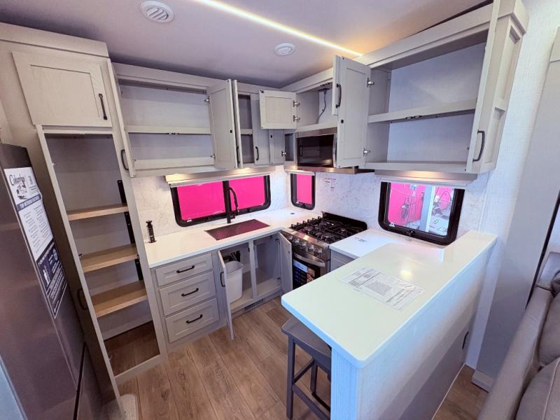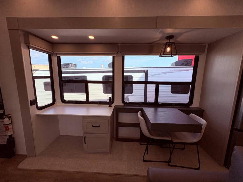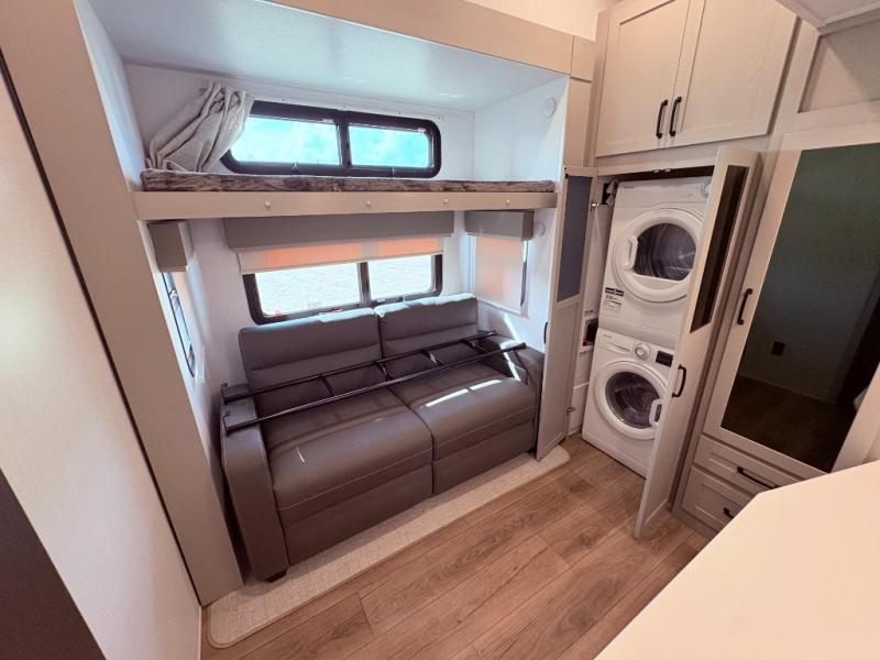 If you enjoy camping with a large group of family or friends, this fifth wheel will be perfect for you! There are five slides, giving your crew plenty of space to relax, plus there is a mid-bunk room with a tri-fold sofa, a 30" x 68" bunk, and a desk. And above this room is a 30" x 68" loft for even more sleeping or storage space. You can claim the front private bedroom all to yourselves which includes a king bed, front bench with dual wardrobes, plus a bedroom fireplace and Smart TV. Everyone can enjoy visiting together in the middle living room on the L-lounge by the entertainment center with a second fireplace. There is a table and chairs for dining space, plus a desk with a chair if you need to get some work done. And don't overlook the rear kitchen with a large refrigerator and pantry, all the appliances to make meals, plus ample counter space, including a bar top that overlooks the main living area!