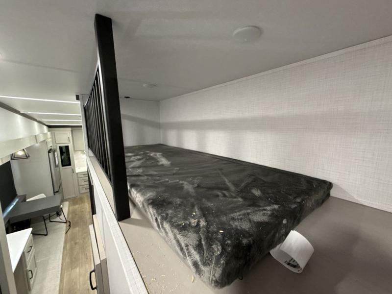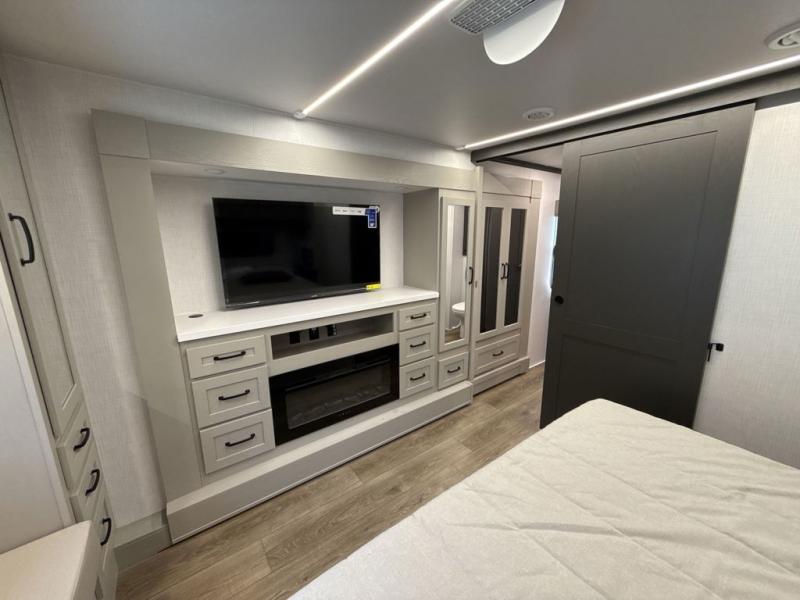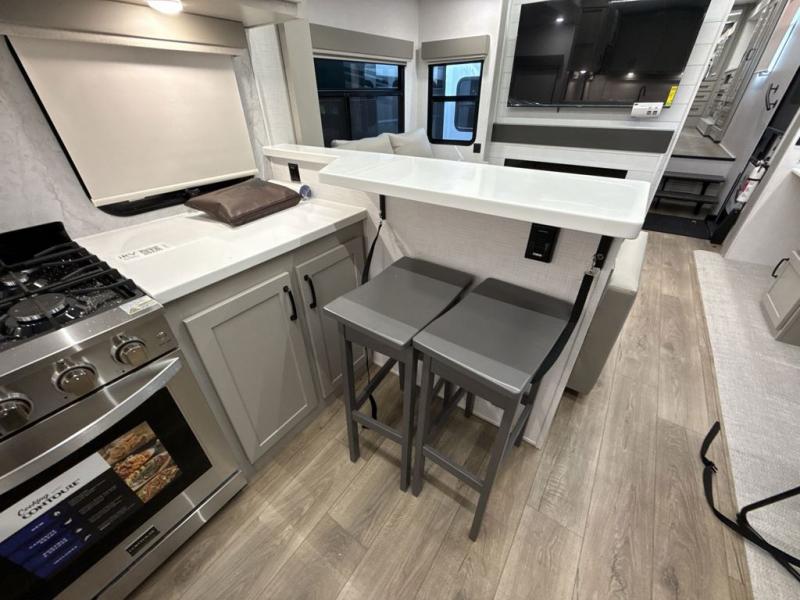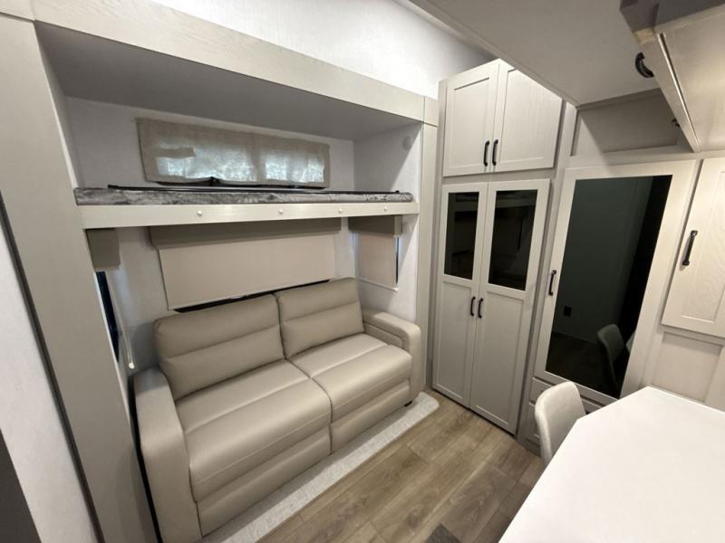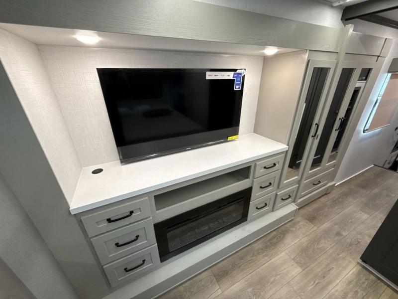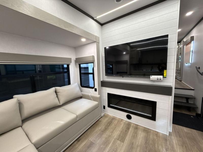 If you enjoy camping with a large group of family or friends, this fifth wheel will be perfect for you! There are five slides, giving your crew plenty of space to relax, plus there is a mid-bunk room with a tri-fold sofa, a 30" x 68" bunk, and a desk. And above this room is a 30" x 68" loft for even more sleeping or storage space. You can claim the front private bedroom all to yourselves which includes a king bed, front bench with dual wardrobes, plus a bedroom fireplace and Smart TV. Everyone can enjoy visiting together in the middle living room on the L-lounge by the entertainment center with a second fireplace. There is a table and chairs for dining space, plus a desk with a chair if you need to get some work done. And don't overlook the rear kitchen with a large refrigerator and pantry, all the appliances to make meals, plus ample counter space, including a bar top that overlooks the main living area!