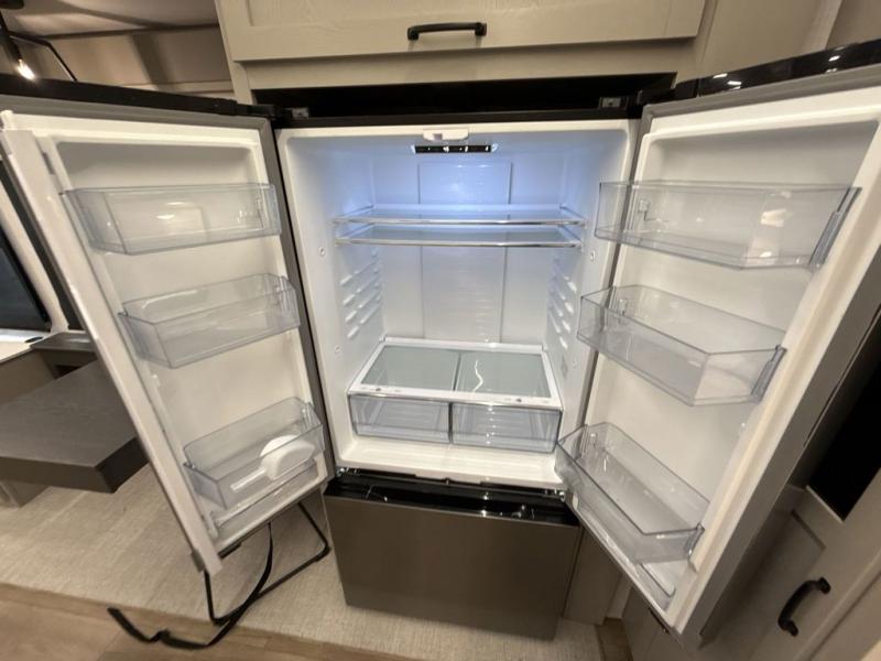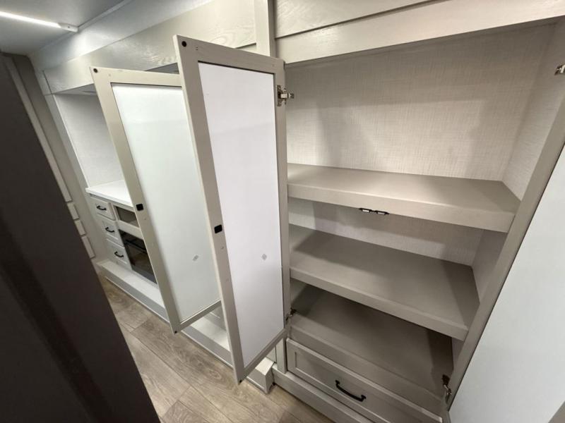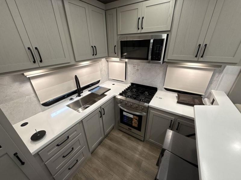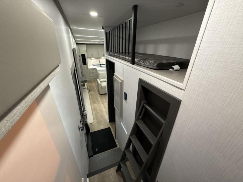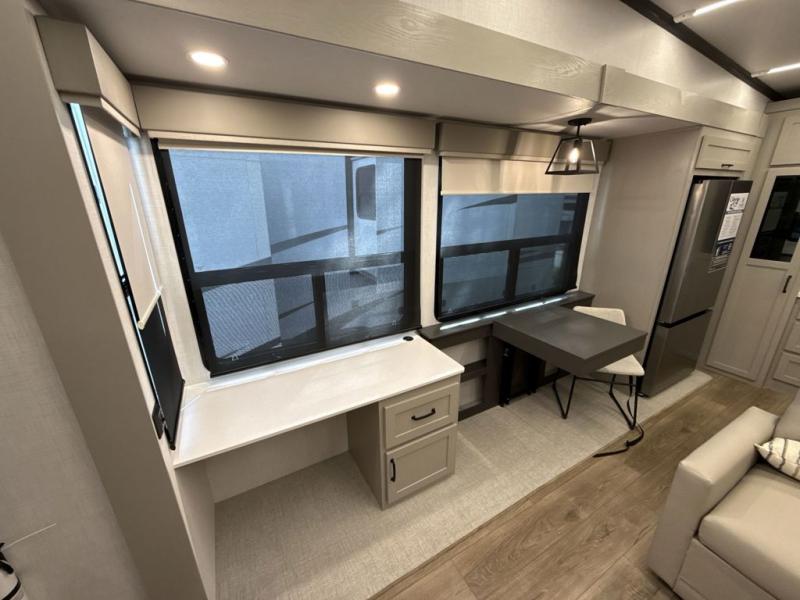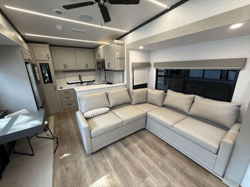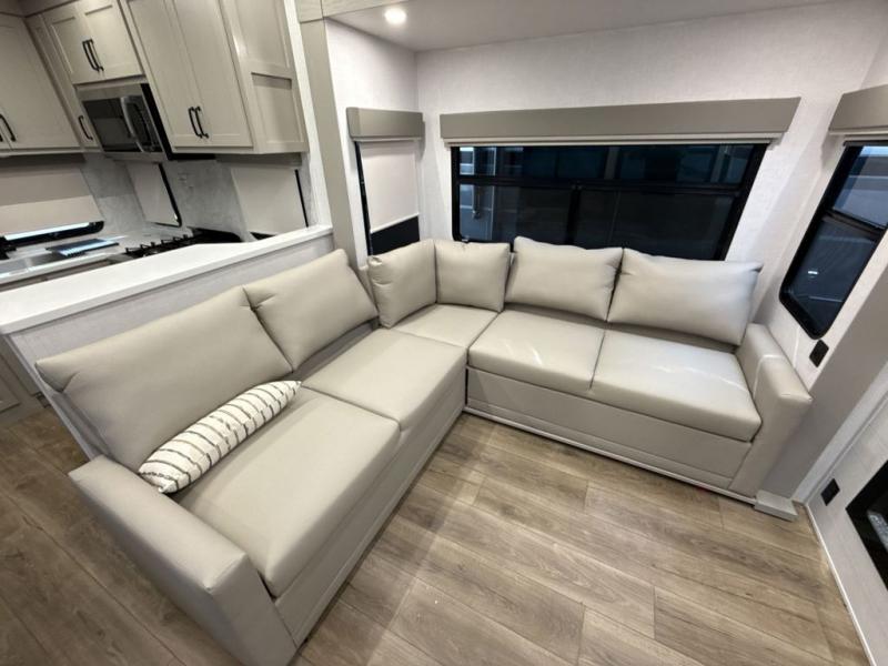 If you enjoy camping with a large group of family or friends, this fifth wheel will be perfect for you! There are five slides, giving your crew plenty of space to relax, plus there is a mid-bunk room with a tri-fold sofa, a 30" x 68" bunk, and a desk. And above this room is a 30" x 68" loft for even more sleeping or storage space. You can claim the front private bedroom all to yourselves which includes a king bed, front bench with dual wardrobes, plus a bedroom fireplace and Smart TV. Everyone can enjoy visiting together in the middle living room on the L-lounge by the entertainment center with a second fireplace. There is a table and chairs for dining space, plus a desk with a chair if you need to get some work done. And don't overlook the rear kitchen with a large refrigerator and pantry, all the appliances to make meals, plus ample counter space, including a bar top that overlooks the main living area!