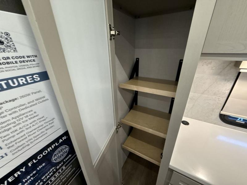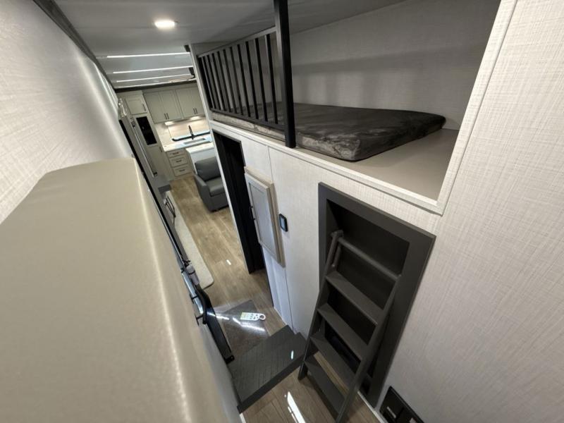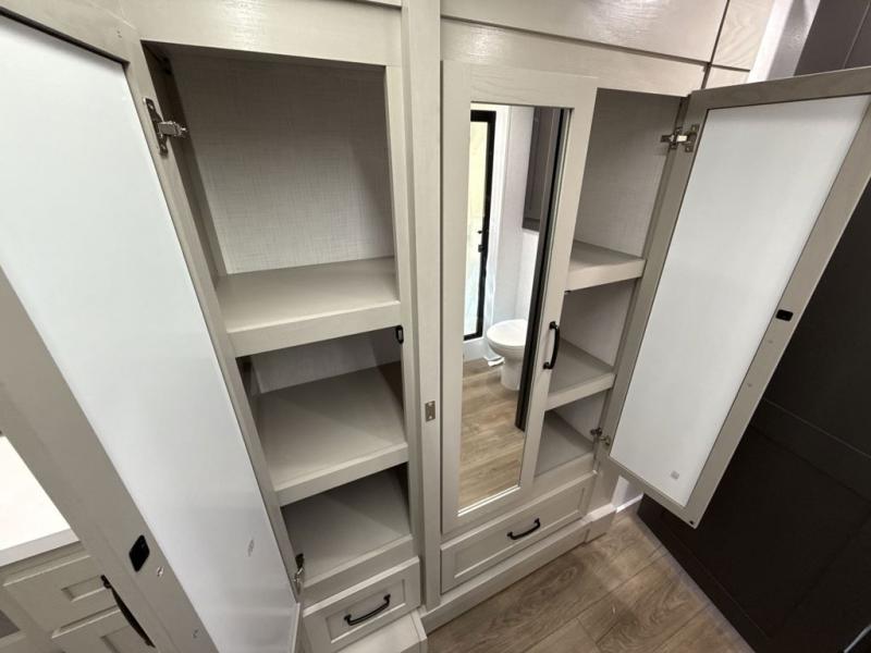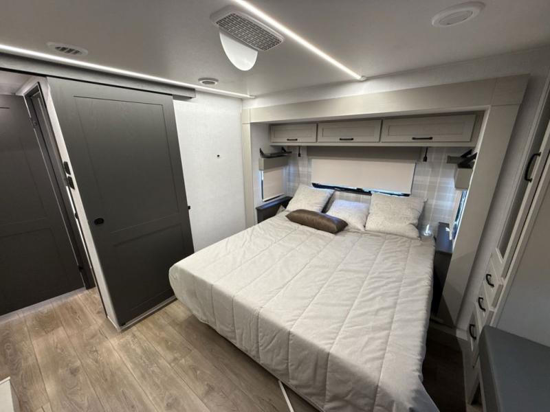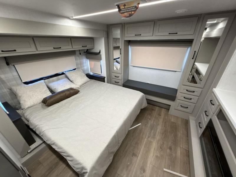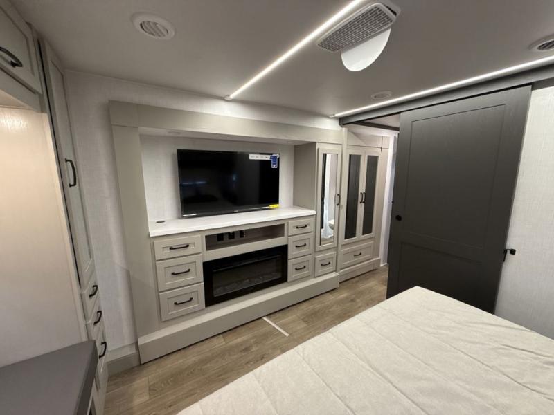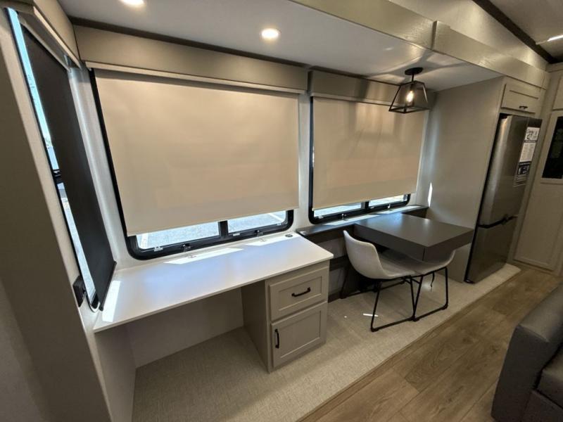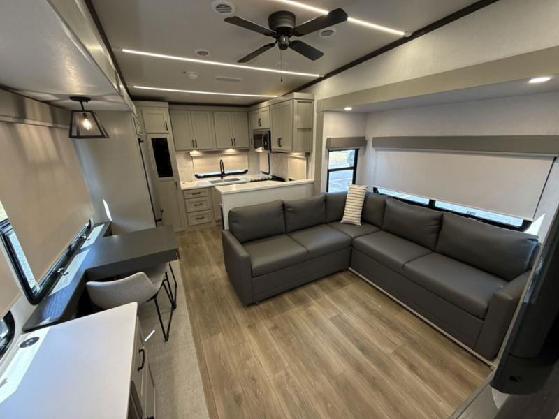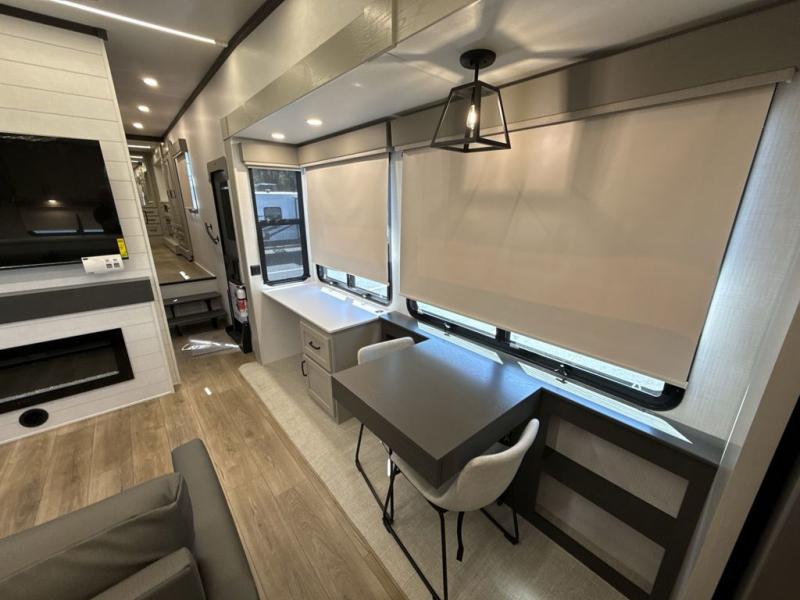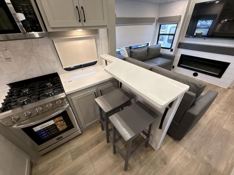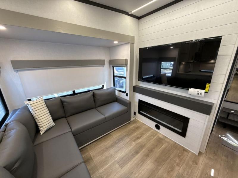If you enjoy camping with a large group of family or friends, this fifth wheel will be perfect for you! There are five slides, giving your crew plenty of space to relax, plus there is a mid-bunk room with a tri-fold sofa, a 30" x 68" bunk, and a desk. And above this room is a 30" x 68" loft for even more sleeping or storage space. You can claim the front private bedroom all to yourselves which includes a king bed, front bench with dual wardrobes, plus a bedroom fireplace and Smart TV. Everyone can enjoy visiting together in the middle living room on the L-lounge by the entertainment center with a second fireplace. There is a table and chairs for dining space, plus a desk with a chair if you need to get some work done. And don't overlook the rear kitchen with a large refrigerator and pantry, all the appliances to make meals, plus ample counter space, including a bar top that overlooks the main living area!