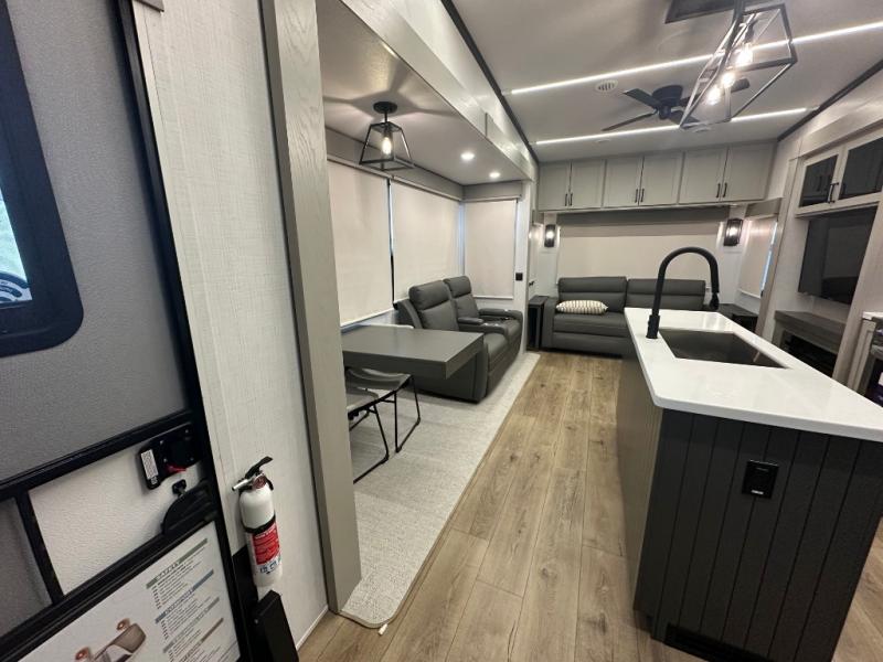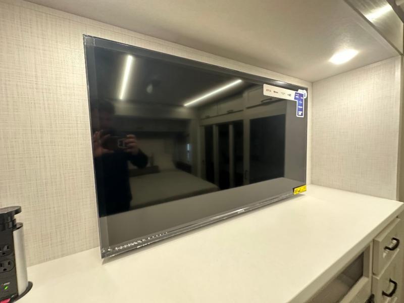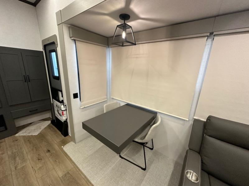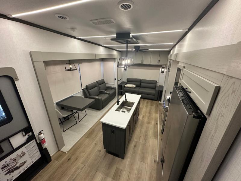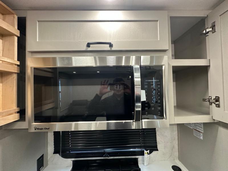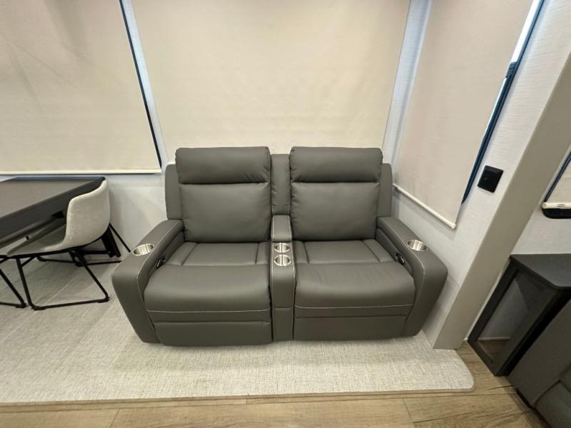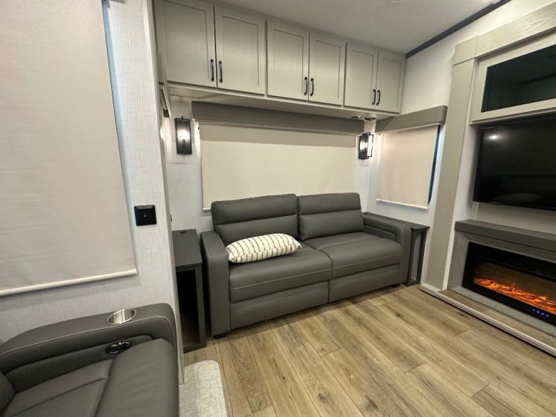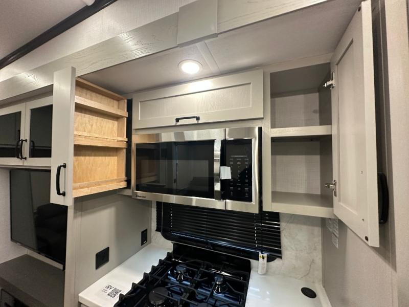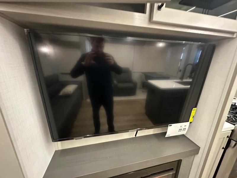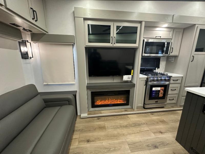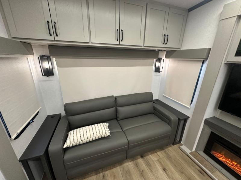 It won't be hard to fall in love with this fifth wheel that can sleep four each night! There are dual opposing slides in the bedroom and in the combined kitchen and living area for maximum space to relax! You will love evenings spent in the rear living area on the theater seat across from the 50" Smart TV, and there is a sofa sleeper to let guests stay over. A four burner gas cooktop and residential style stainless steel microwave will let you cook meals each day, and the table with chairs will be the perfect place to dine together. Head to the full bath that includes a shower with a seat to easily clean up, then head off to bed in the front private bedroom. Here, you'll find a king bed slide out, a bedroom Smart TV, plus a spacious wardrobe with a shelf. There is even washer and dryer prep if you want the option to make full-time RVing easier!