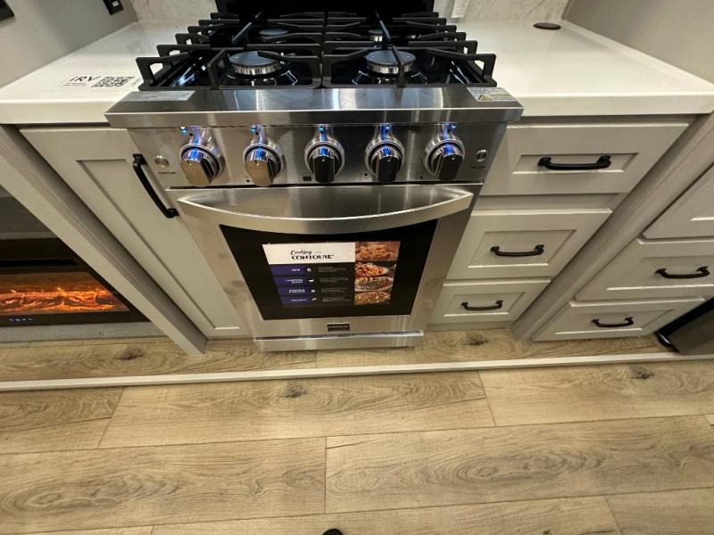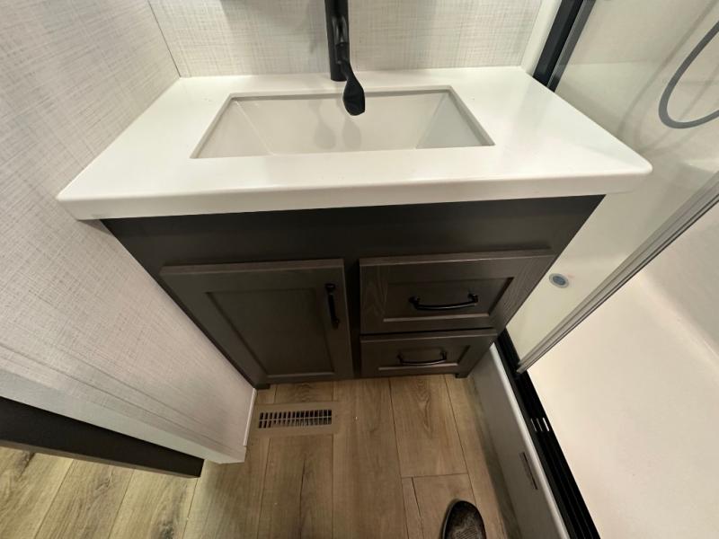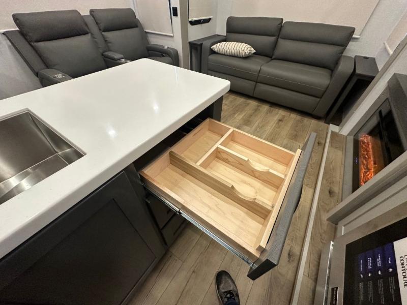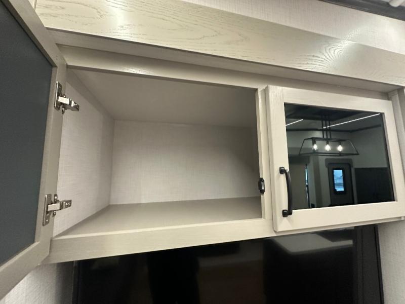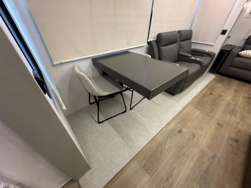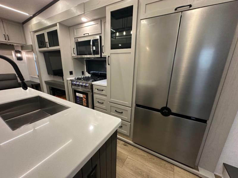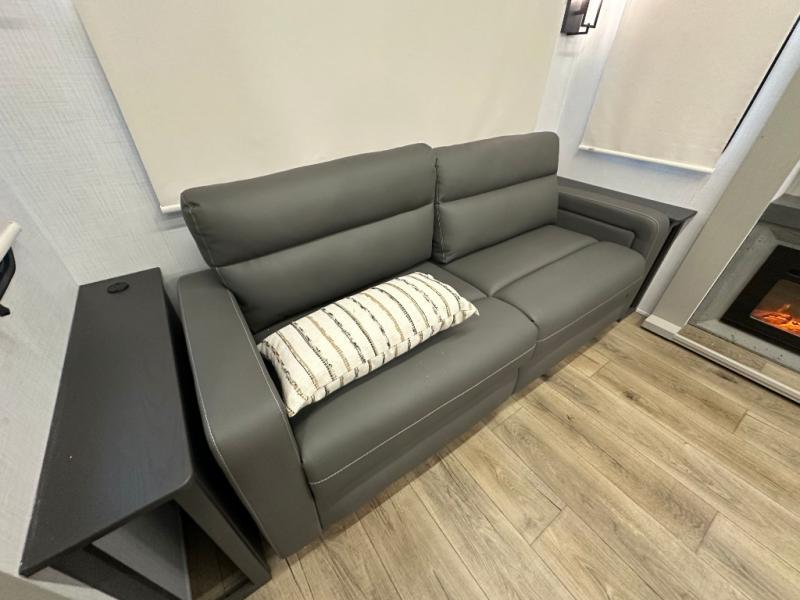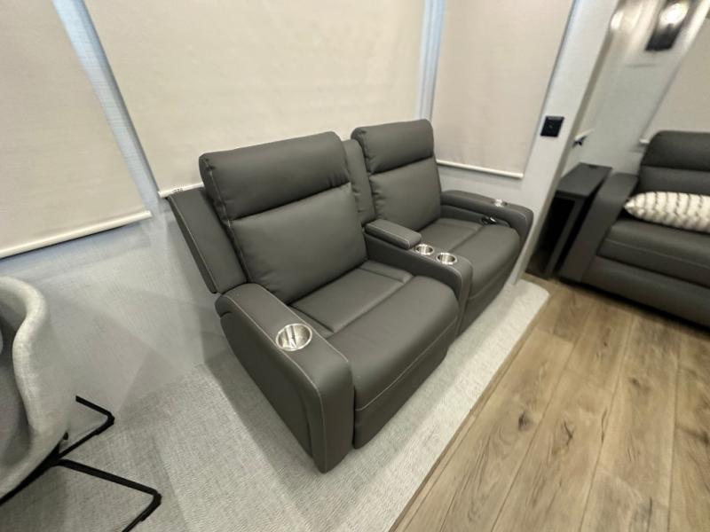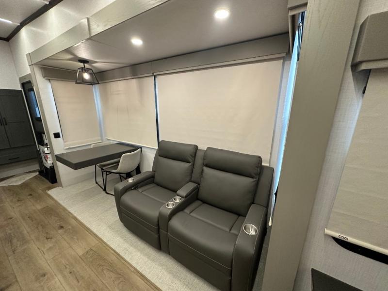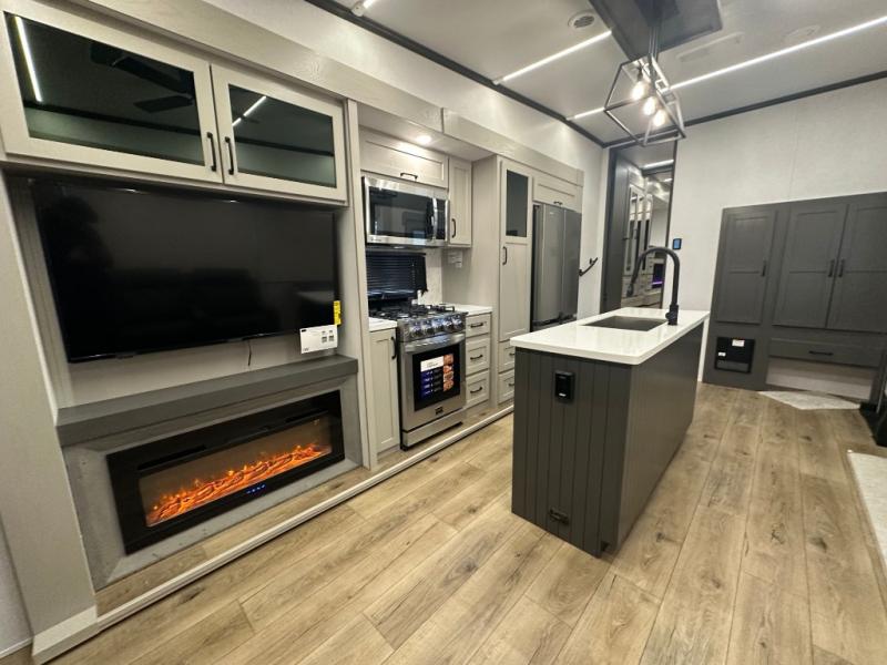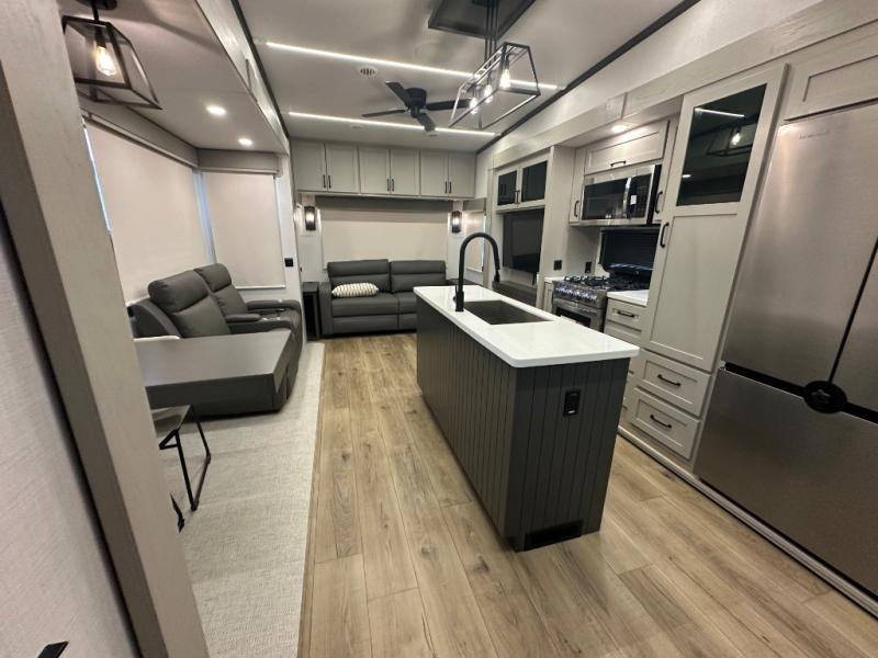 It won't be hard to fall in love with this fifth wheel that can sleep four each night! There are dual opposing slides in the bedroom and in the combined kitchen and living area for maximum space to relax! You will love evenings spent in the rear living area on the theater seat across from the 50" Smart TV, and there is a sofa sleeper to let guests stay over. A four burner gas cooktop and residential style stainless steel microwave will let you cook meals each day, and the table with chairs will be the perfect place to dine together. Head to the full bath that includes a shower with a seat to easily clean up, then head off to bed in the front private bedroom. Here, you'll find a king bed slide out, a bedroom Smart TV, plus a spacious wardrobe with a shelf. There is even washer and dryer prep if you want the option to make full-time RVing easier!