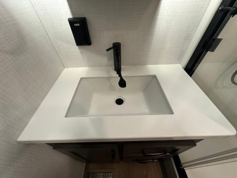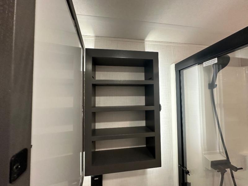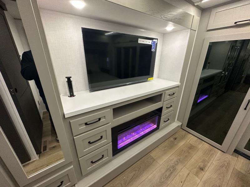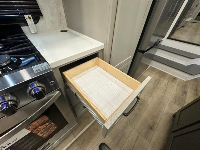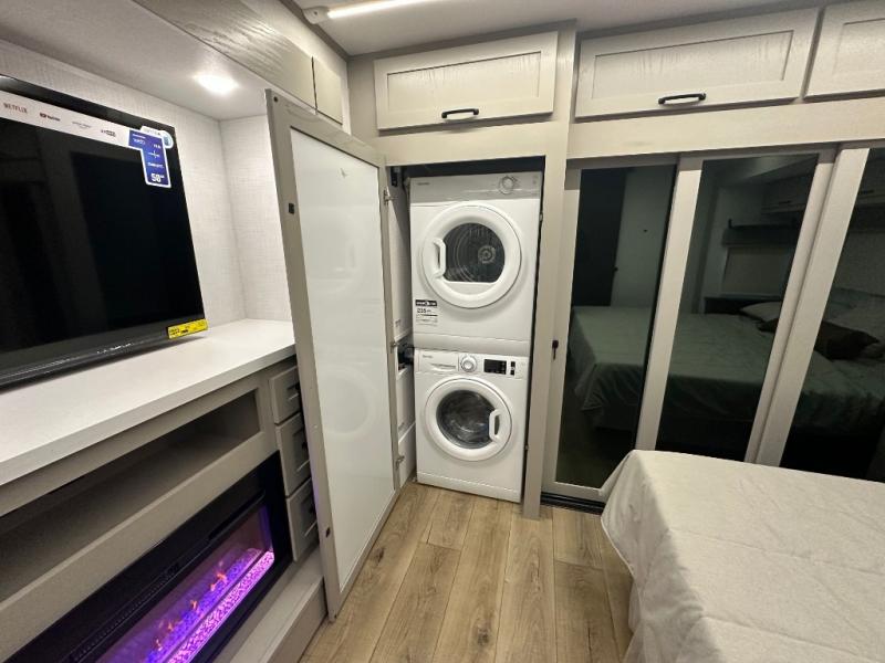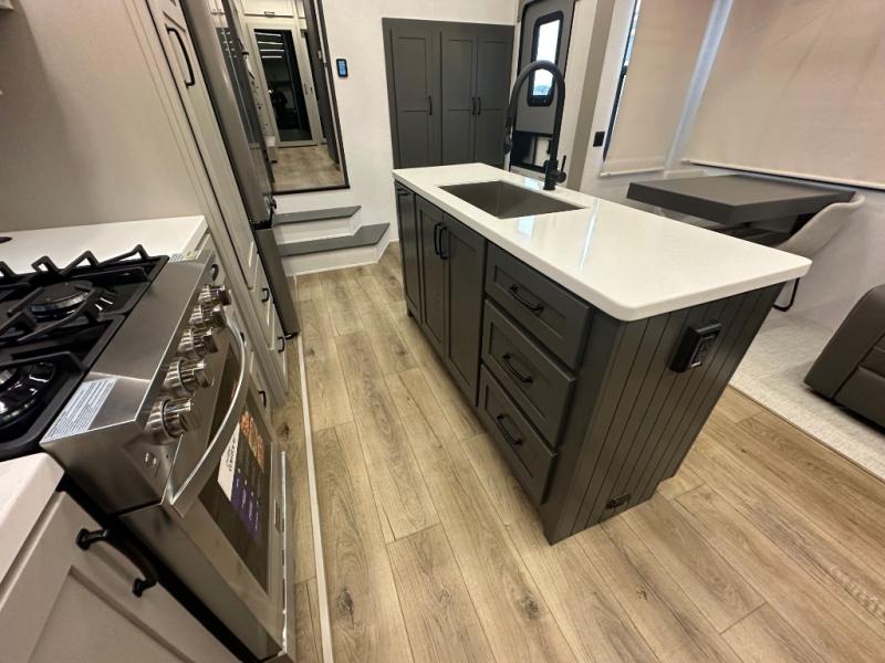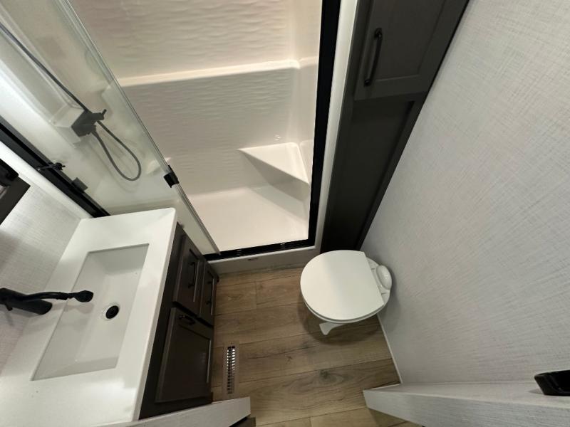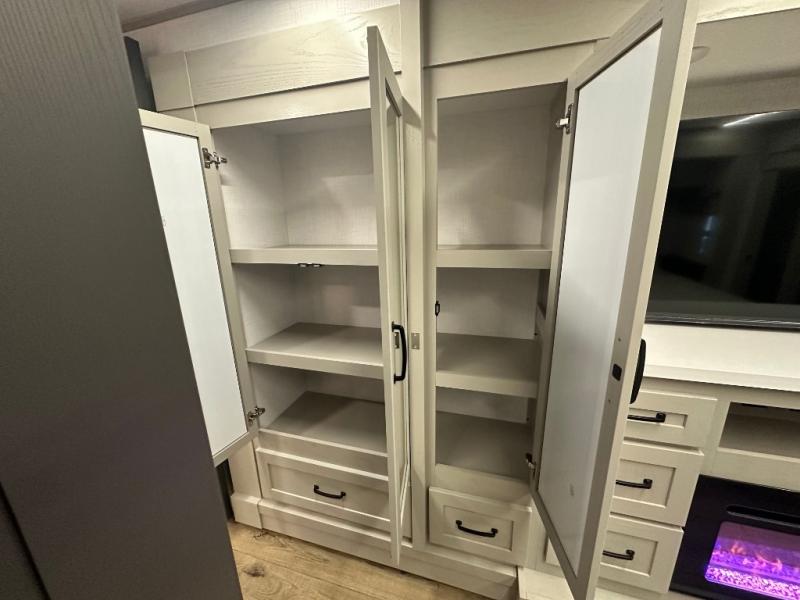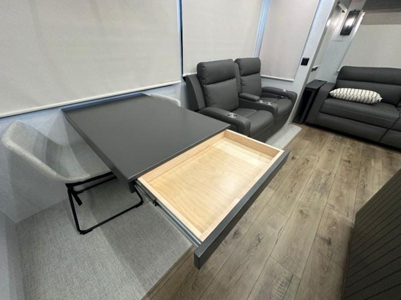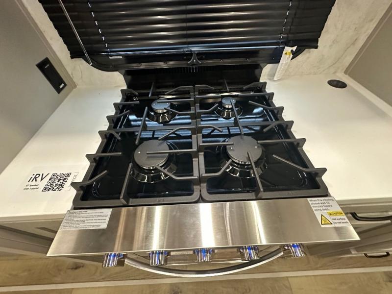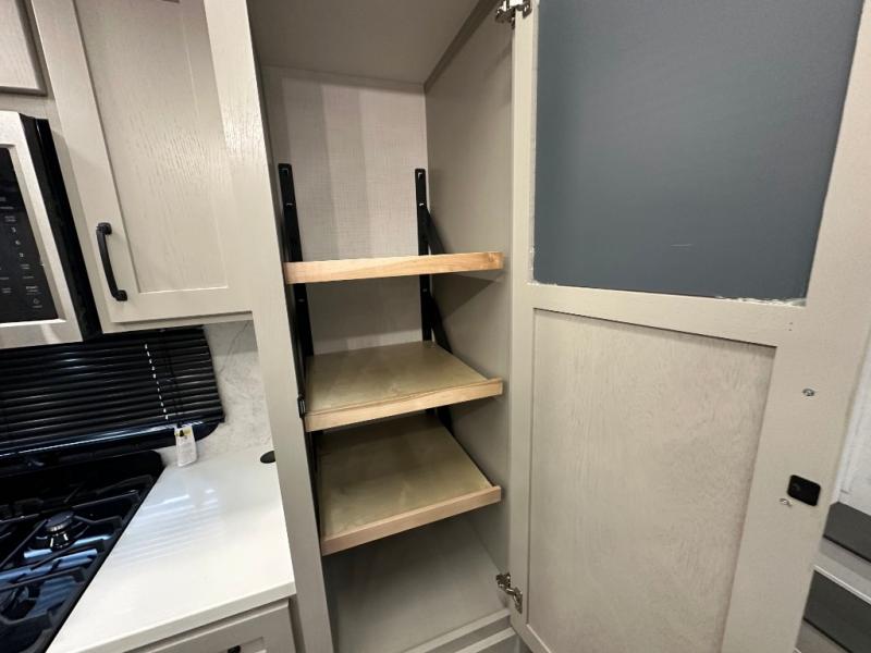 It won't be hard to fall in love with this fifth wheel that can sleep four each night! There are dual opposing slides in the bedroom and in the combined kitchen and living area for maximum space to relax! You will love evenings spent in the rear living area on the theater seat across from the 50" Smart TV, and there is a sofa sleeper to let guests stay over. A four burner gas cooktop and residential style stainless steel microwave will let you cook meals each day, and the table with chairs will be the perfect place to dine together. Head to the full bath that includes a shower with a seat to easily clean up, then head off to bed in the front private bedroom. Here, you'll find a king bed slide out, a bedroom Smart TV, plus a spacious wardrobe with a shelf. There is even washer and dryer prep if you want the option to make full-time RVing easier!