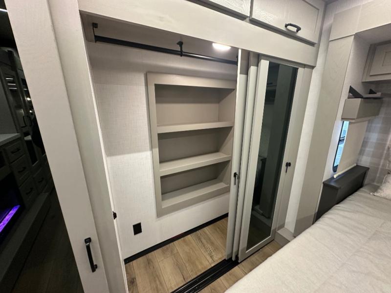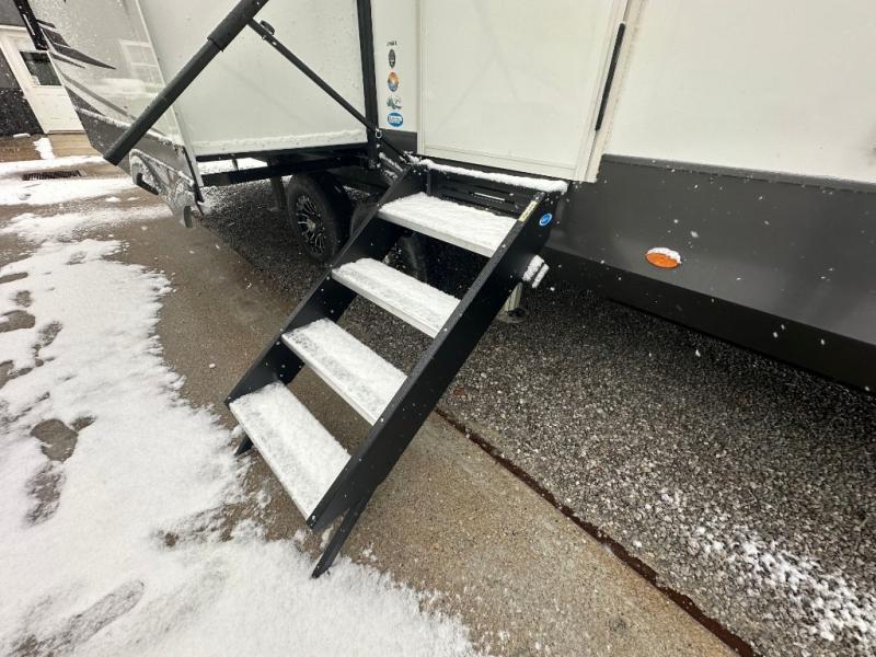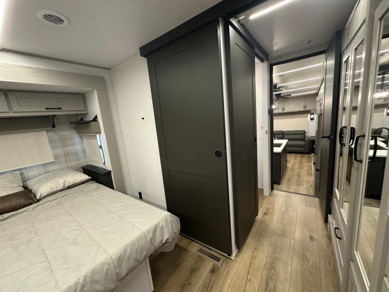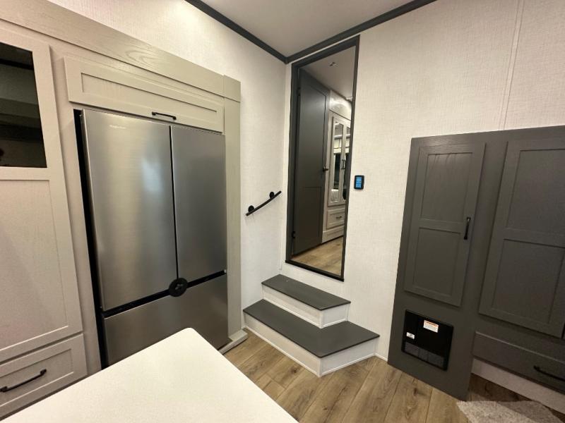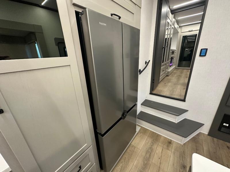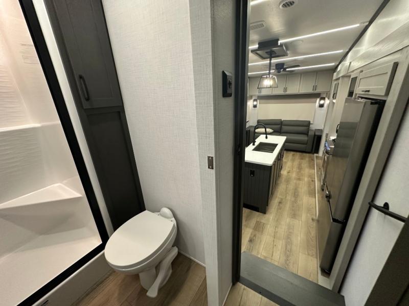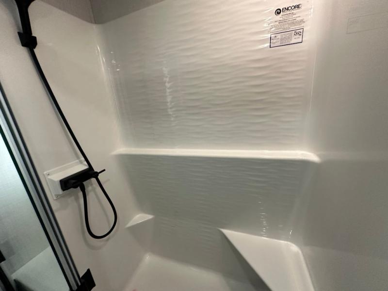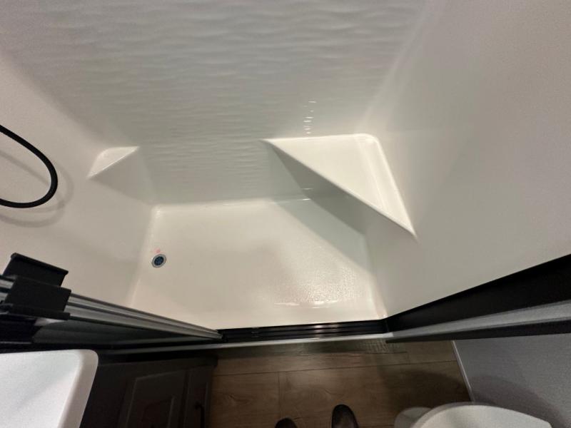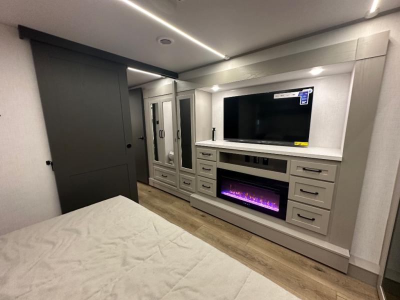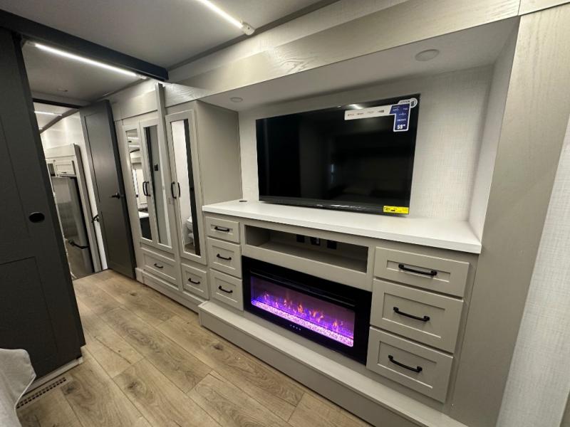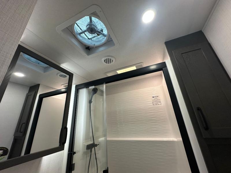 It won't be hard to fall in love with this fifth wheel that can sleep four each night! There are dual opposing slides in the bedroom and in the combined kitchen and living area for maximum space to relax! You will love evenings spent in the rear living area on the theater seat across from the 50" Smart TV, and there is a sofa sleeper to let guests stay over. A four burner gas cooktop and residential style stainless steel microwave will let you cook meals each day, and the table with chairs will be the perfect place to dine together. Head to the full bath that includes a shower with a seat to easily clean up, then head off to bed in the front private bedroom. Here, you'll find a king bed slide out, a bedroom Smart TV, plus a spacious wardrobe with a shelf. There is even washer and dryer prep if you want the option to make full-time RVing easier!