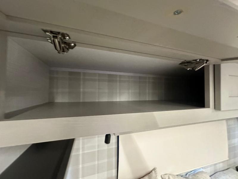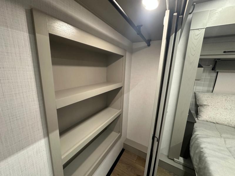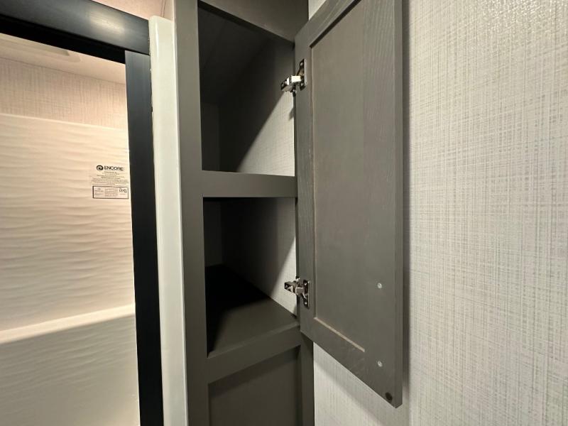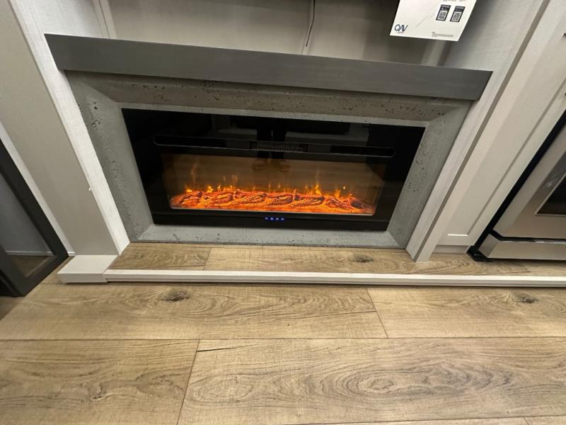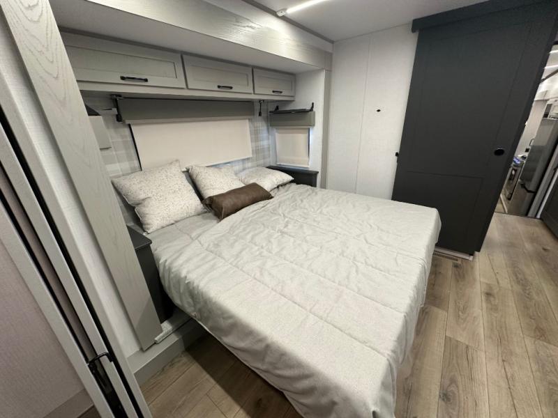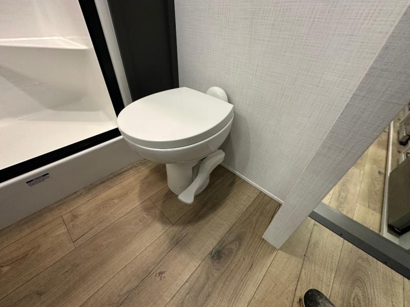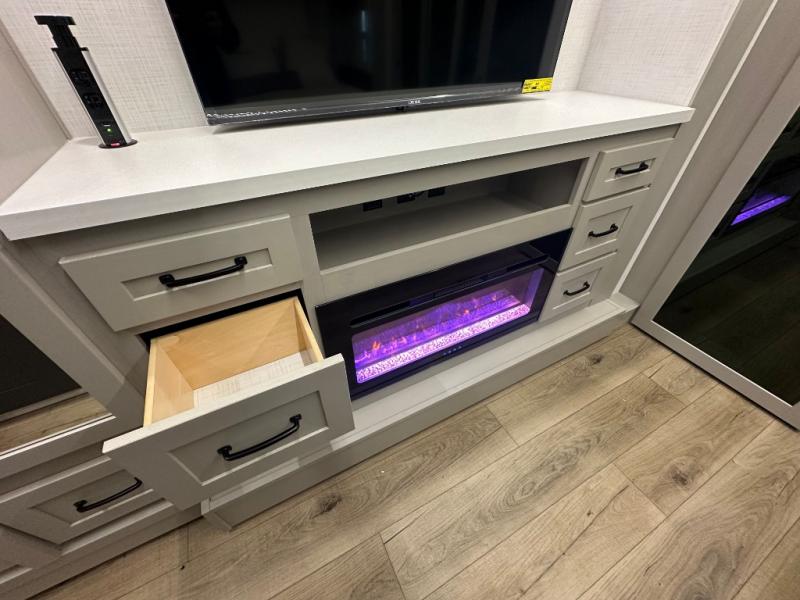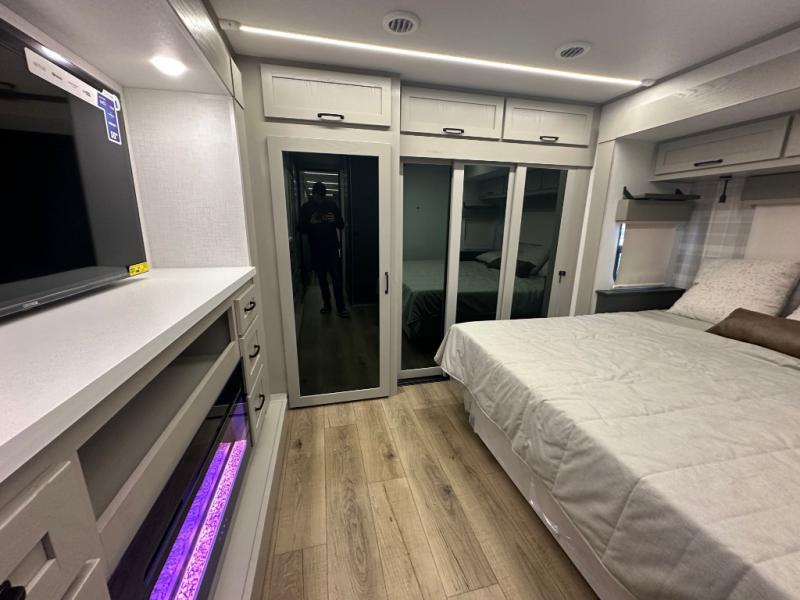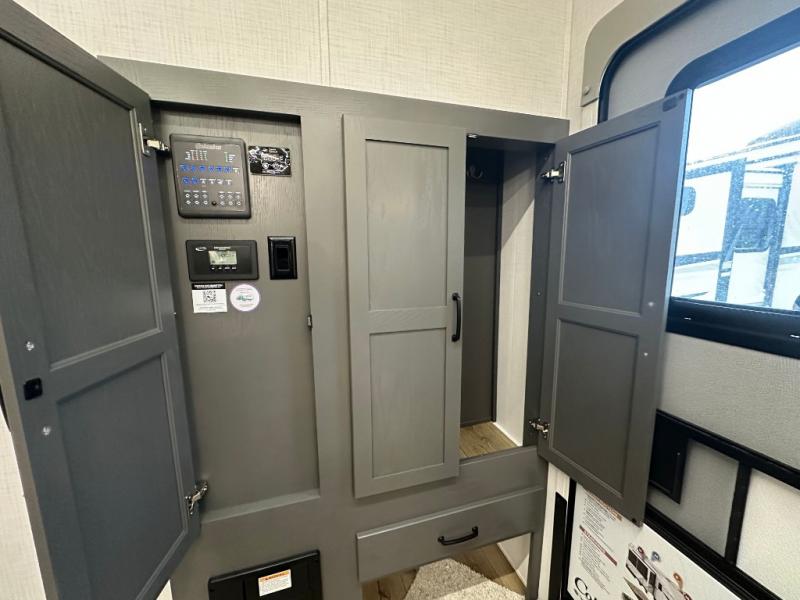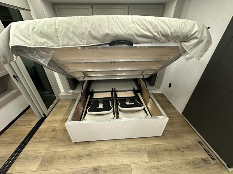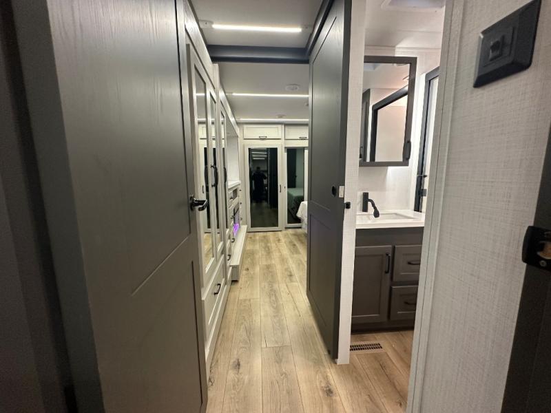 It won't be hard to fall in love with this fifth wheel that can sleep four each night! There are dual opposing slides in the bedroom and in the combined kitchen and living area for maximum space to relax! You will love evenings spent in the rear living area on the theater seat across from the 50" Smart TV, and there is a sofa sleeper to let guests stay over. A four burner gas cooktop and residential style stainless steel microwave will let you cook meals each day, and the table with chairs will be the perfect place to dine together. Head to the full bath that includes a shower with a seat to easily clean up, then head off to bed in the front private bedroom. Here, you'll find a king bed slide out, a bedroom Smart TV, plus a spacious wardrobe with a shelf. There is even washer and dryer prep if you want the option to make full-time RVing easier!