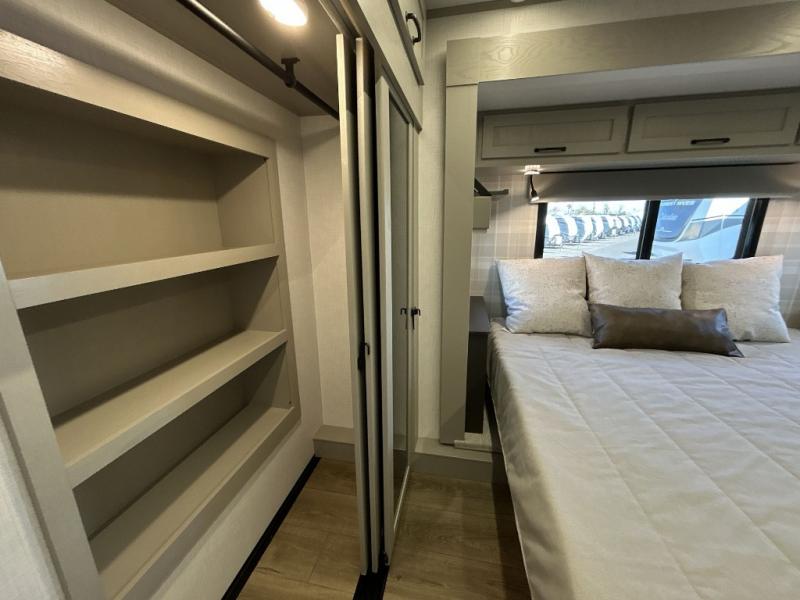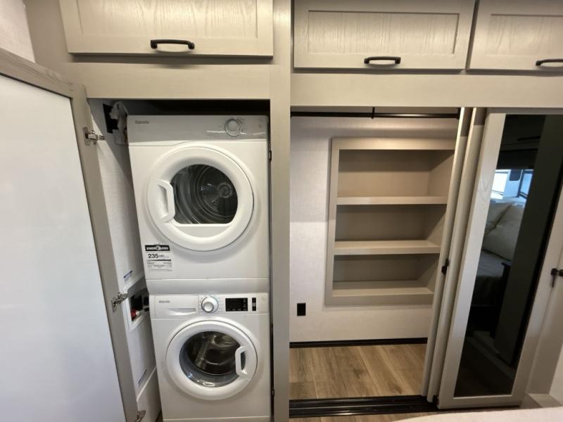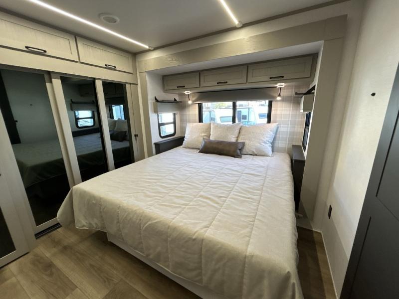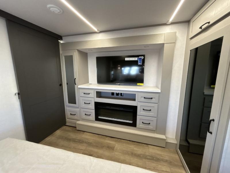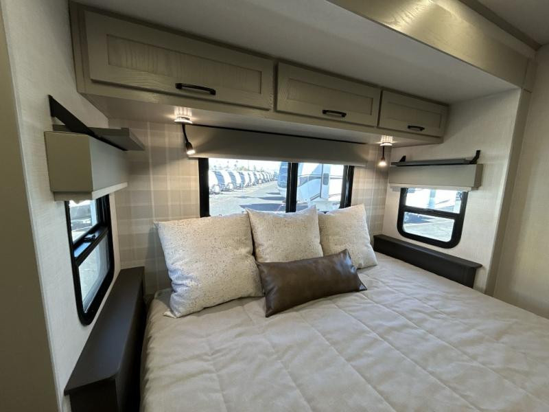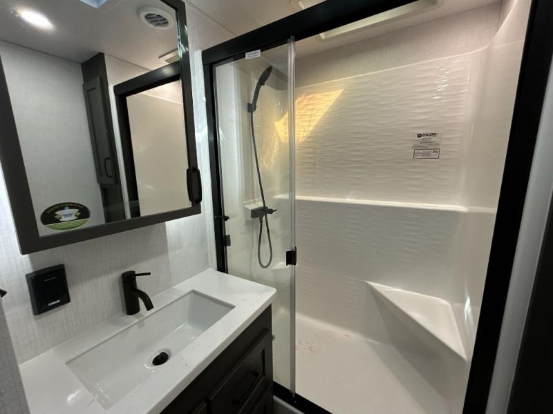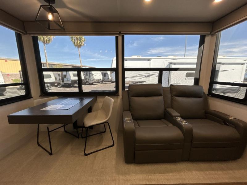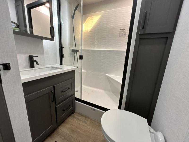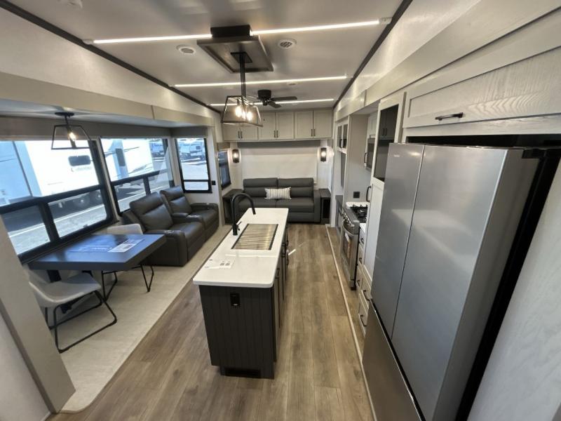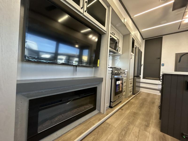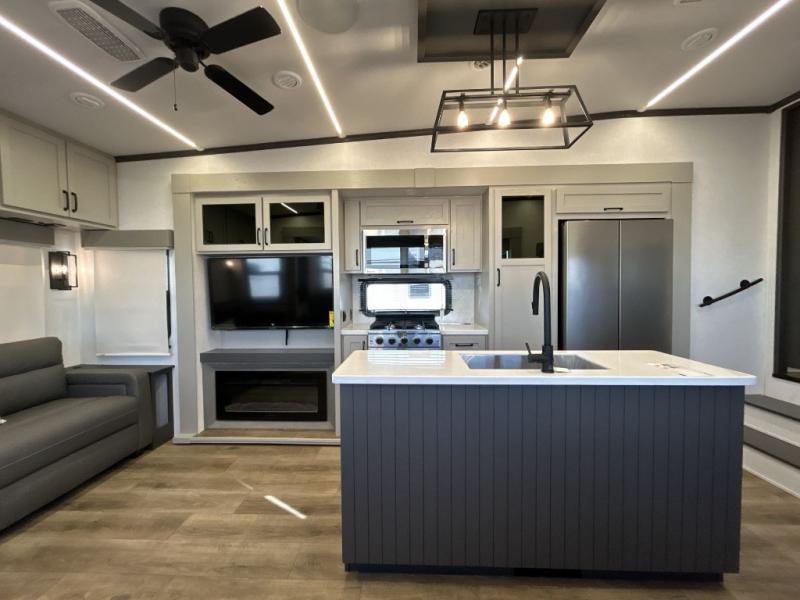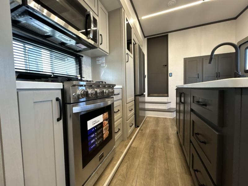 It won't be hard to fall in love with this fifth wheel that can sleep four each night! There are dual opposing slides in the bedroom and in the combined kitchen and living area for maximum space to relax! You will love evenings spent in the rear living area on the theater seat across from the 50" Smart TV, and there is a sofa sleeper to let guests stay over. A four burner gas cooktop and residential style stainless steel microwave will let you cook meals each day, and the table with chairs will be the perfect place to dine together. Head to the full bath that includes a shower with a seat to easily clean up, then head off to bed in the front private bedroom. Here, you'll find a king bed slide out, a bedroom Smart TV, plus a spacious wardrobe with a shelf.