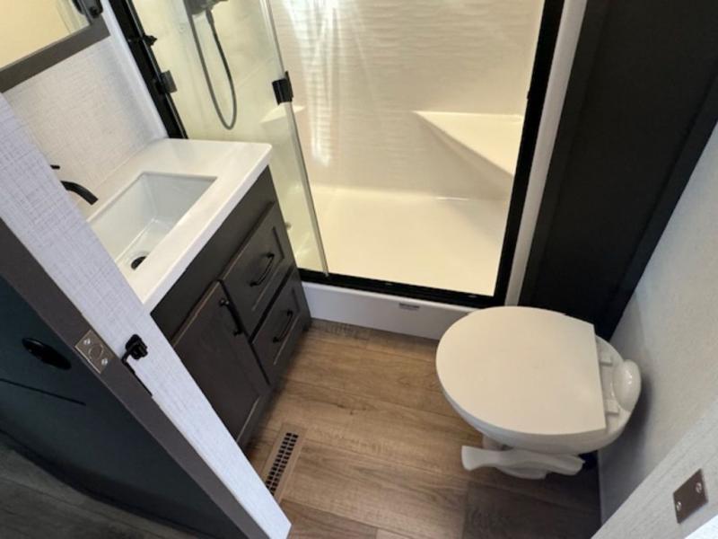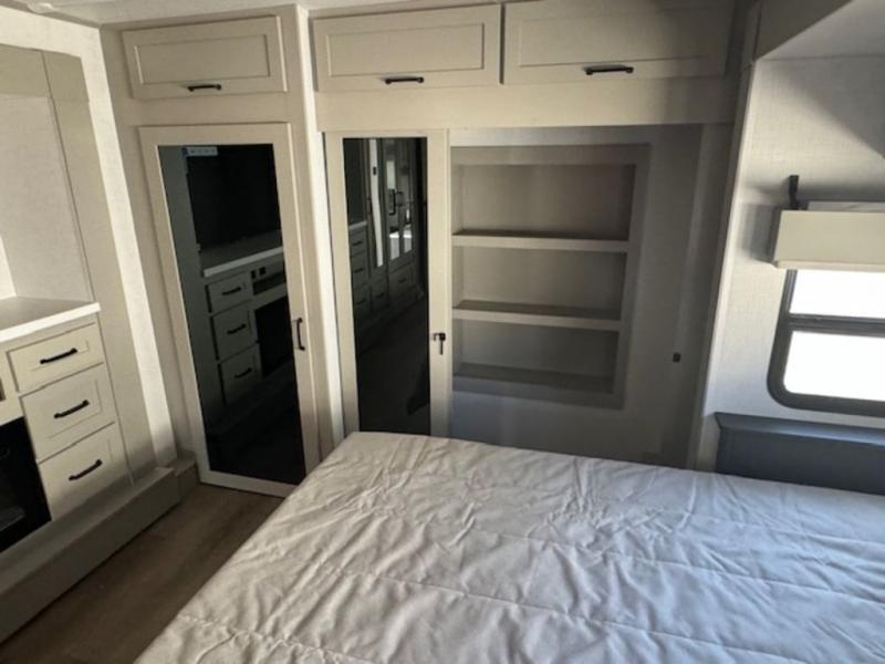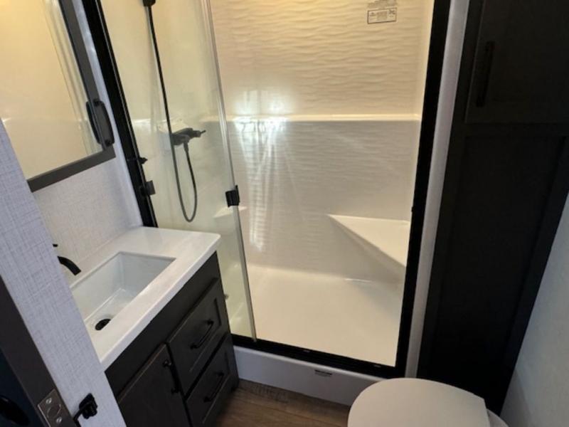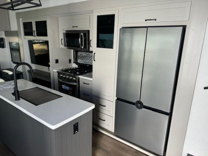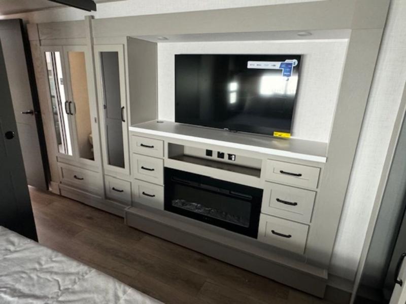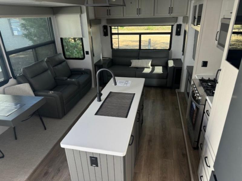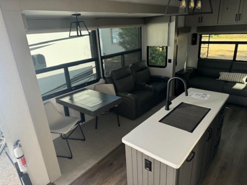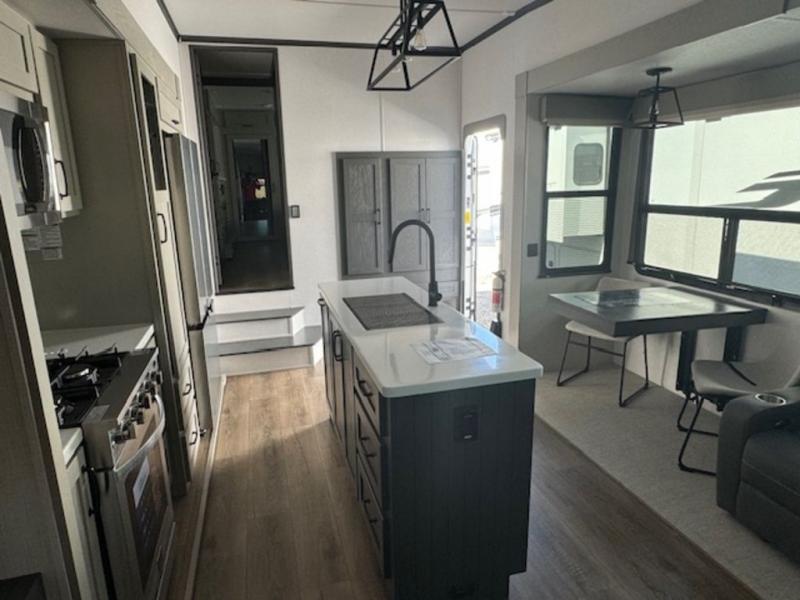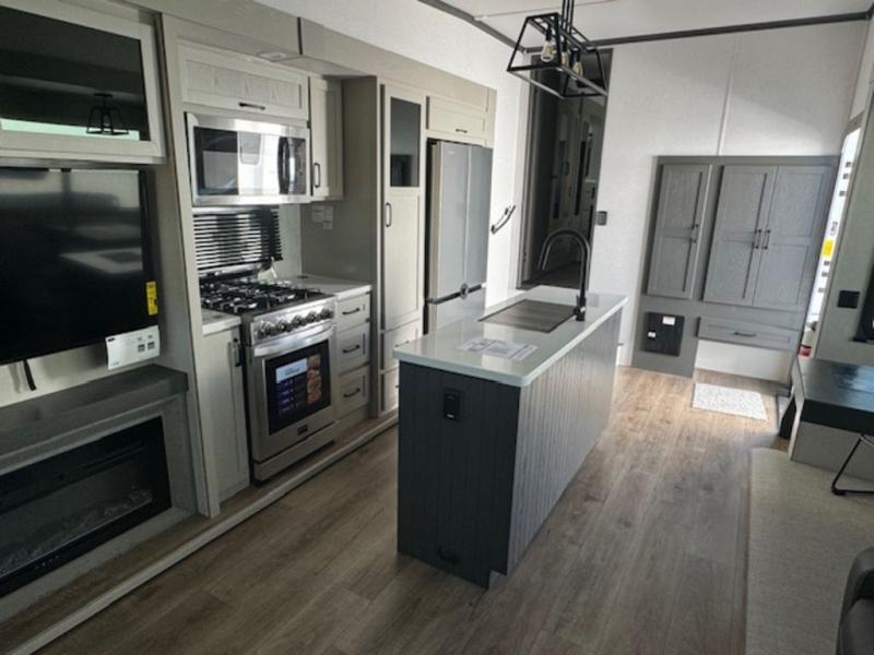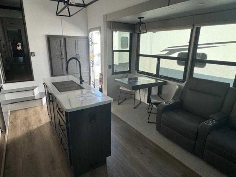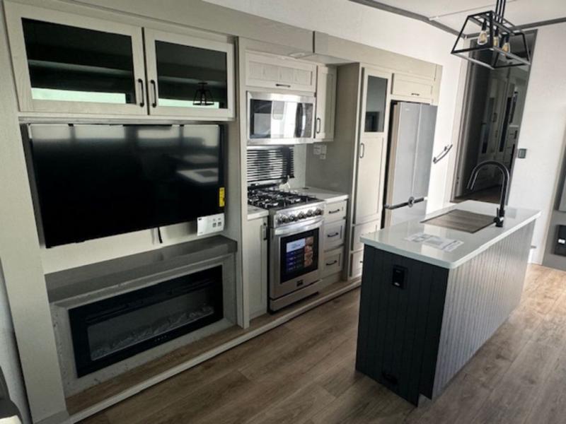 It won't be hard to fall in love with this fifth wheel that can sleep four each night! There are dual opposing slides in the bedroom and in the combined kitchen and living area for maximum space to relax! You will love evenings spent in the rear living area on the theater seat across from the 50" Smart TV, and there is a sofa sleeper to let guests stay over. A four burner gas cooktop and residential style stainless steel microwave will let you cook meals each day, and the table with chairs will be the perfect place to dine together. Head to the full bath that includes a shower with a seat to easily clean up, then head off to bed in the front private bedroom. Here, you'll find a king bed slide out, a bedroom Smart TV, plus a spacious wardrobe with a shelf. There is even washer and dryer prep if you want the option to make full-time RVing easier!