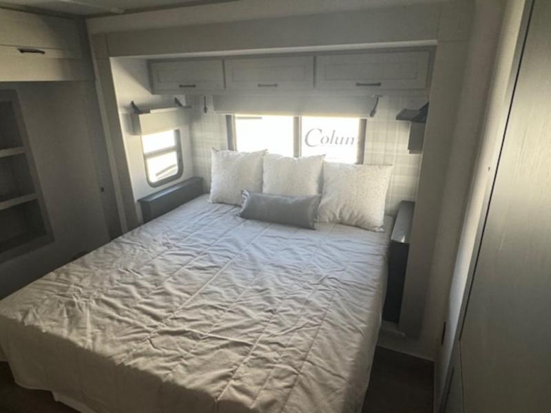 Experience a different camping life with residential furnishings and high end features in each one of these Palomino Columbus fifth wheels! The 101" wide body lets you walk around more throughout and the all-welded aluminum-frame superstructure has a snap-in ceiling molding to hold up through every adventure. Don't leave any of your gear behind either when you can easily store it in the climate controlled drop frame storage area. On the exterior, you'll find a heated utility convenience center, an outside sprayer to keep the dirt outside where it belongs, and magnetic compartment door holds to keep them from falling on you as you grab your items. Plus, there are some modern features that will really seal the deal like the Wi-Fi Booster with 4G LTE capability prep, upgraded true solid-surface countertops, power theater seating with USB charging, and a 260W solar panel for off-grid camping!