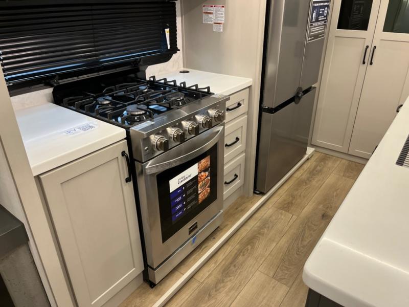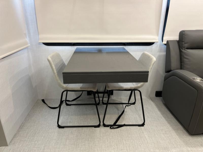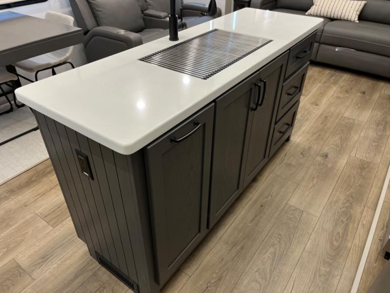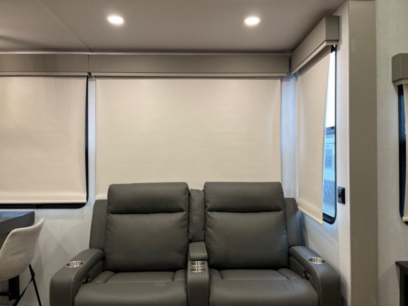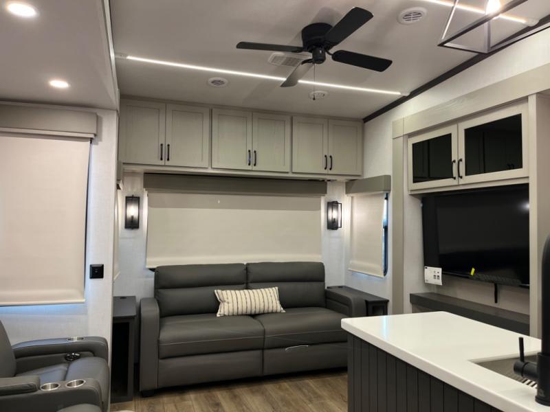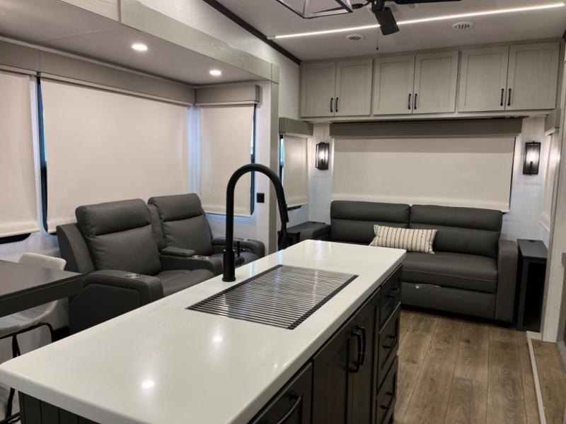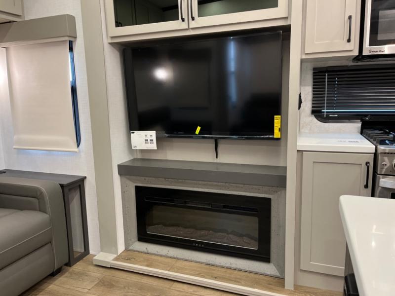 Everyone will stay clean with a bath and a half in this fifth wheel! The kitchen has a pantry big enough for everyone's favorite snacks, a four burner gas cooktop, and a kitchen island to prepare your best meals. You can have game night indoors at the table and chairs or set up a table and chairs underneath the two power awnings. The rear living area offers a comfortable place to watch the big game too with an sofa/sleeper and theater seating directly across from the entertainment center with a 50" Smart TV and fireplace. Two can get ready at once in the front bathroom featuring a vanity with dual sinks, and since there is washer and dryer prep, you have the option to make wash day easier!