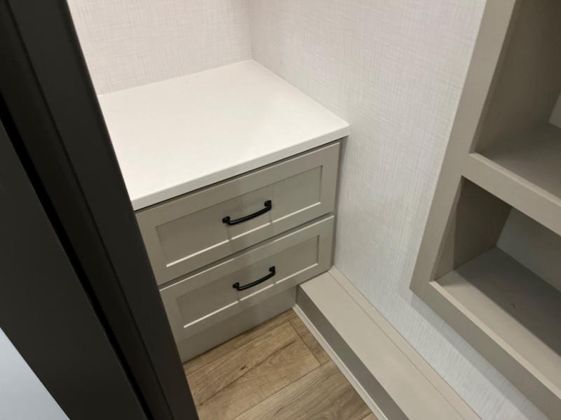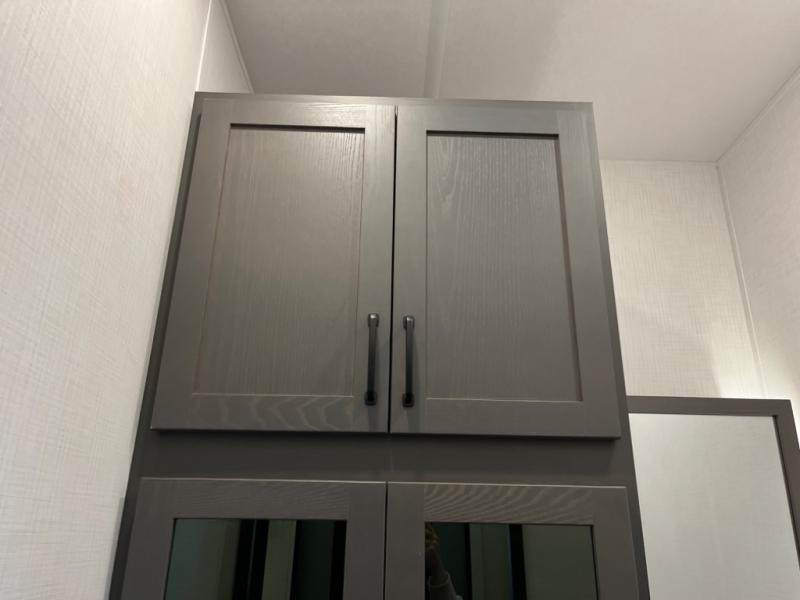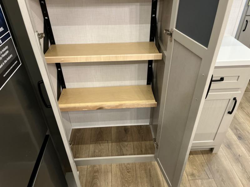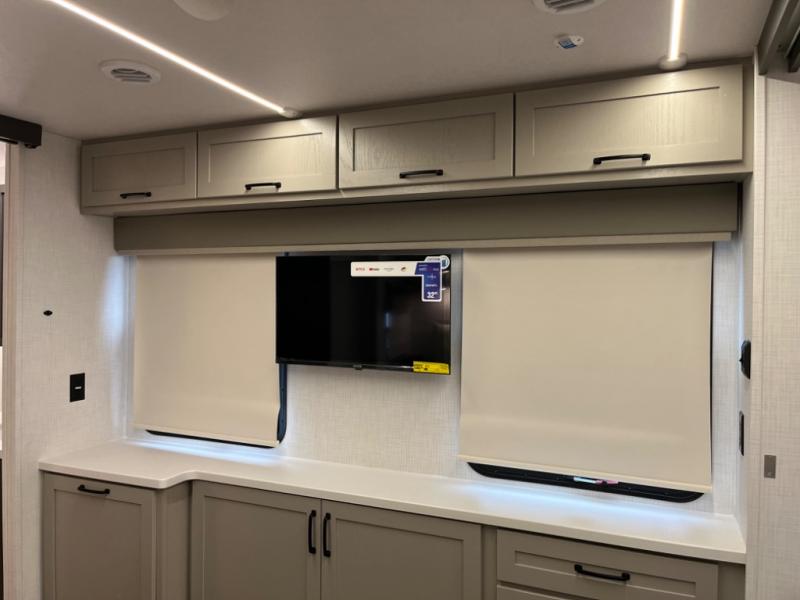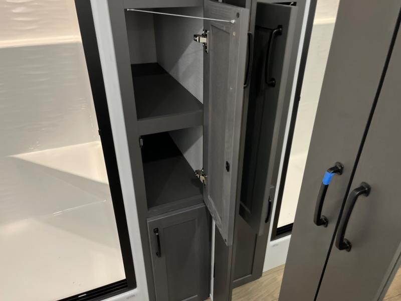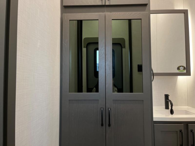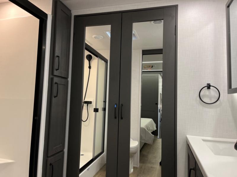 Everyone will stay clean with a bath and a half in this fifth wheel! The kitchen has a pantry big enough for everyone's favorite snacks, a four burner gas cooktop, and a kitchen island to prepare your best meals. You can have game night indoors at the table and chairs or set up a table and chairs underneath the two power awnings. The rear living area offers a comfortable place to watch the big game too with an sofa/sleeper and theater seating directly across from the entertainment center with a 50" Smart TV and fireplace. Two can get ready at once in the front bathroom featuring a vanity with dual sinks, and since there is washer and dryer prep, you have the option to make wash day easier!