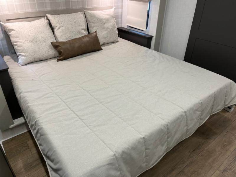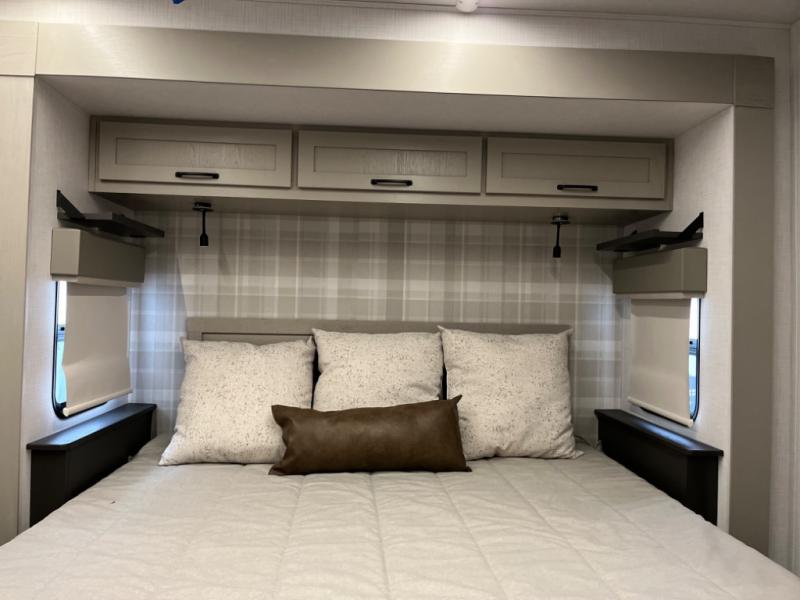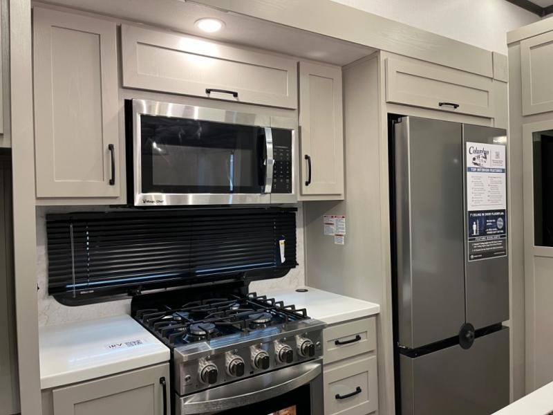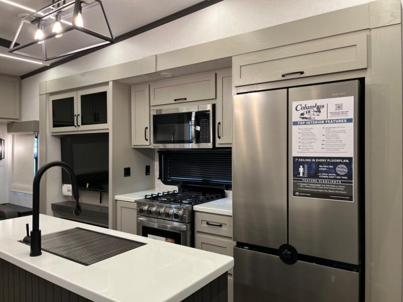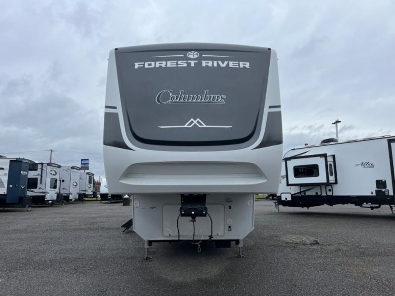 Experience a different camping life with residential furnishings and high end features in each one of these Palomino Columbus fifth wheels! The 101" wide body lets you walk around more throughout and the all-welded aluminum-frame superstructure has a snap-in ceiling molding to hold up through every adventure. Don't leave any of your gear behind either when you can easily store it in the climate controlled drop frame storage area. On the exterior, you'll find a heated utility convenience center, an outside sprayer to keep the dirt outside where it belongs, and magnetic compartment door holds to keep them from falling on you as you grab your items. Plus, there are some modern features that will really seal the deal like the Wi-Fi Booster with 4G LTE capability prep, upgraded true solid-surface countertops, power theater seating with USB charging, and a 260W solar panel for off-grid camping!