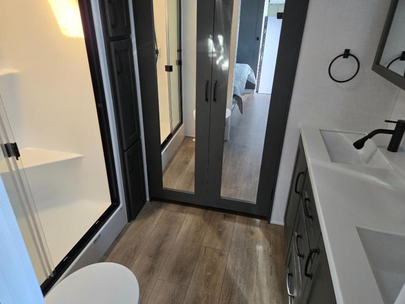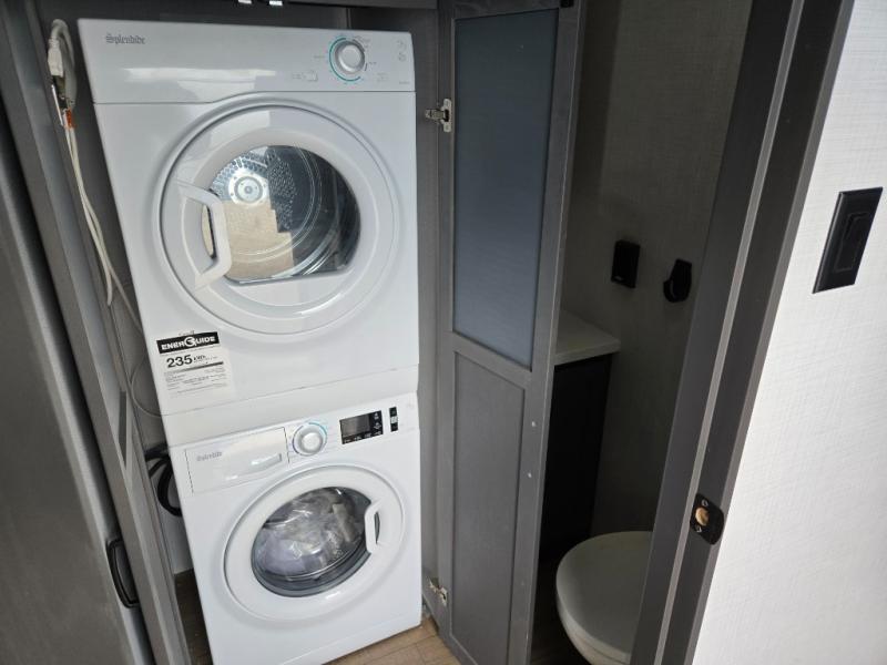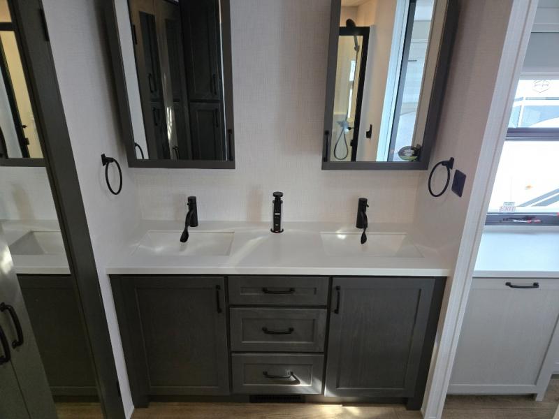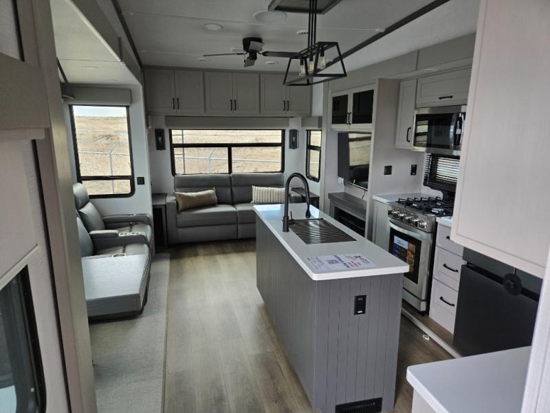 Everyone will stay clean with a bath and a half in this fifth wheel! The kitchen has a pantry big enough for everyone's favorite snacks, a four burner gas cooktop, and a kitchen island to prepare your best meals. You can have game night indoors at the table and chairs or set up a table and chairs underneath the two power awnings. The rear living area offers a comfortable place to watch the big game too with an sofa/sleeper and theater seating directly across from the entertainment center with a 50" Smart TV and fireplace. Two can get ready at once in the front bathroom featuring a vanity with dual sinks, and since there is washer and dryer prep, you have the option to make wash day easier!