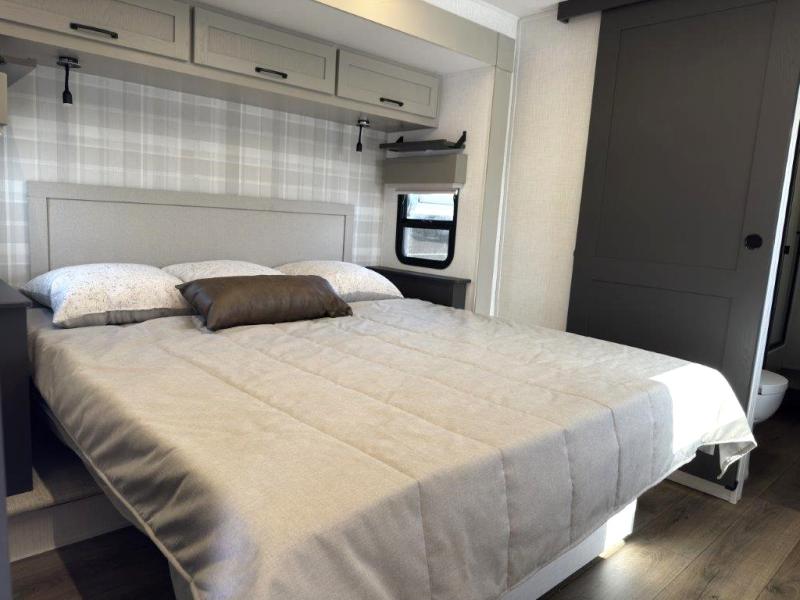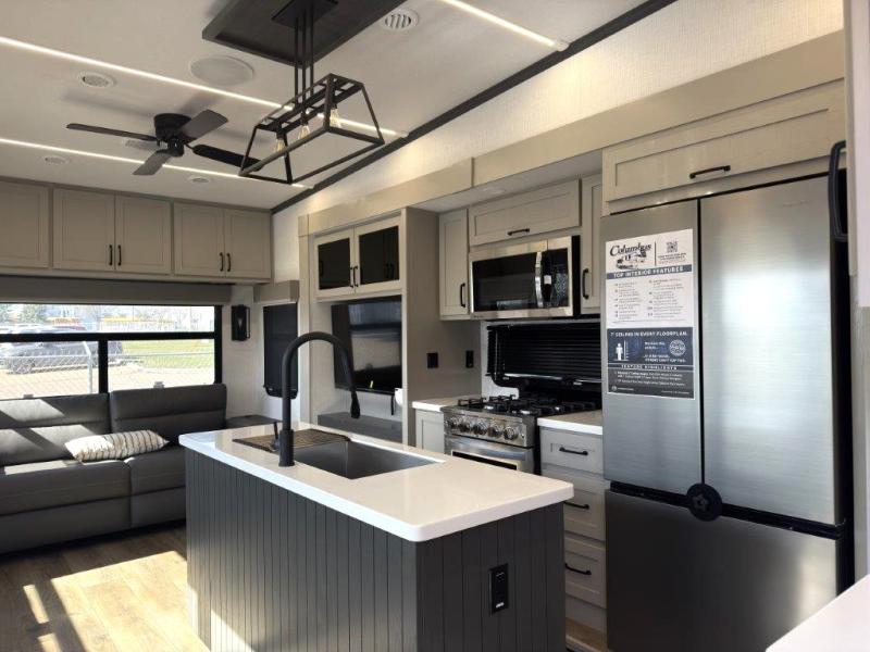 Experience a different camping life with residential furnishings and high end features in each one of these Palomino Columbus fifth wheels! The 101" wide body lets you walk around more throughout and the all-welded aluminum-frame superstructure has a snap-in ceiling molding to hold up through every adventure. Don't leave any of your gear behind either when you can easily store it in the climate controlled drop frame storage area. On the exterior, you'll find a heated utility convenience center, an outside sprayer to keep the dirt outside where it belongs, and magnetic compartment door holds to keep them from falling on you as you grab your items. Plus, there are some modern features that will really seal the deal like the Wi-Fi Booster with 4G LTE capability prep, upgraded true solid-surface countertops, power theater seating with USB charging, and a 260W solar panel for off-grid camping!